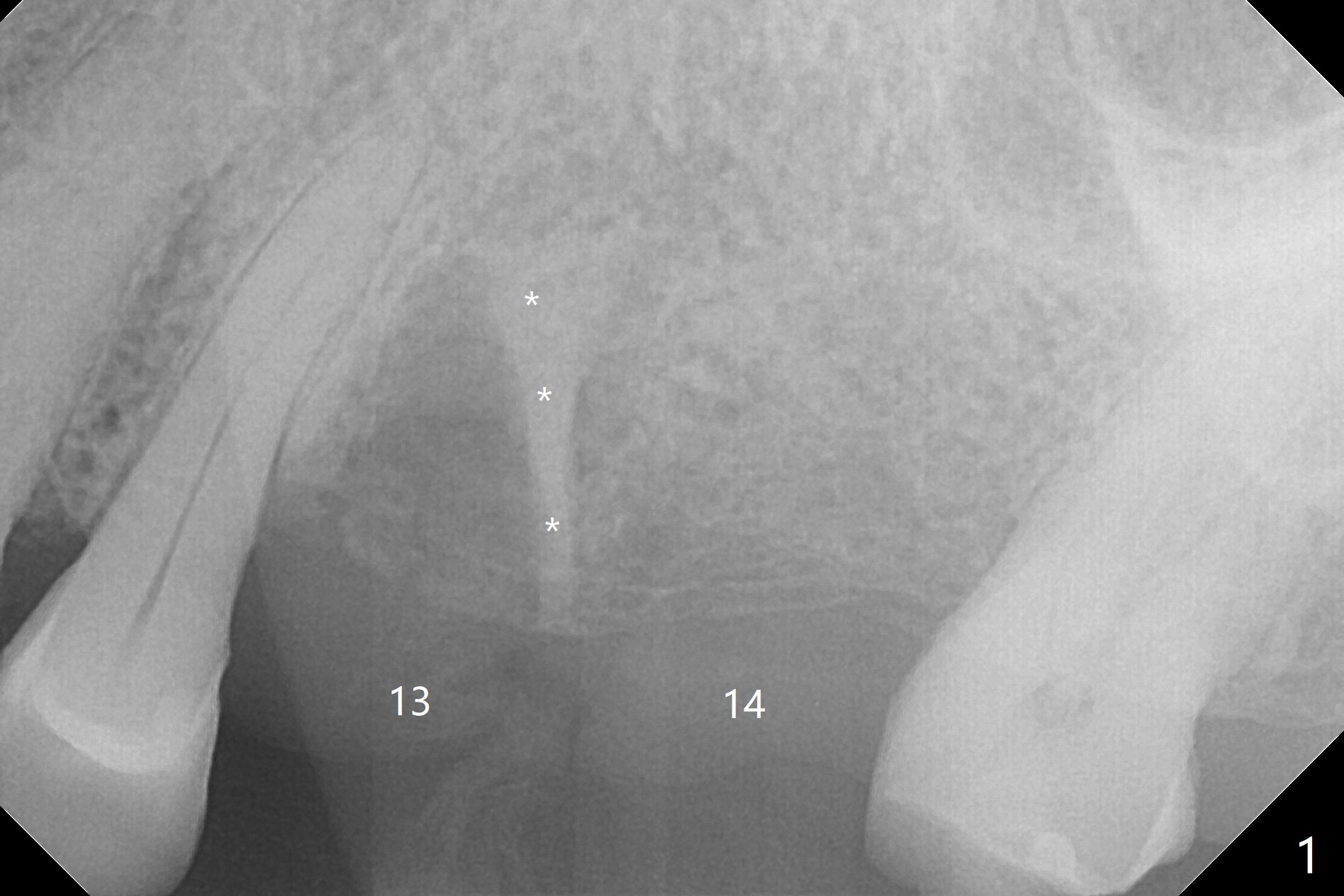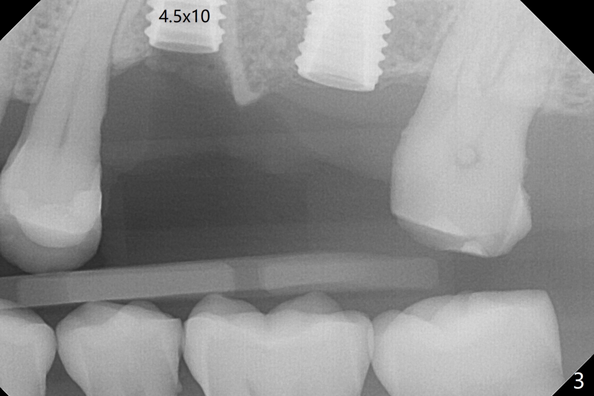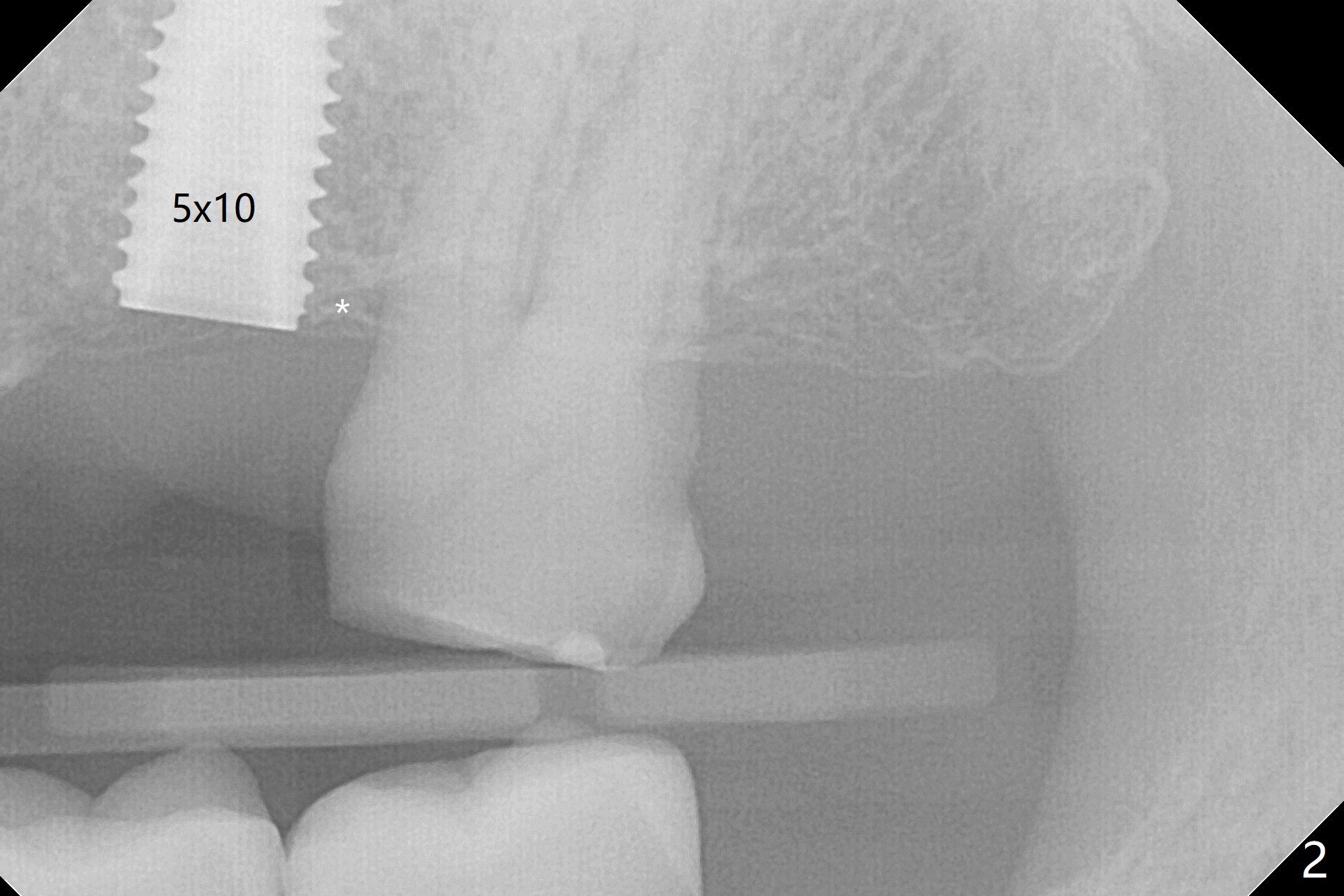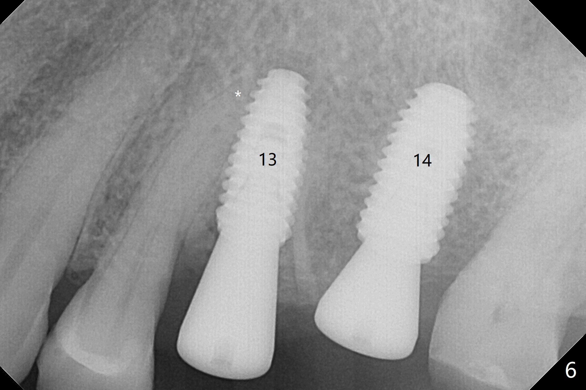 After extraction of the tooth #13 residual root, the bone in the distal wall of the socket looks white. Intraop PA rules out root structure (Fig.1 *). Osteotomy is conducted according to drill sequence. Bitewings are taken to check implant placement level (Fig.2,3). Following implant level adjustment and healing abutment installment (Fig.4,5 (*: bone graft)), the implant at #13 is found to be close the root of #12 (Fig.6 *), i.e., not parallel to the implant at #14. Introspectively, 2.2x10 mm drill seems to be long. When it touches the bone, the cylinder portion of the drill (Fig.7 red) does not engage into the sleeve (green). When it goes into the bone, it may have been deflected mesial due to the slope of the distal wall of the socket (hard bone, Fig.8 open arrow)). If a shorter drill (such as 2.2x7.3 or 8.5 mm) were used (Fig.9), the deflection would be minimal if drilling is slow (Fig.10). CT taken 1 week postop shows that the implant at #13 is approximately 1 mm near the root of the tooth #12, but the neurovascular bundle to the latter seems not to have been interrupted (Fig.11,12). The buccopalatal trajectory at #14 is within normal limit (Fig.11,13 (B: buccal)). There is no periapical radiolucency at #12 five months postop (Fig.14). However the cemented abutments are incompletely seated (<). The patient is reluctant to return for impression 17 months postop (due to coronavirus); with attention, the same abutment at #13 is reseated completely; an abutment with longer cuff and narrower diameter is also seated completely (Fig.15).
