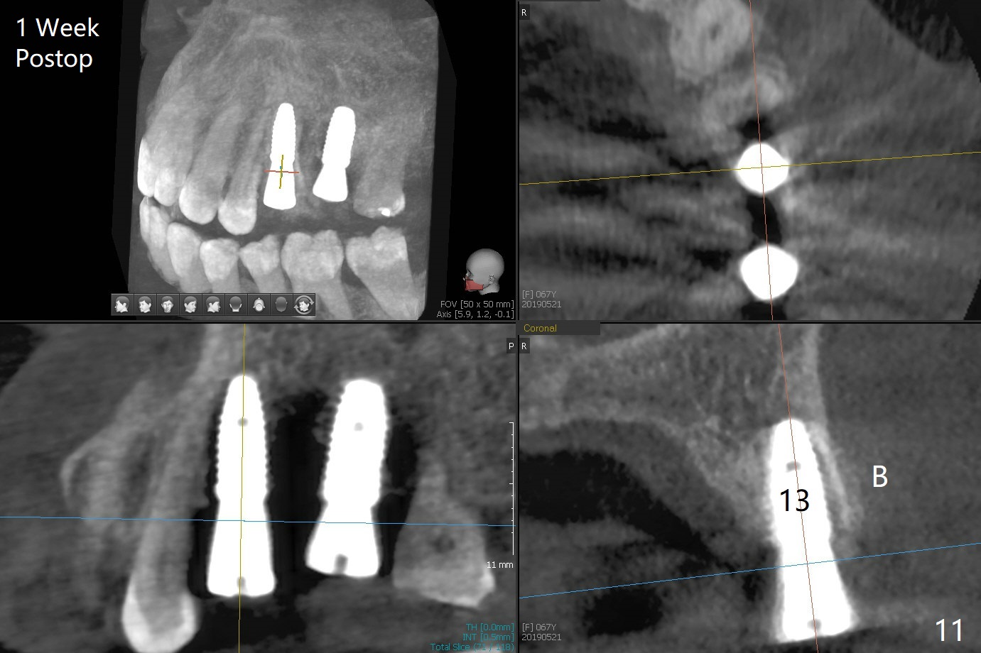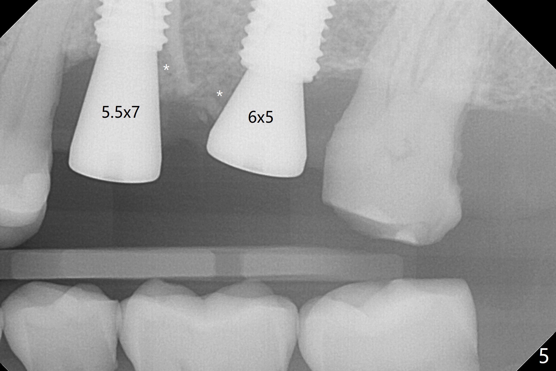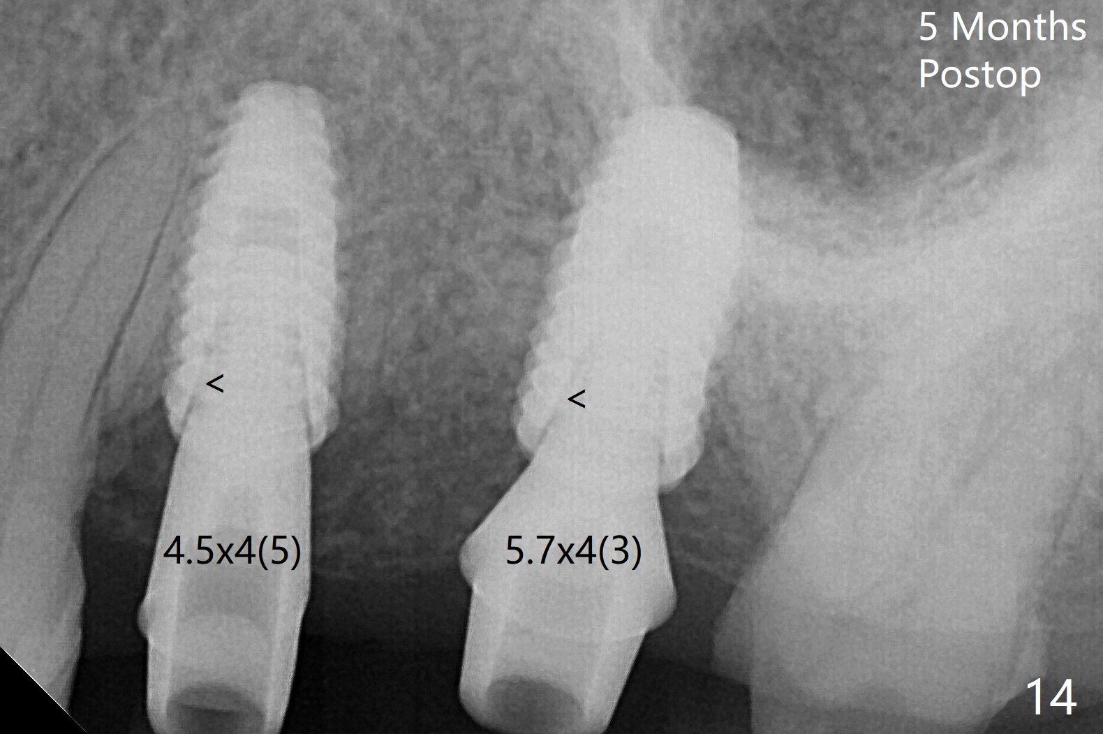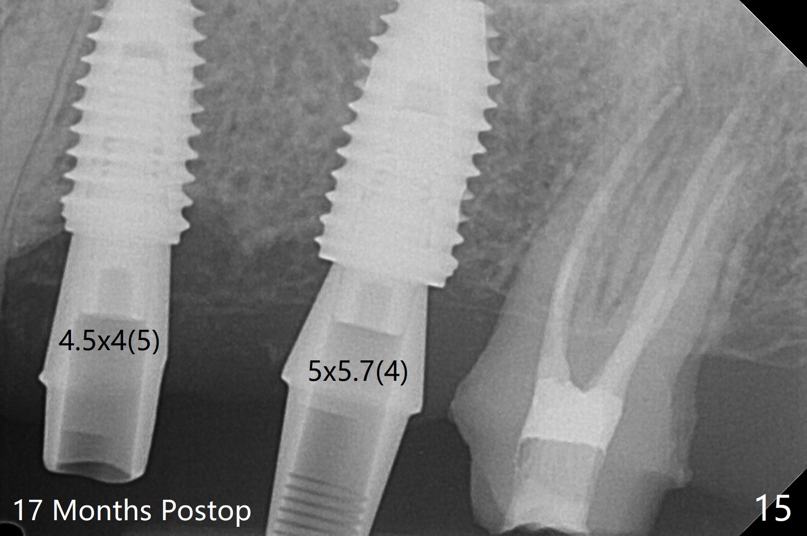 After extraction of the tooth #13 residual root, the bone in the distal wall of the socket looks white. Intraop PA rules out root structure (Fig.1 *). Osteotomy is conducted according to drill sequence. Bitewings are taken to check implant placement level (Fig.2,3). Following implant level adjustment and healing abutment installment (Fig.4,5 (*: bone graft)), the implant at #13 is found to be close the root of #12 (Fig.6 *), i.e., not parallel to the implant at #14. Introspectively, 2.2x10 mm drill seems to be long. When it touches the bone, the cylinder portion of the drill (Fig.7 red) does not engage into the sleeve (green). When it goes into the bone, it may have been deflected mesial due to the slope of the distal wall of the socket (hard bone, Fig.8 open arrow)). If a shorter drill (such as 2.2x7.3 or 8.5 mm) were used (Fig.9), the deflection would be minimal if drilling is slow (Fig.10). CT taken 1 week postop shows that the implant at #13 is approximately 1 mm near the root of the tooth #12, but the neurovascular bundle to the latter seems not to have been interrupted (Fig.11,12). The buccopalatal trajectory at #14 is within normal limit (Fig.11,13 (B: buccal)). There is no periapical radiolucency at #12 five months postop (Fig.14). However the cemented abutments are incompletely seated (<). The patient is reluctant to return for impression 17 months postop (due to coronavirus); with attention, the same abutment at #13 is reseated completely; an abutment with longer cuff and narrower diameter is also seated completely (Fig.15).