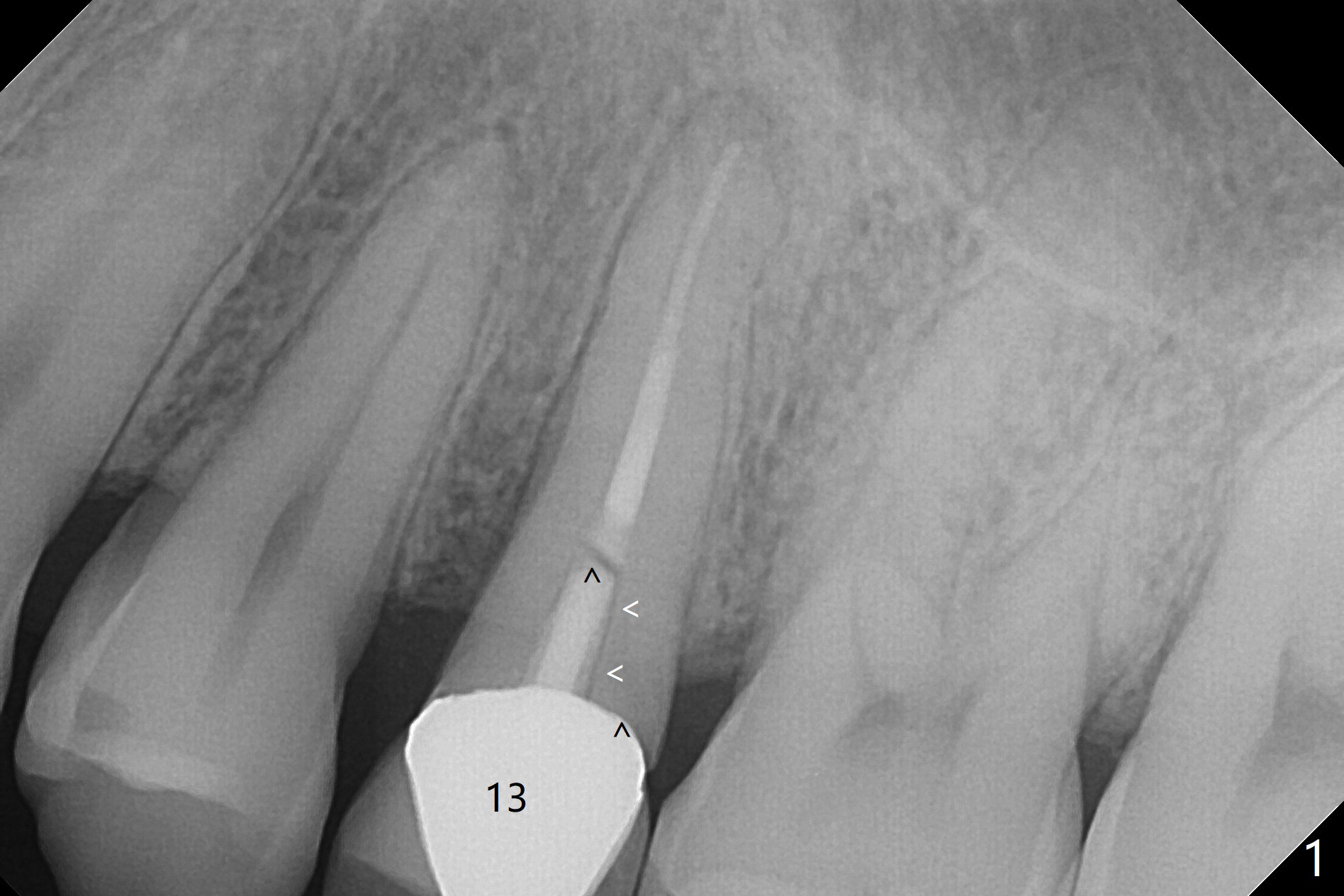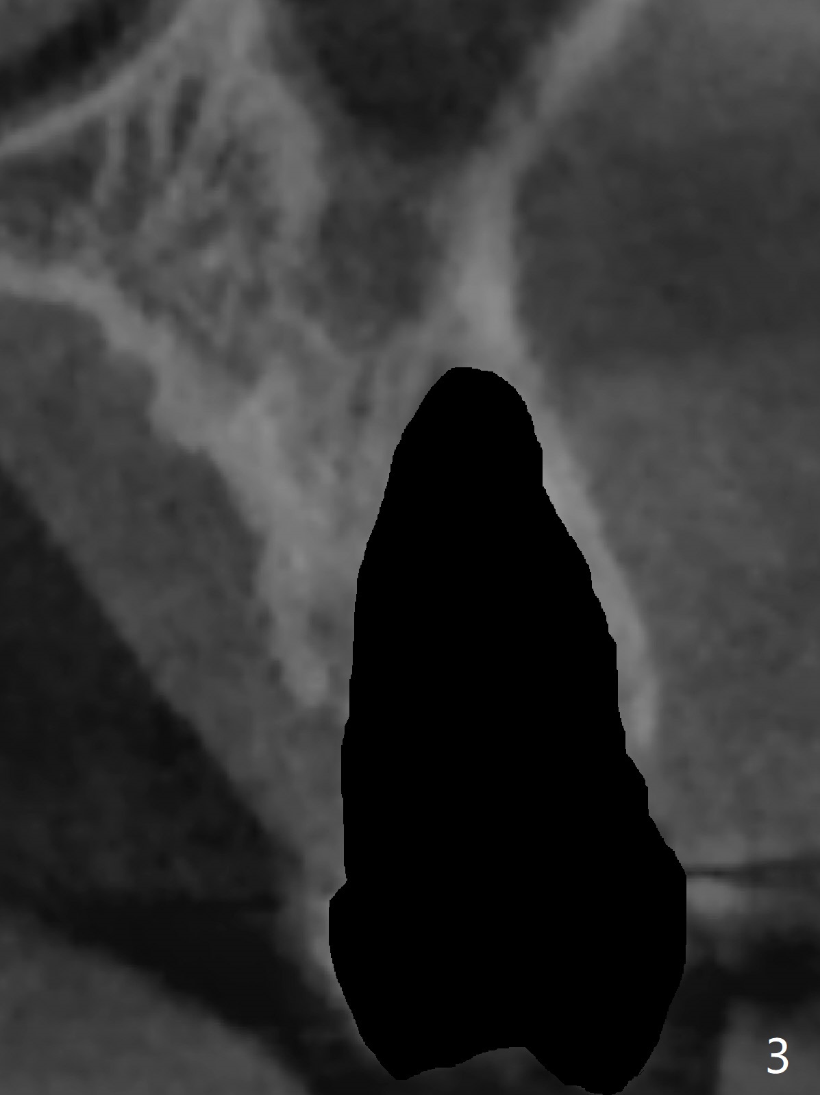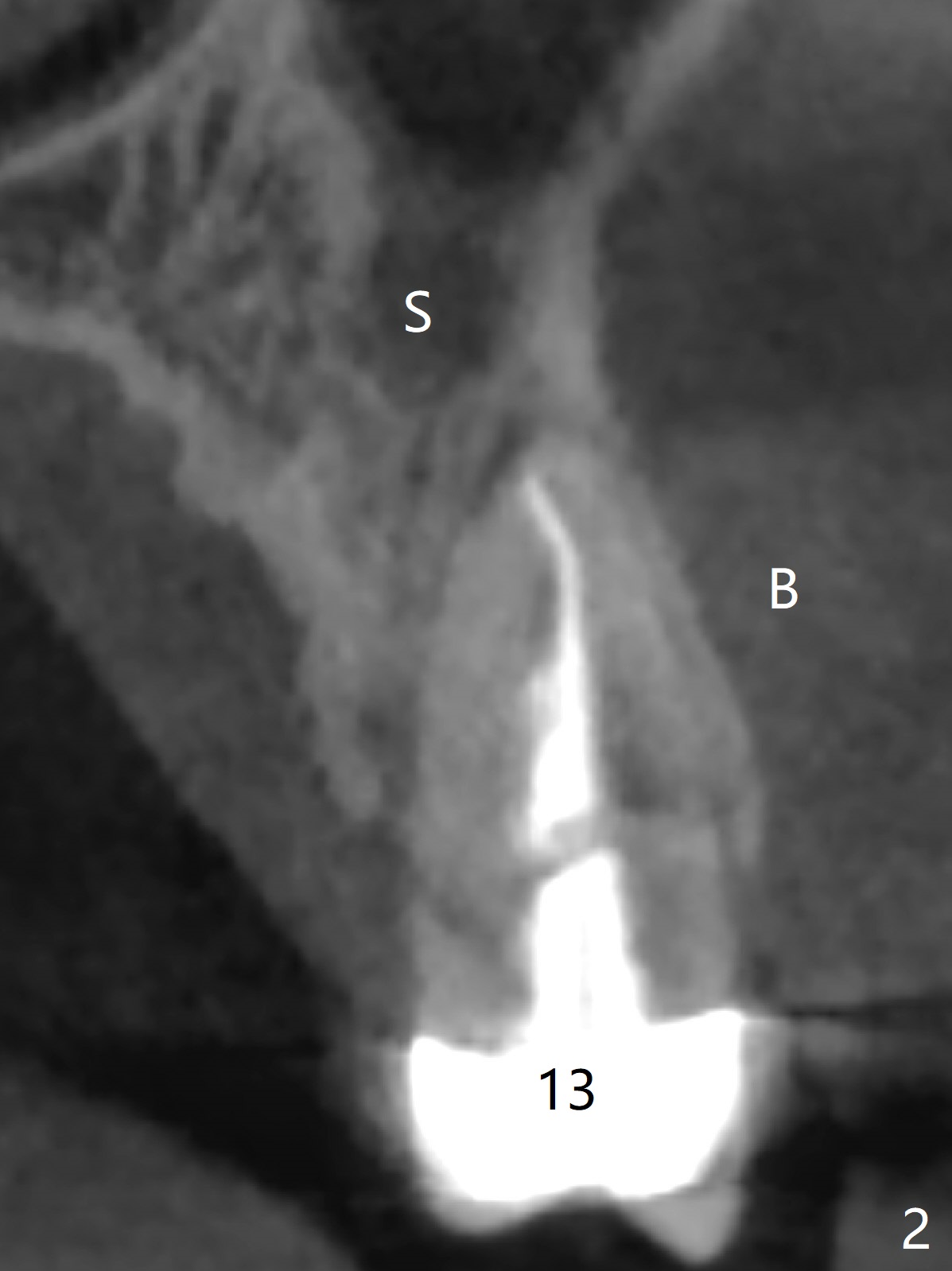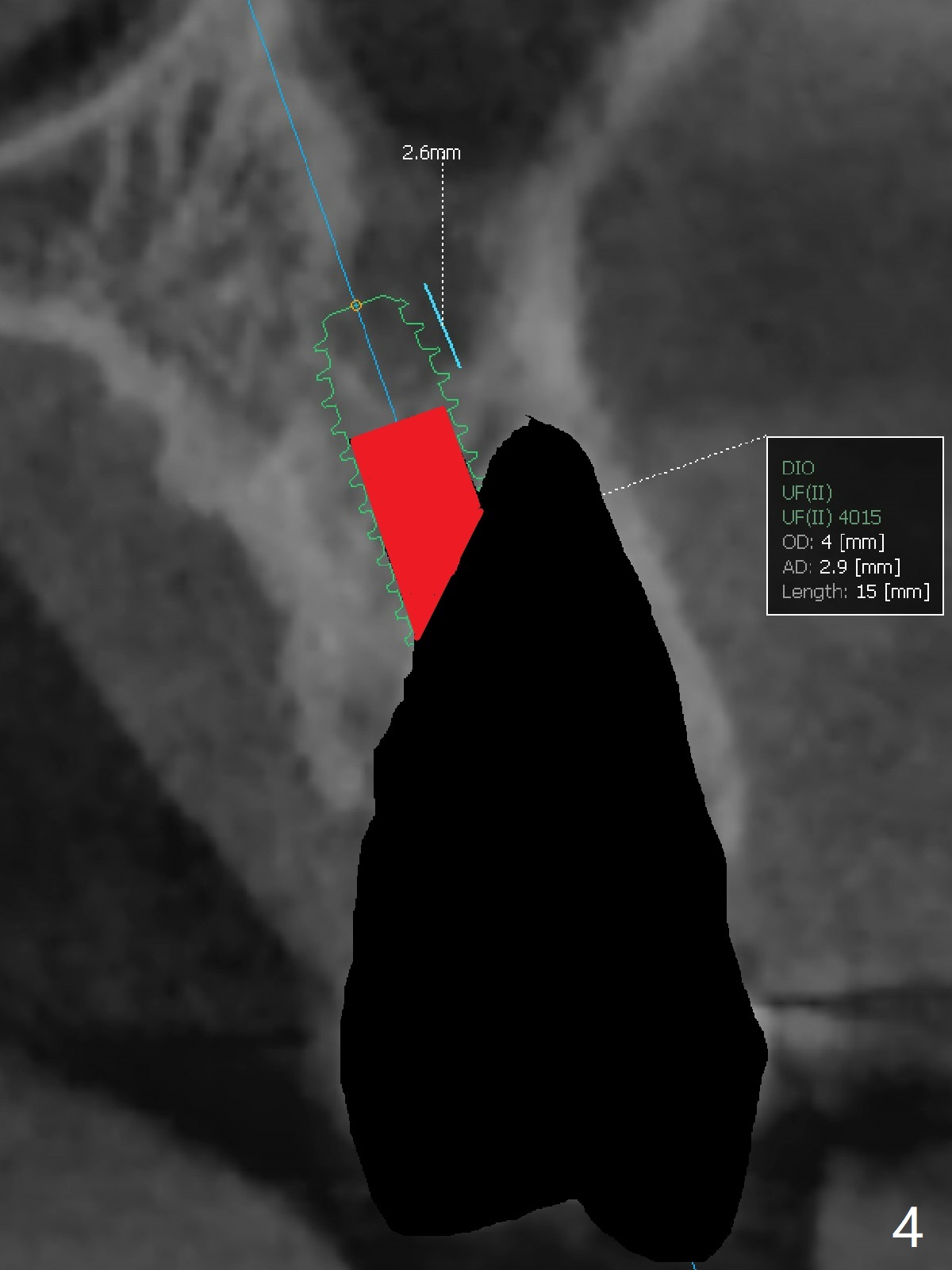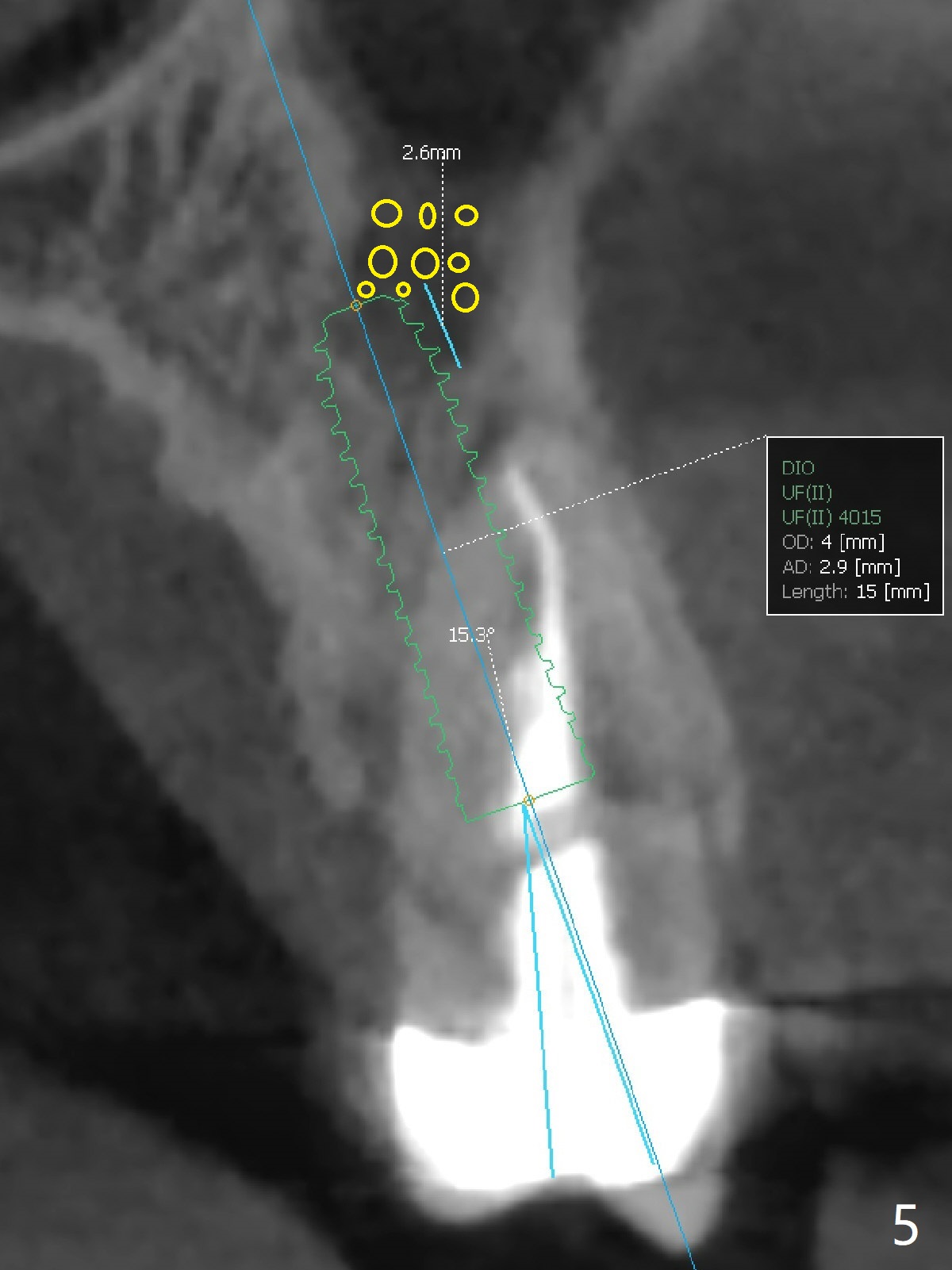 A 56-year-old man returns with chief complaint of a loose upper left tooth. Exam reveals fractured root (Fig.1 arrowheads). The apex is close to the sinus (Fig.2 (CT coronal section) S (B: buccal)). After extraction (Fig.3), start initial coronal osteotomy with a guide (Fig.4 red), ~ 1 mm from the sinus floor. Following sinus lift, PRF and bone graft (Fig.5 yellow circles), finish apical osteotomy and place a 4x15 mm implant (Fig.5,6). An angled abutment is expected (15 degree, Fig.5).