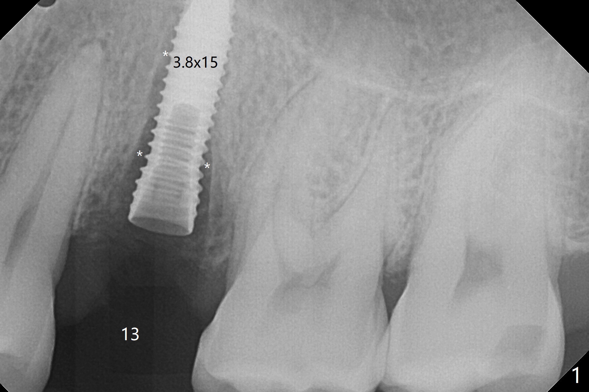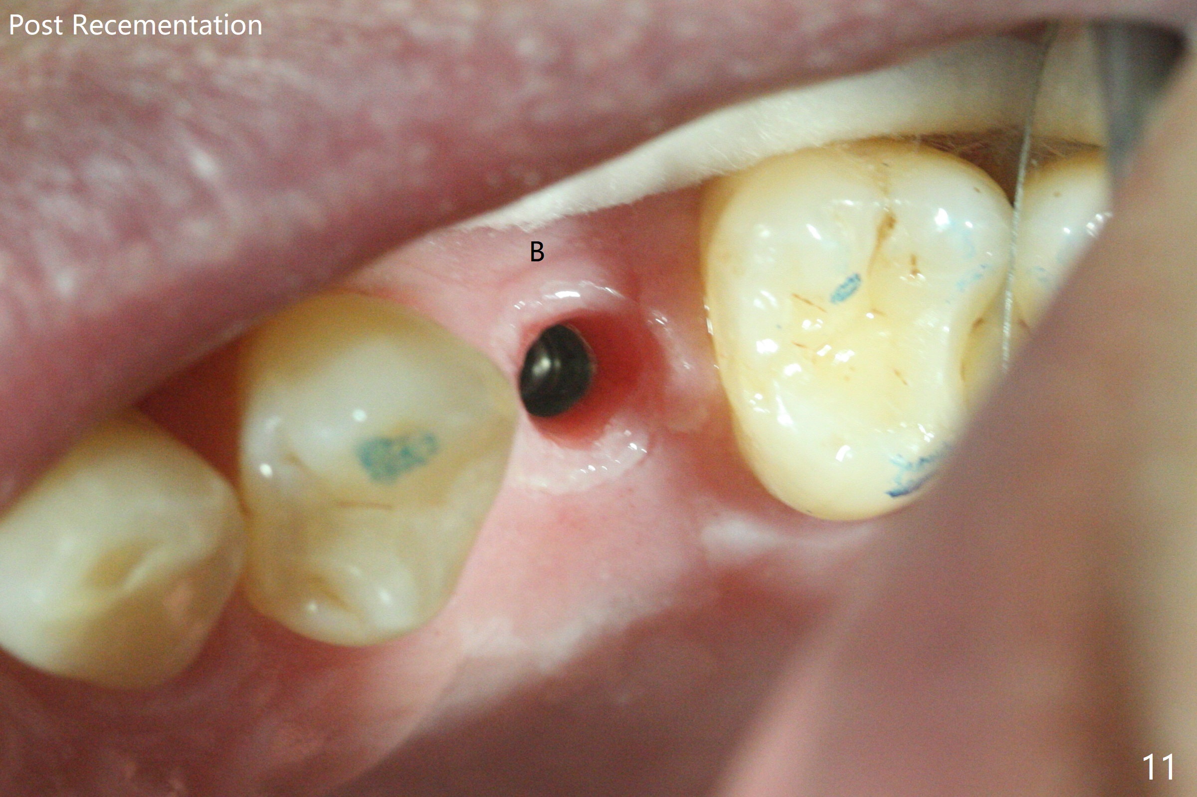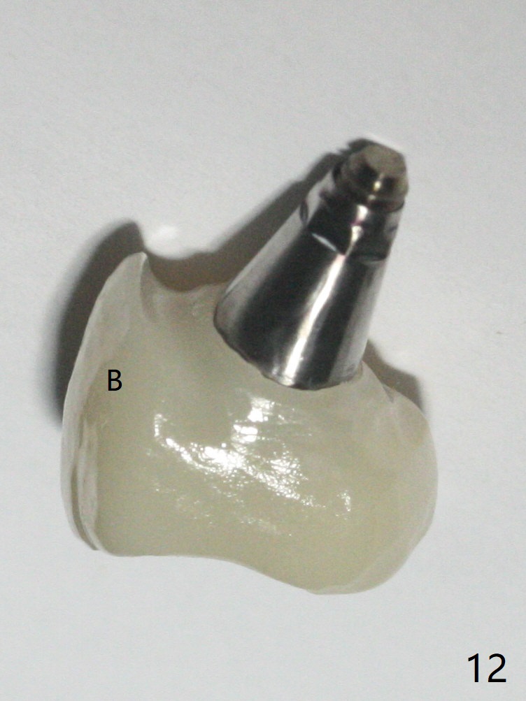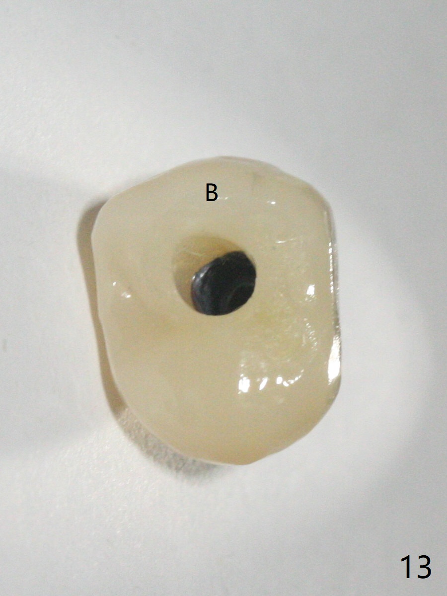 DIO lab refuses fabricating guide because of the large socket and recommends extraction and socket preservation at #13. Due to short apical bone (Fig.5,7), a long dummy implant (3.8x15 mm) is placed with periimplant space immediately post extraction (Fig.1 *). The final implant is larger (4.5x15 mm) with simultaneous sinus lift and periimplant bone graft (Fig.2,6,8 *). To repair the palatal crest defect (Fig.3 *) associated with tooth fracture (Fig.5 white dashed line), the implant is not placed too palatal with sufficient amount of the bone graft (Fig.4,6 *). The native bone (higher in bone density, Fig.9 white arrowheads, as compared to black one (for bone graft)) appears to have grown into the space between implant threads 5.5 months postop. The permanent crown/abutment is loose 1 year 9 months post cementation; after proximal reduction (Fig.10 arrowheads), the abutment is reseated completely. Pick up impression is taken and a healing abutment is placed. A few days later, the crown and abutment (separate) are seated passively; the abutment screw is retightened; the crown is re-cemented. The crown and abutment is removed for residual cement removal (Fig.11). Since there is mild buccal plate atrophy (Fig.11 B), the crown has a buccal lip (Fig.12 B) to prevent food impaction. The lip makes it difficult to remove residual cement intraorally. Therefore an access hole is necessary (Fig.13).