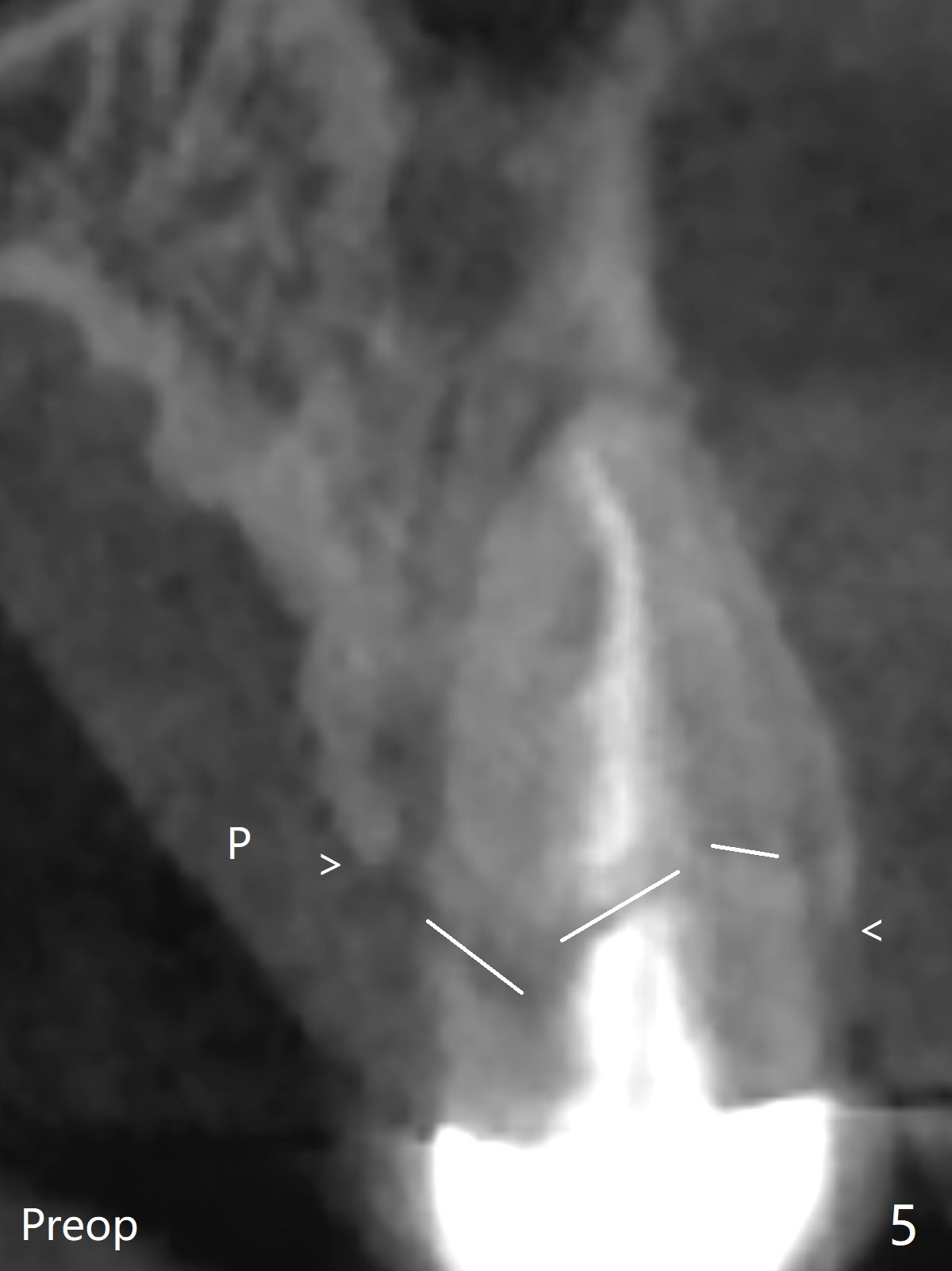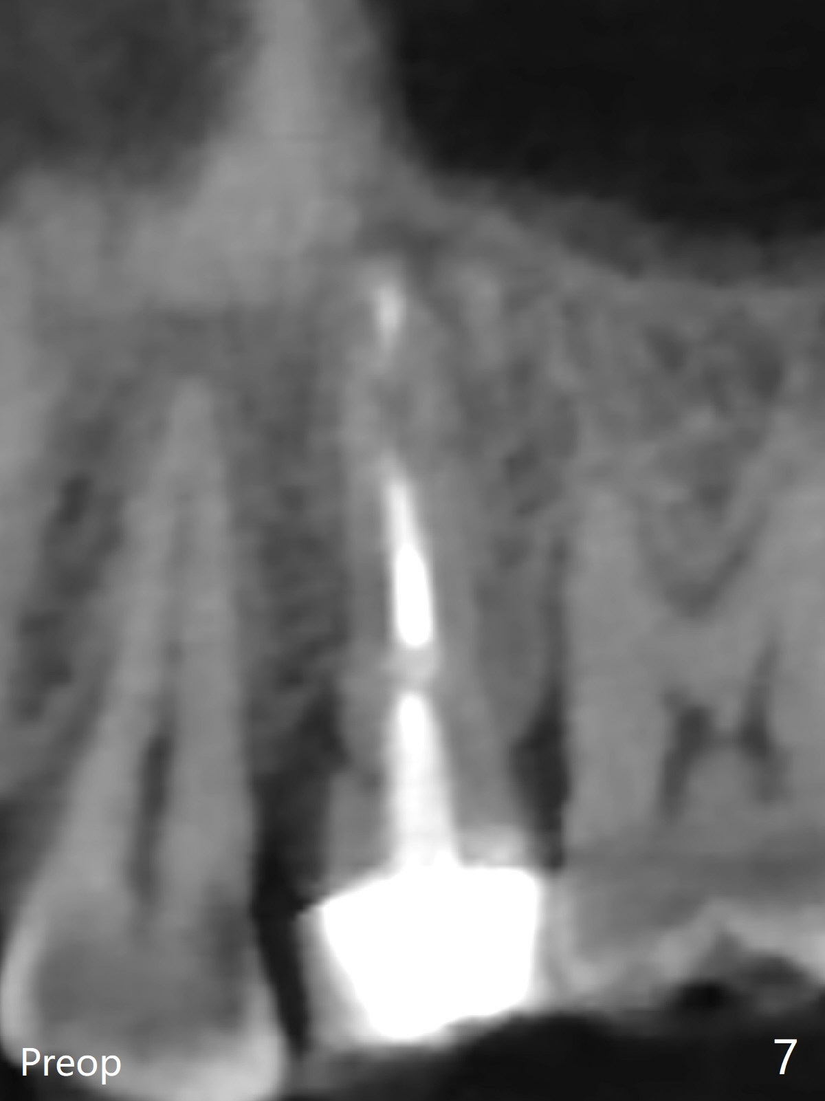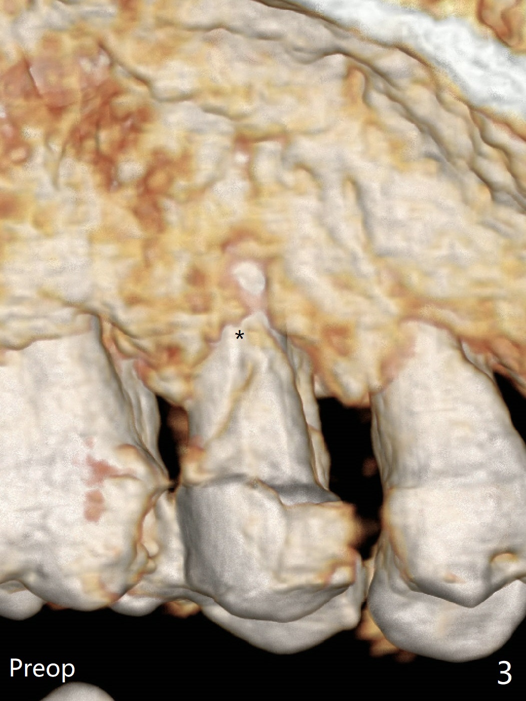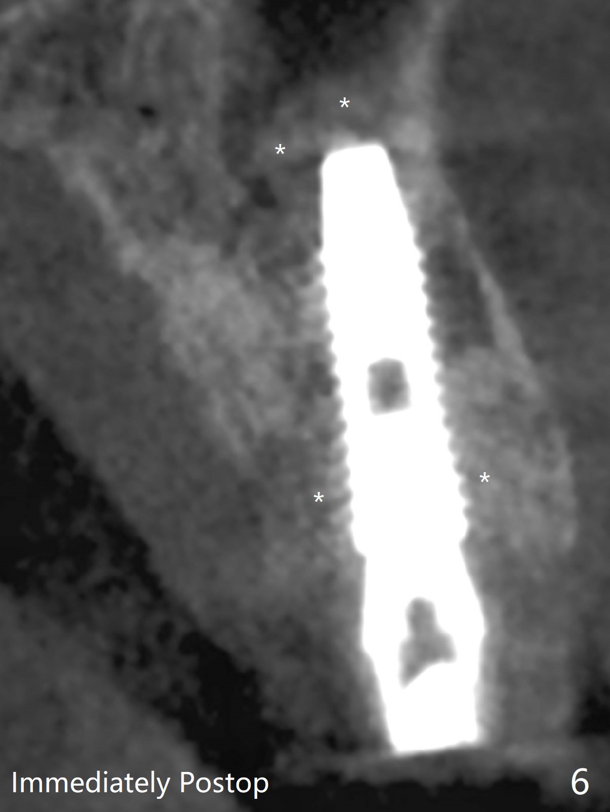 DIO lab refuses fabricating guide because of the large socket and recommends extraction and socket preservation at #13. Due to short apical bone (Fig.5,7), a long dummy implant (3.8x15 mm) is placed with periimplant space immediately post extraction (Fig.1 *). The final implant is larger (4.5x15 mm) with simultaneous sinus lift and periimplant bone graft (Fig.2,6,8 *). To repair the palatal crest defect (Fig.3 *) associated with tooth fracture (Fig.5 white dashed line), the implant is not placed too palatal with sufficient amount of the bone graft (Fig.4,6 *). The native bone (higher in bone density, Fig.9 white arrowheads, as compared to black one (for bone graft)) appears to have grown into the space between implant threads 5.5 months postop. The permanent crown/abutment is loose 1 year 9 months post cementation; after proximal reduction (Fig.10 arrowheads), the abutment is reseated completely. Pick up impression is taken and a healing abutment is placed. A few days later, the crown and abutment (separate) are seated passively; the abutment screw is retightened; the crown is re-cemented. The crown and abutment is removed for residual cement removal (Fig.11). Since there is mild buccal plate atrophy (Fig.11 B), the crown has a buccal lip (Fig.12 B) to prevent food impaction. The lip makes it difficult to remove residual cement intraorally. Therefore an access hole is necessary (Fig.13).