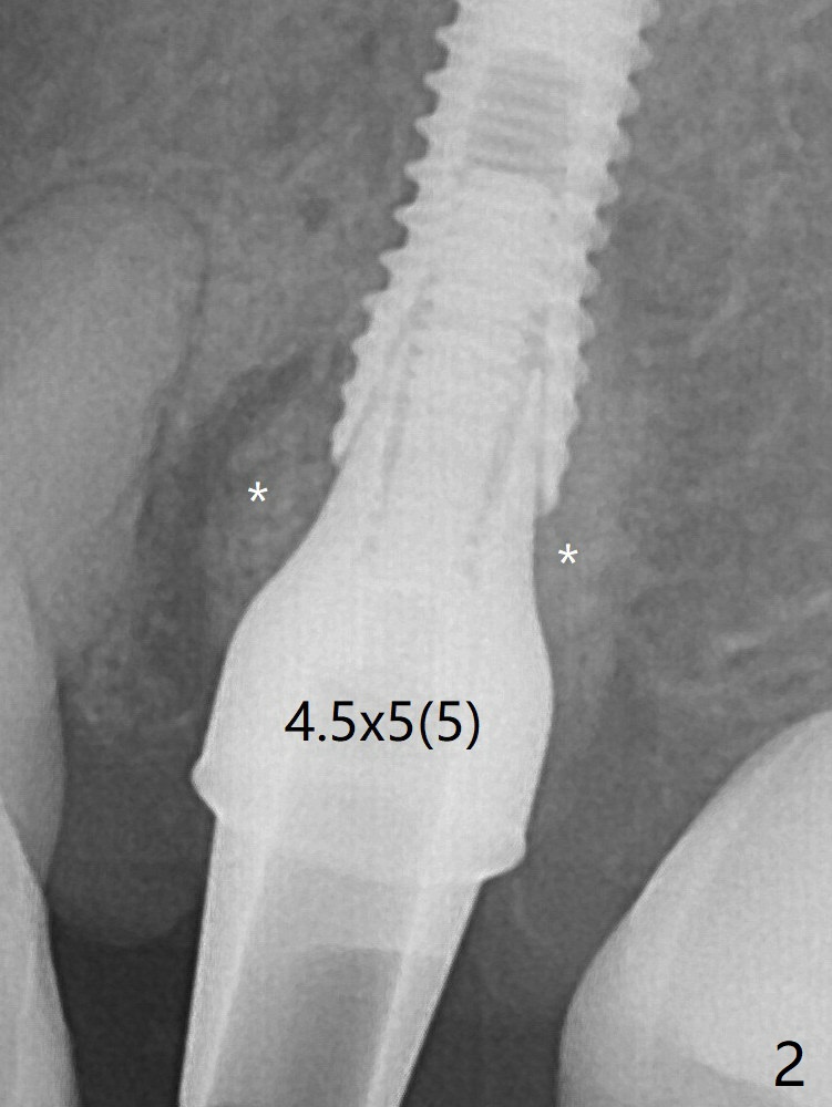 In spite of underprep osteotomy, a 3.8x18 mm implant achieves ~ 20 Ncm of insertion torque (Fig.2). When a 4.5x5(5) mm abutment is placed, it is buccal. It appears that an angled abutment is needed for final restoration (probably 4.5x15 or 25 degrees, 5 mm cuff). * Vanilla/Osteogen. The implant becomes stable 5 months postop (Fig.4), but the buccal gingiva is erythematous and tender, probably due to infected bone graft, which is removed.