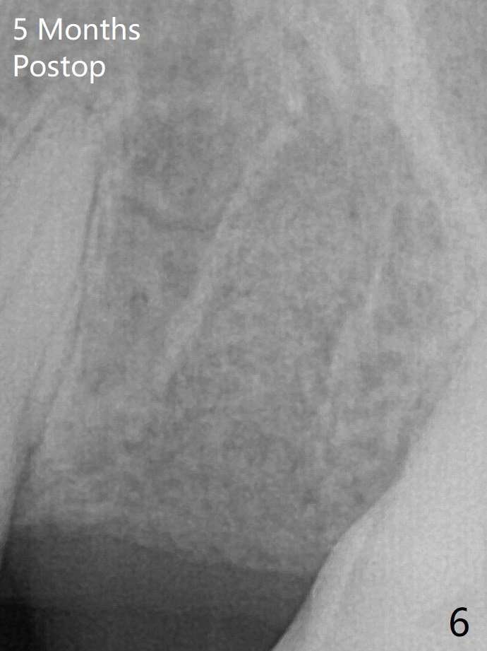 The coronal lamina dura becomes indistinct 5 months postop (Fig.6). The bone graft remains in the socket. There appears no bone graft loss. Great? Ready for implant placement? What is the next step?