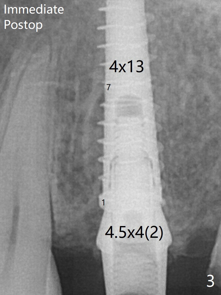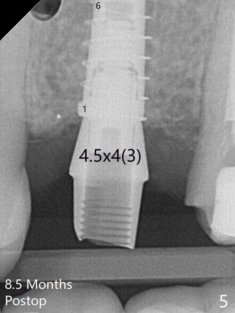 There is a gap mesial to the implant between the 1st and 7th threads immediate postop (Fig.3). The gap is absent between 1st and 6th threads 8.5 months postop (Fig.5) with formation of the dense crestal bone.