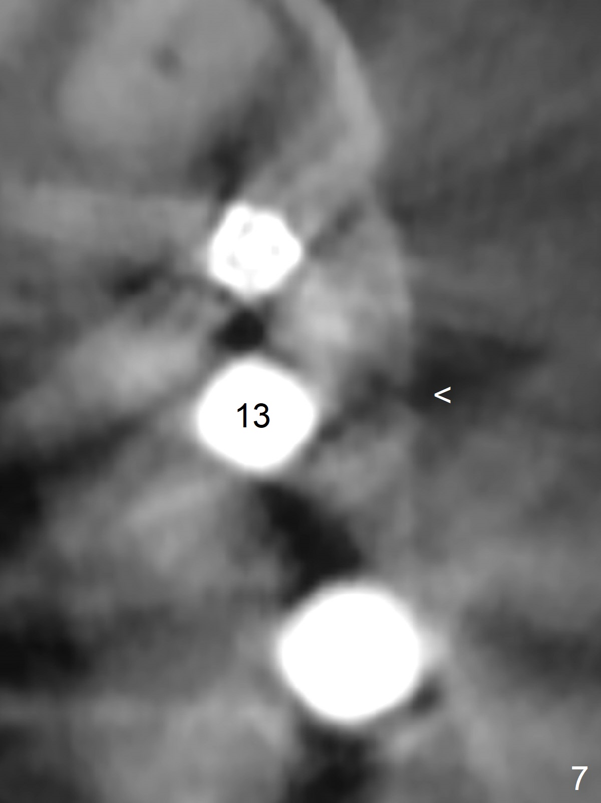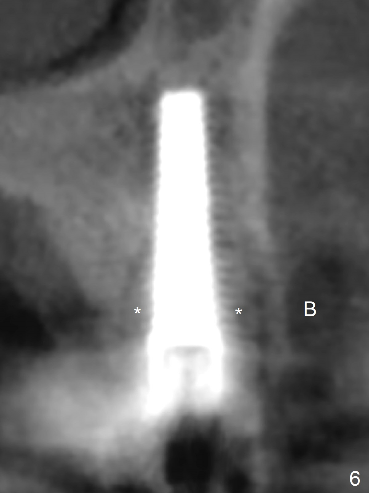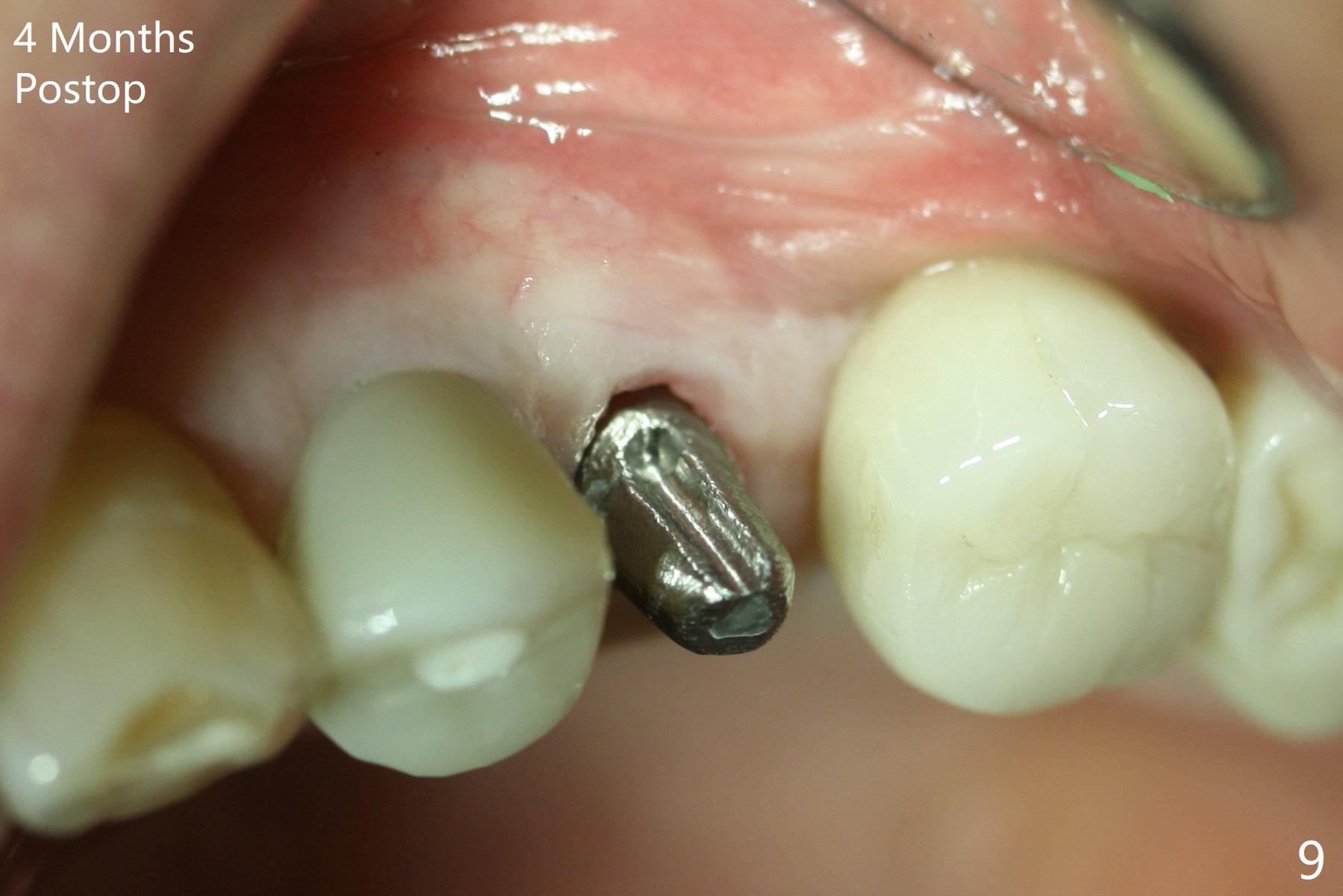 When the tooth #13 with buccal fistula is extracted, the root is found to have vertical fracture (Fig.1). The socket is 14 mm deep (gingival level); the initial osteotomy depth is 20 mm (6 mm to be in the native bone for primary stability, Fig.2). A 4.5x20 mm tissue-level implant (>60 Ncm) is going to be placed in the palatal aspect of the oval socket (Fig.3-5). The localized defect in the buccal plate as indicated by labels (* (Vanilla/Osteogen), B (buccal) and < (perforation) in Fig.6,7 (CBCT coronal and axial sections) is repaired by the bone graft. The bone and gingiva are healthy around the implant nearly 4 months postop (Fig.8,9).