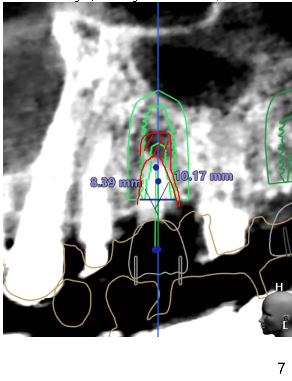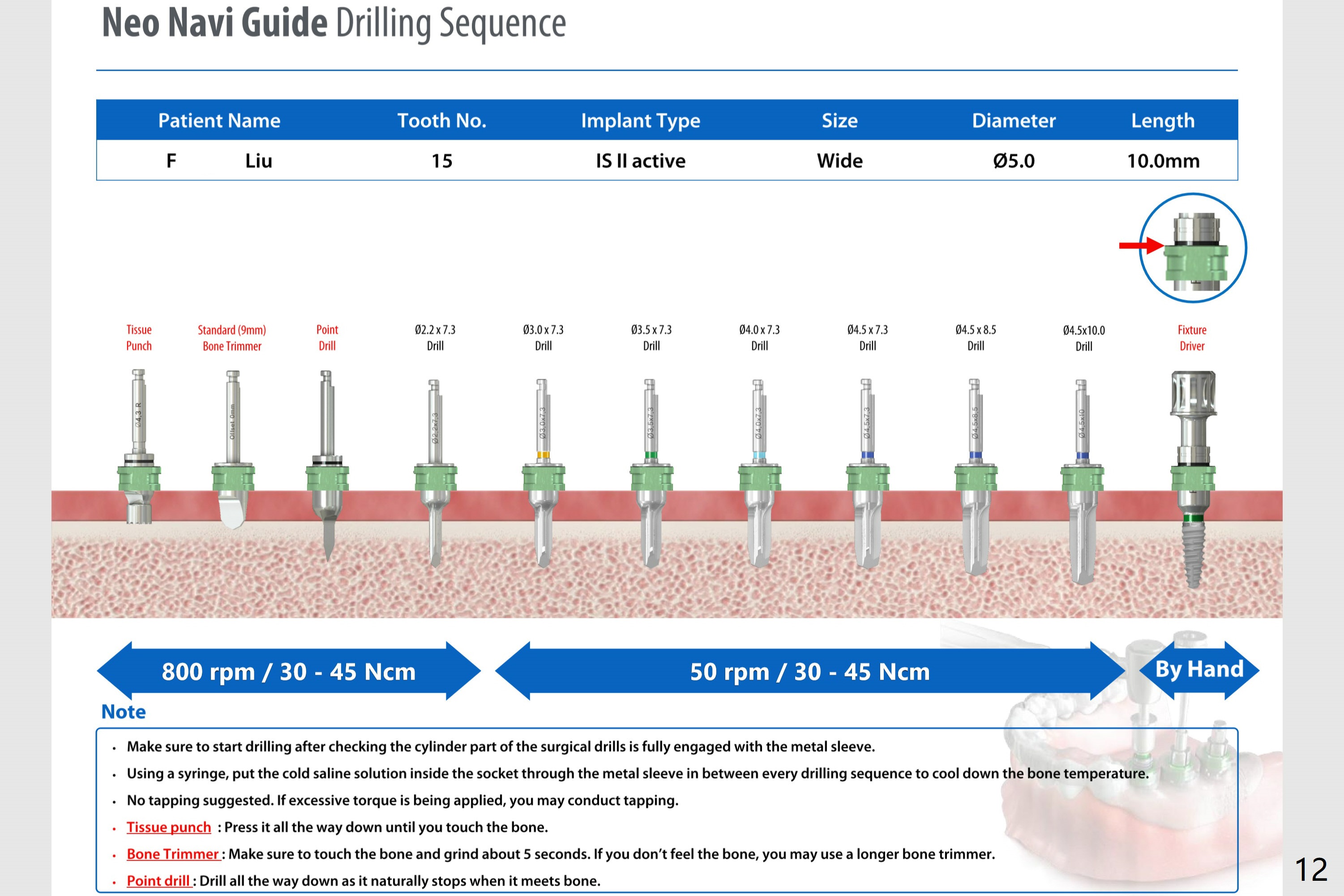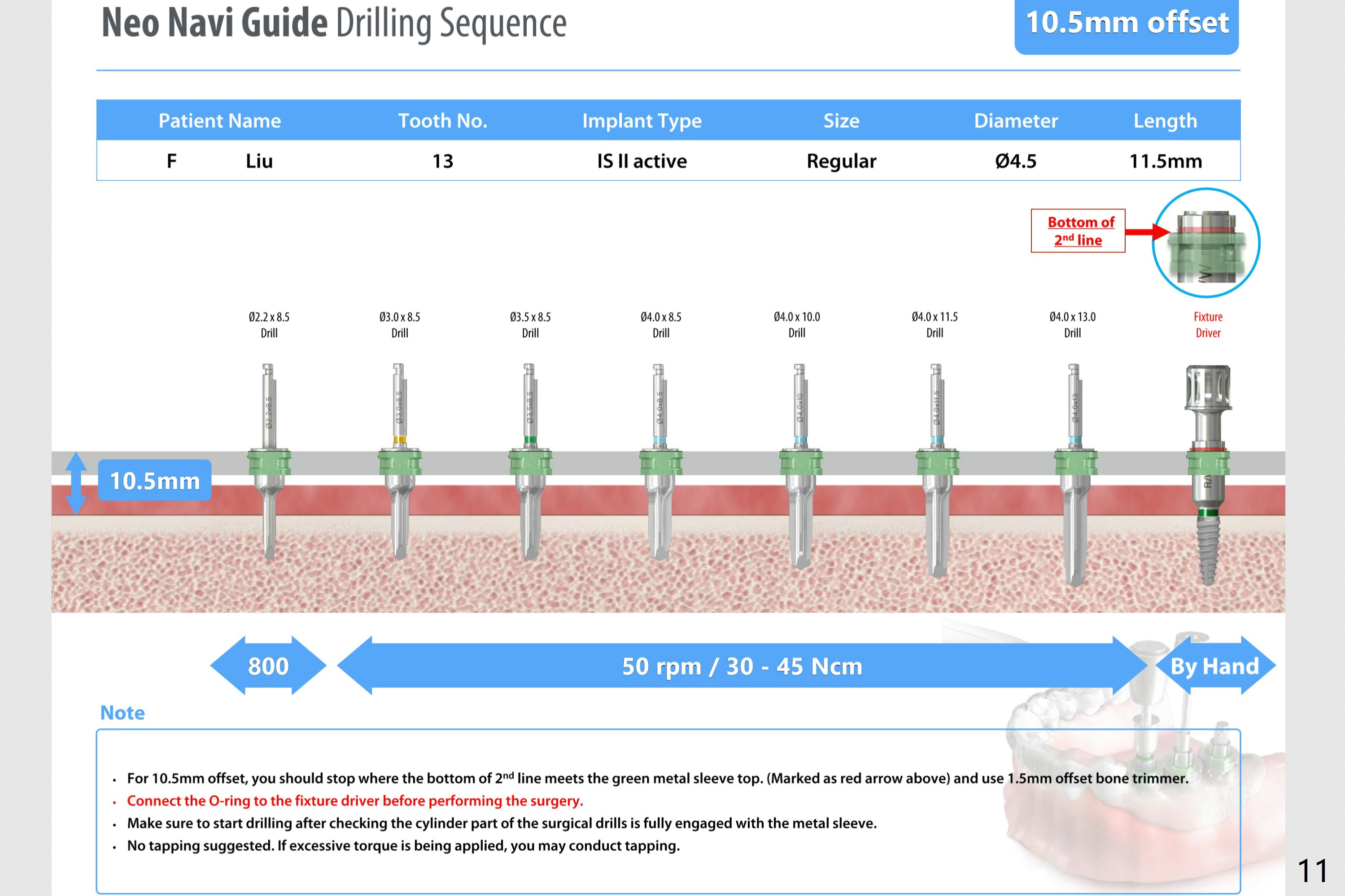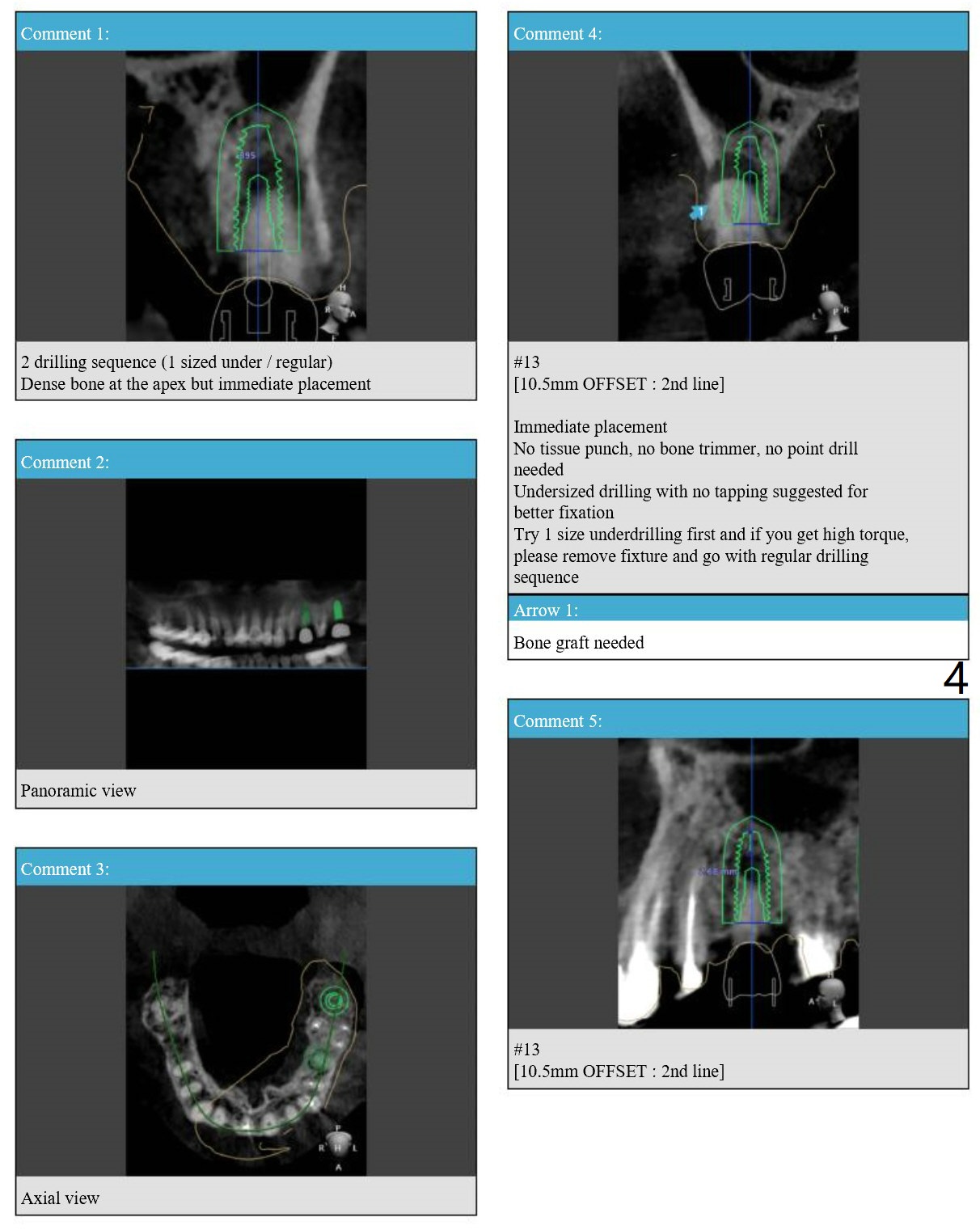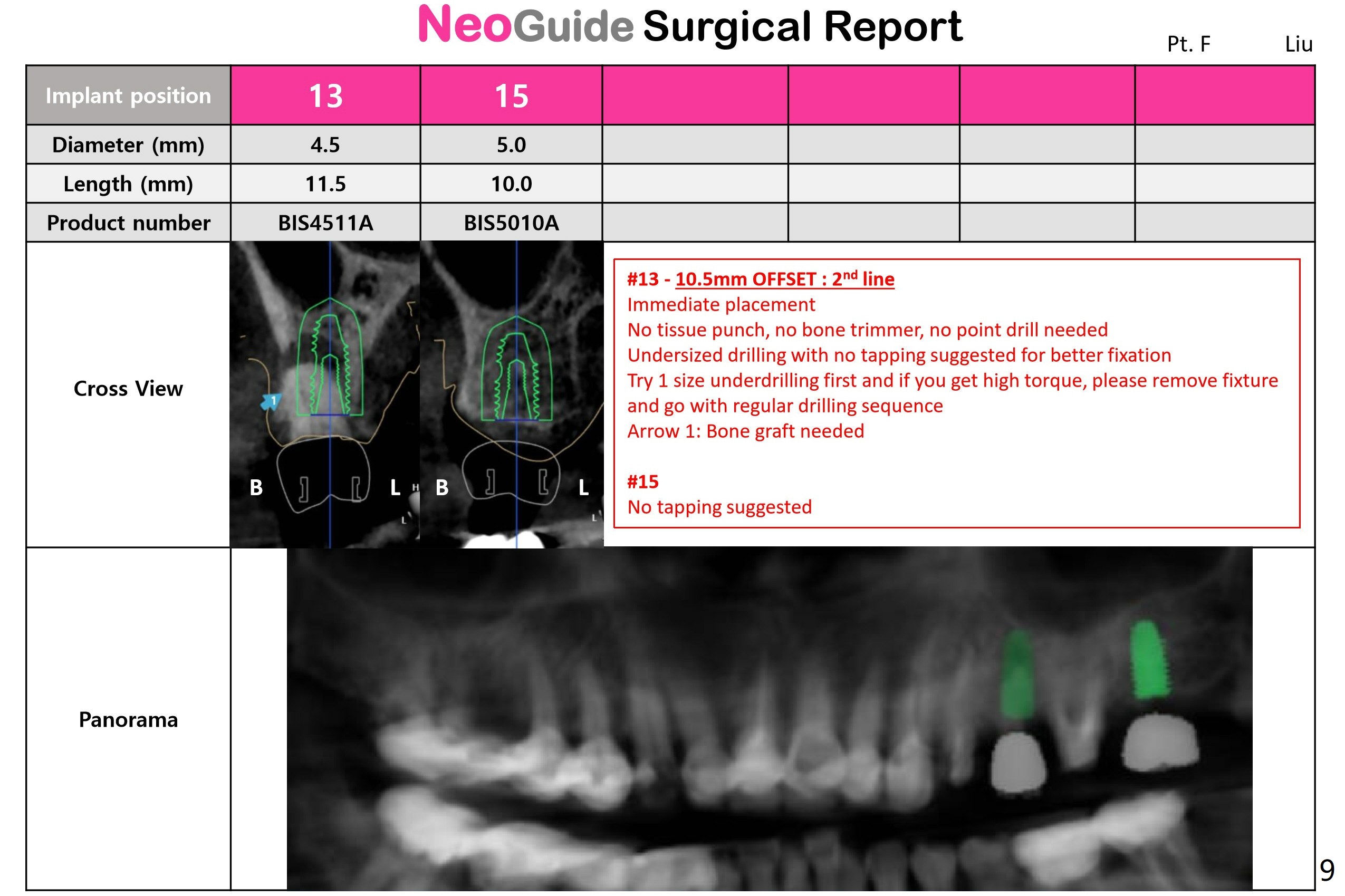 To avoid drills or implants (particularly immediate one) touching the neighboring root, 2.2 mm drill will reach the depth (sequentially) first and take segmental panoramic X-ray. Prepare sticky bone to increase primary stability by inserting it into the space of the socket at #13 mesiobuccally.
