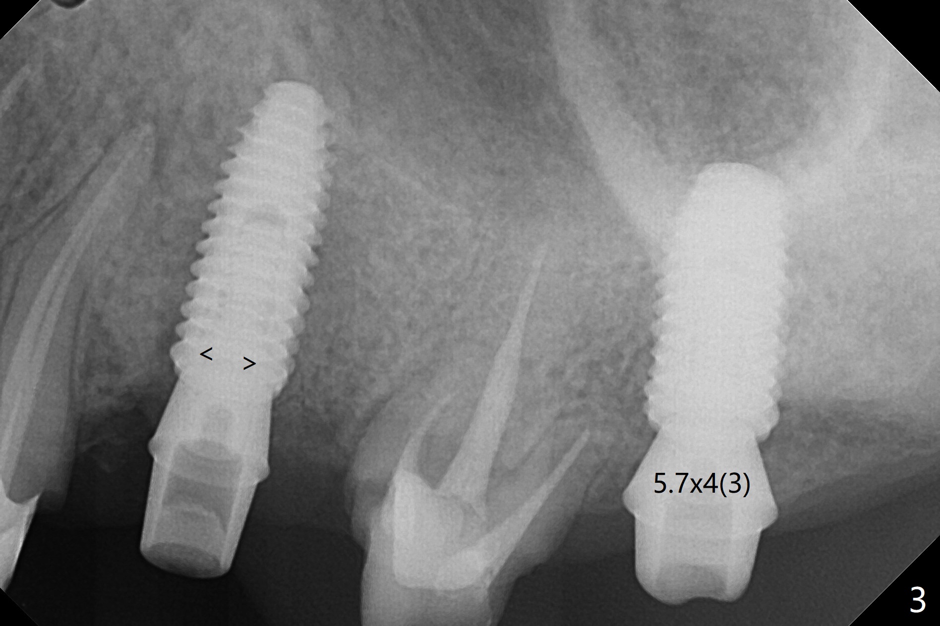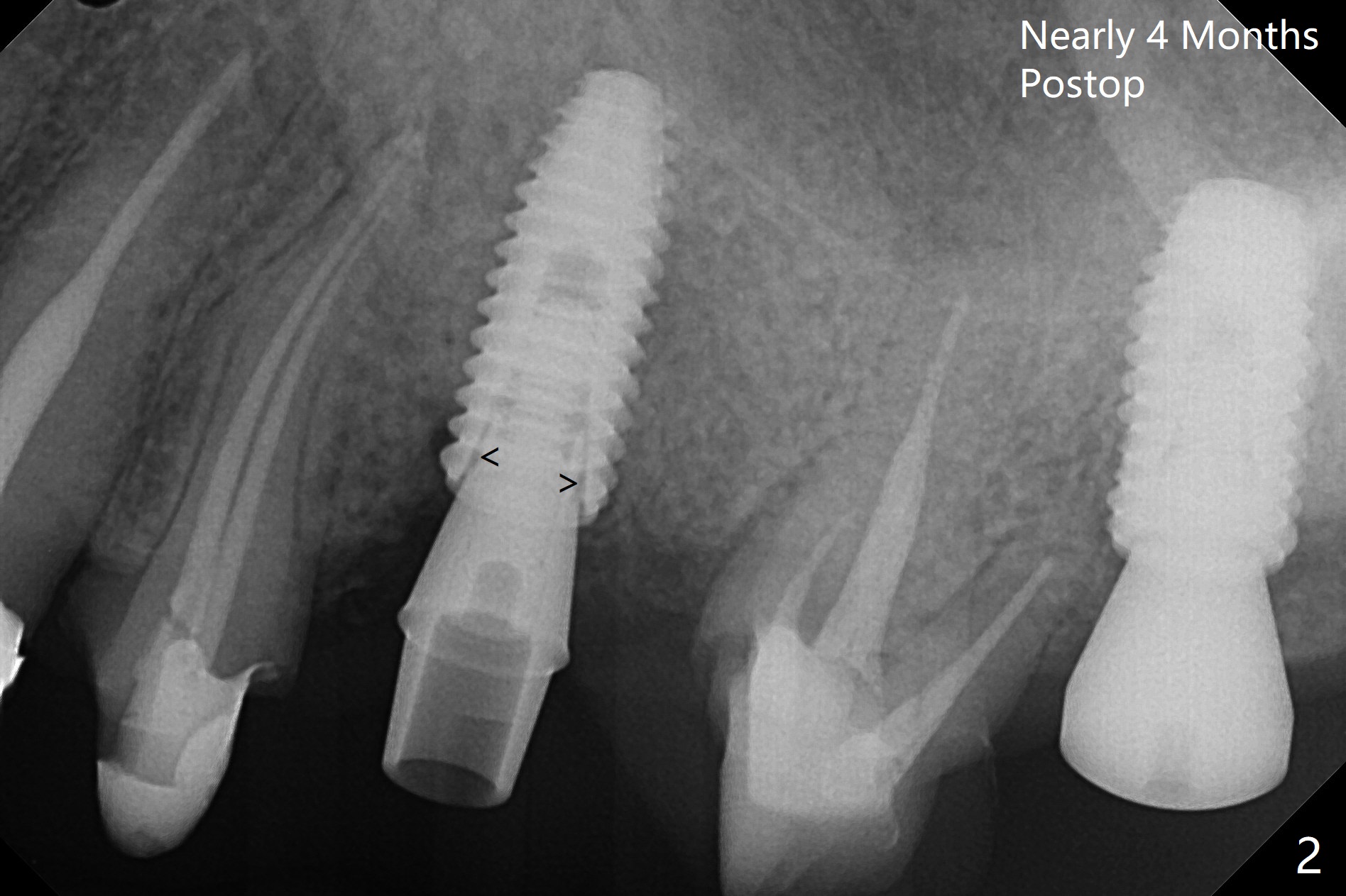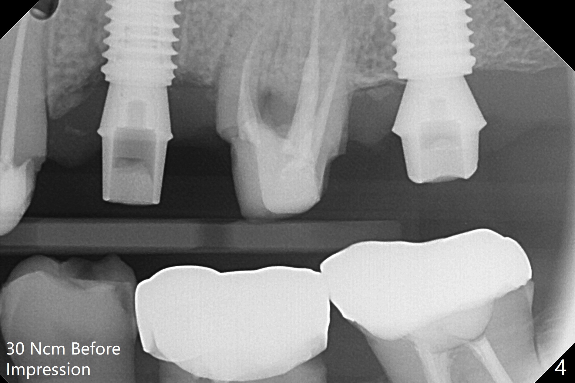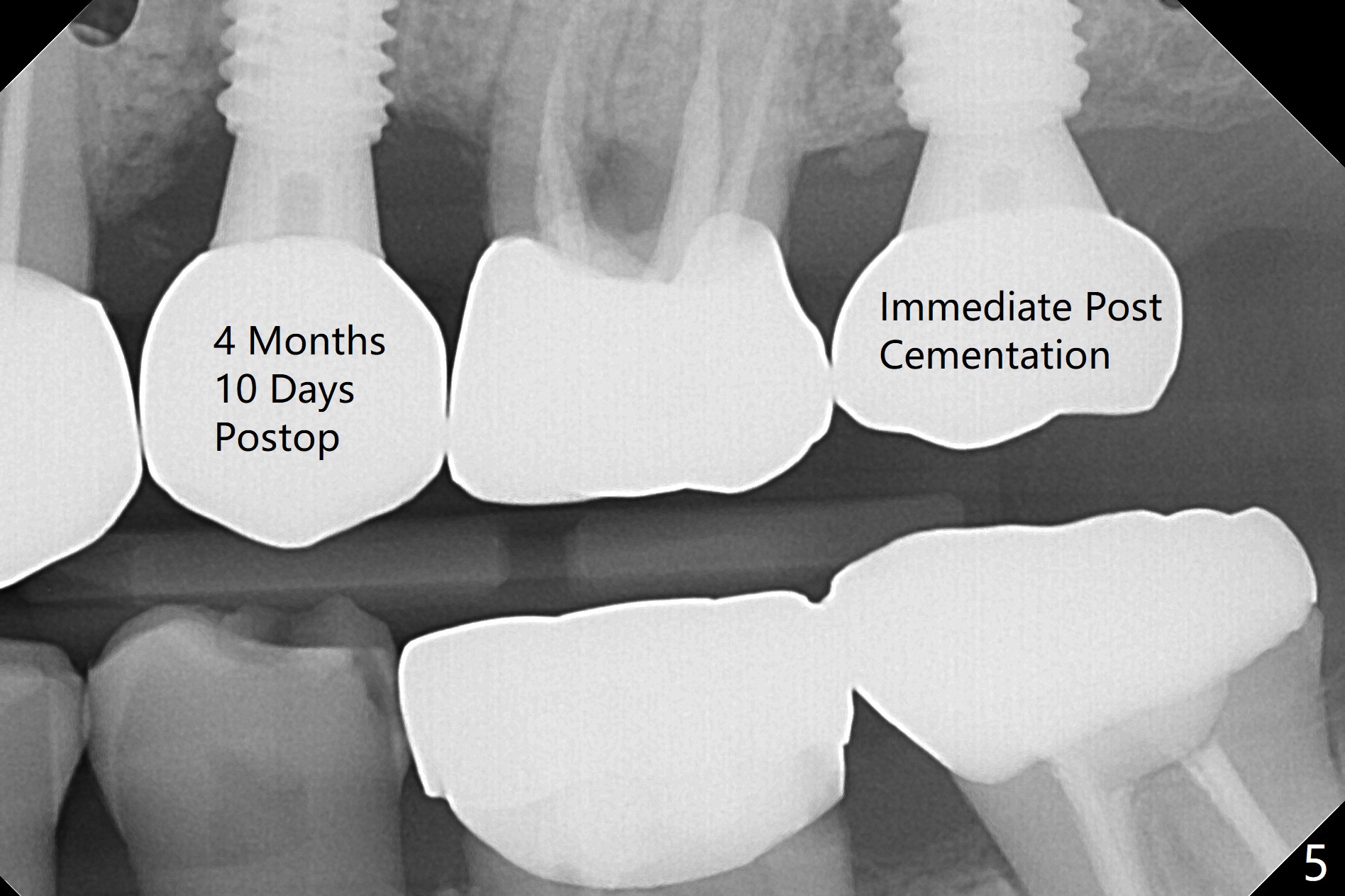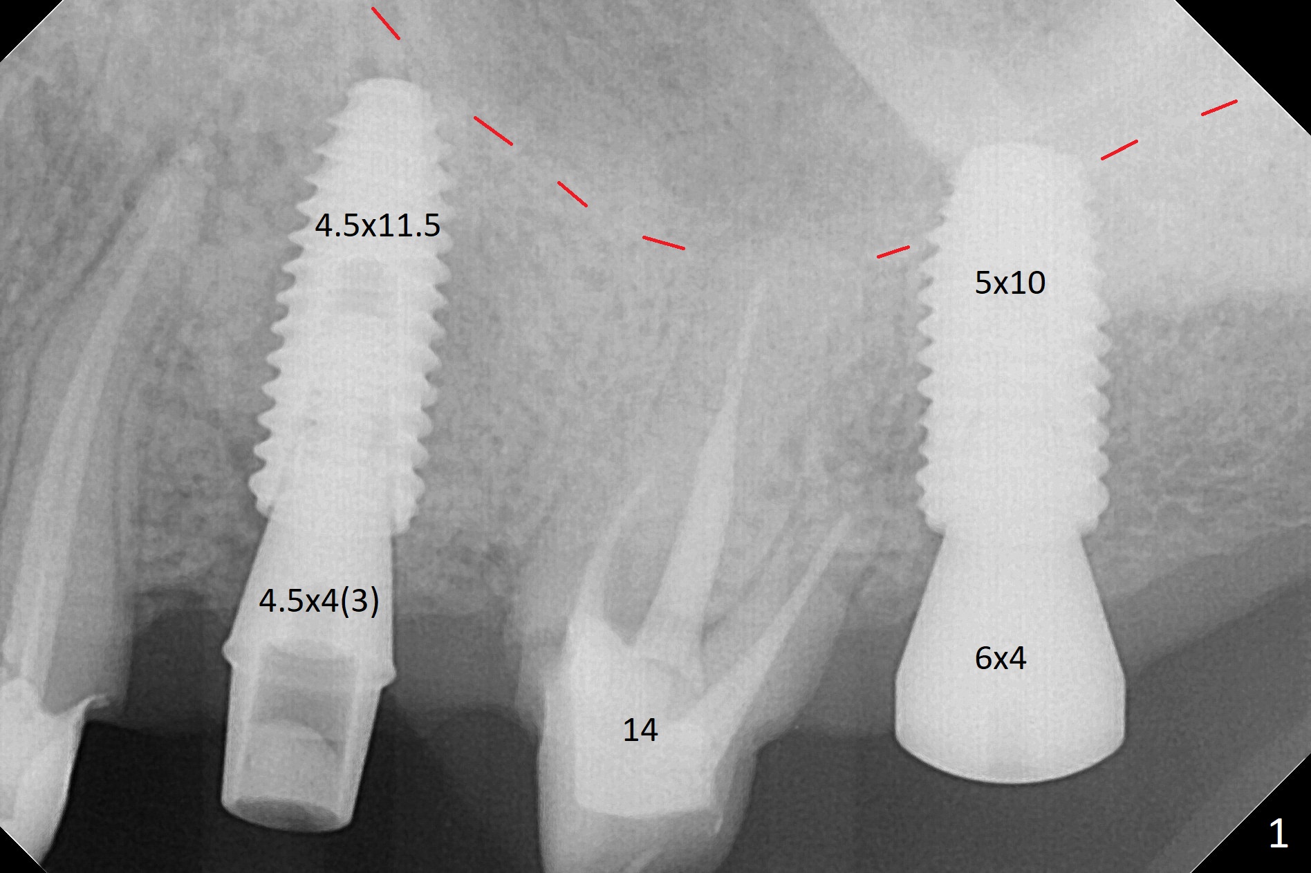 After underdrilling (3.5x14.5 mm drill (10.5 mm offset), a 4.5x11.5 mm implant is unable to enter the osteotomy at #13; following use of 4x10 mm drill (partial normal drilling), the implant is inserted smoothly with insertion torque ~ 35 Ncm. Sticky bone is placed in the bony portion of the buccal gap, while 2 pieces of PRF membrane in the gingival portion of the buccal gap. The bone density at #15 is low, the insertion torque is ~15 Ncm with normal drilling without cortical tap (Fig.1). The procedure is smooth in part due to no sinus involvement (red dashed line). An immediate provisional FPD is fabricated for #12-14. But local oral hygiene is difficult to maintenance. When the wound heals at #13, the FPD is removed. The bone loss is minimal nearly 4 months postop; the abutment at #13 is incompletely seated (Fig.2 arrowheads: gap). After repositioning, the abutment is re-seated completely without gap (arrowheads); a 5.7x4(3) mm cemented abutment is placed at #15 (Fig.3,4). Four crowns are cemented 4 months 10 days postop (Fig.5).