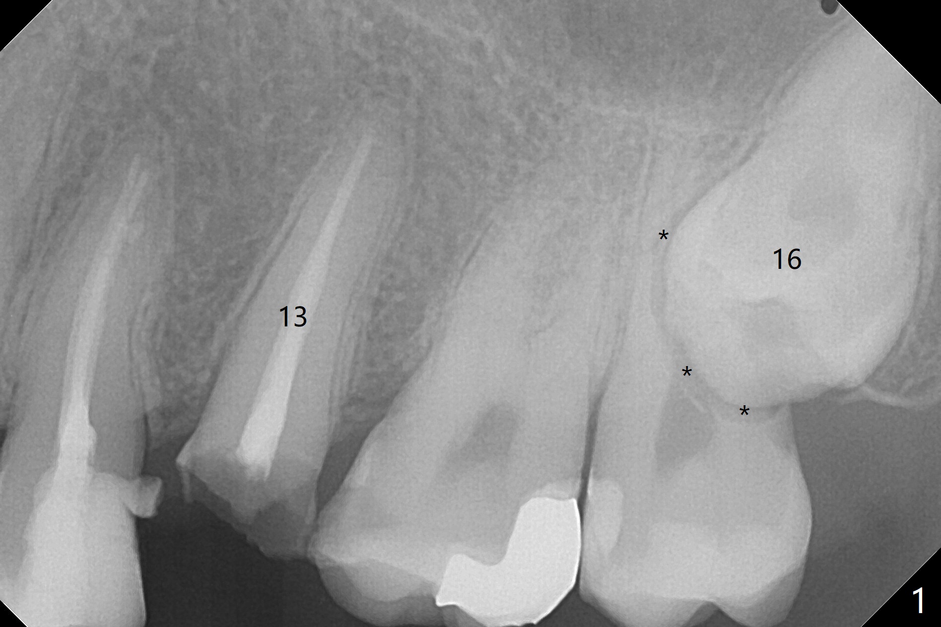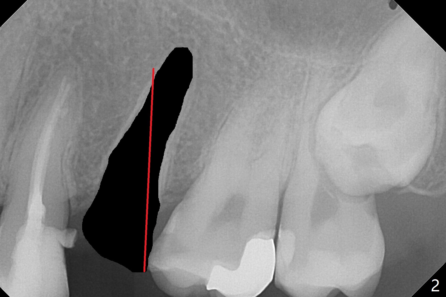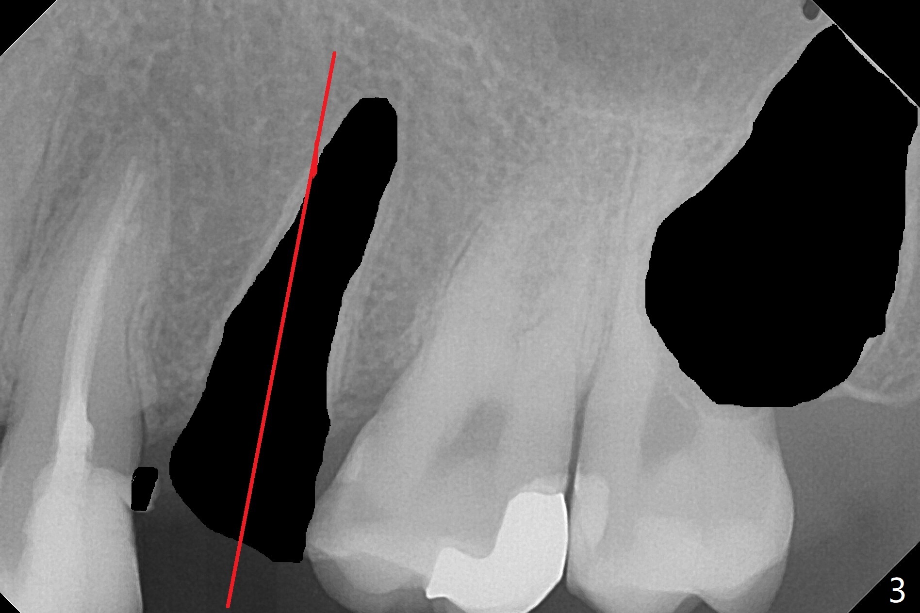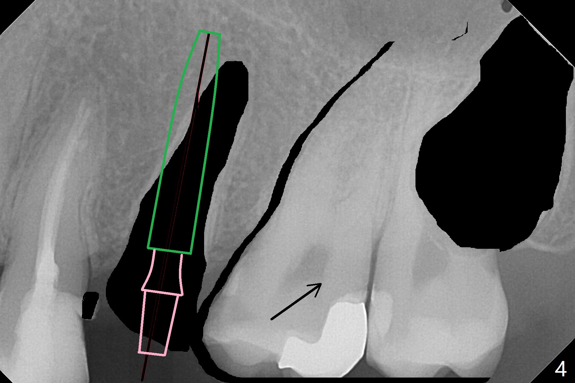 A 27-year-old man returns to clinic with #13 subgingival fracture, which is associated with Class III malocclusion and anterior open bite (Fig.1). Both #1 and 16 seem to be buccal to the 2nd molars, causing root resorption (Fig.1 *). Since the root of the 2nd premolar tilts distal, osteotomy for an implant will be in the mesiopalatal aspect of the extraction socket (Fig.2,3 red). Following implant placement, #16 will be extracted (Fig.3 black), laying foundation to distalize and intrude #14 and 15 to make space for #13 implant crown and reduce anterior open bite and posterior tooth overloading (Fig.4 arrow). No Deviation Clindamycin Xin Wei, DDS, PhD, MS 1st edition 08/25/2020, last revision 09/08/2020