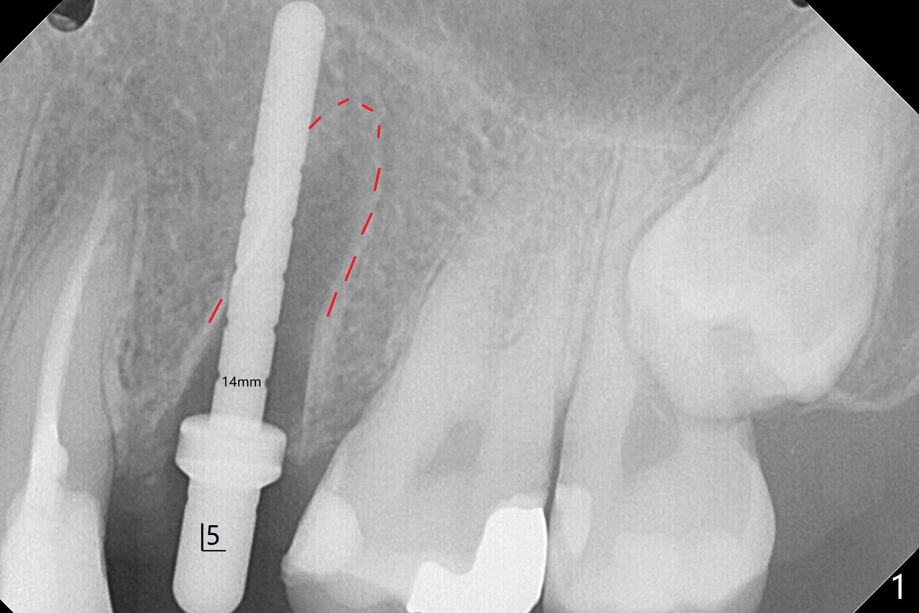 左上五牙齿长轴好像不理想,有意在即刻植牙过程中改之(图一),美中不足的是钻洞深度控制不好,太深了,