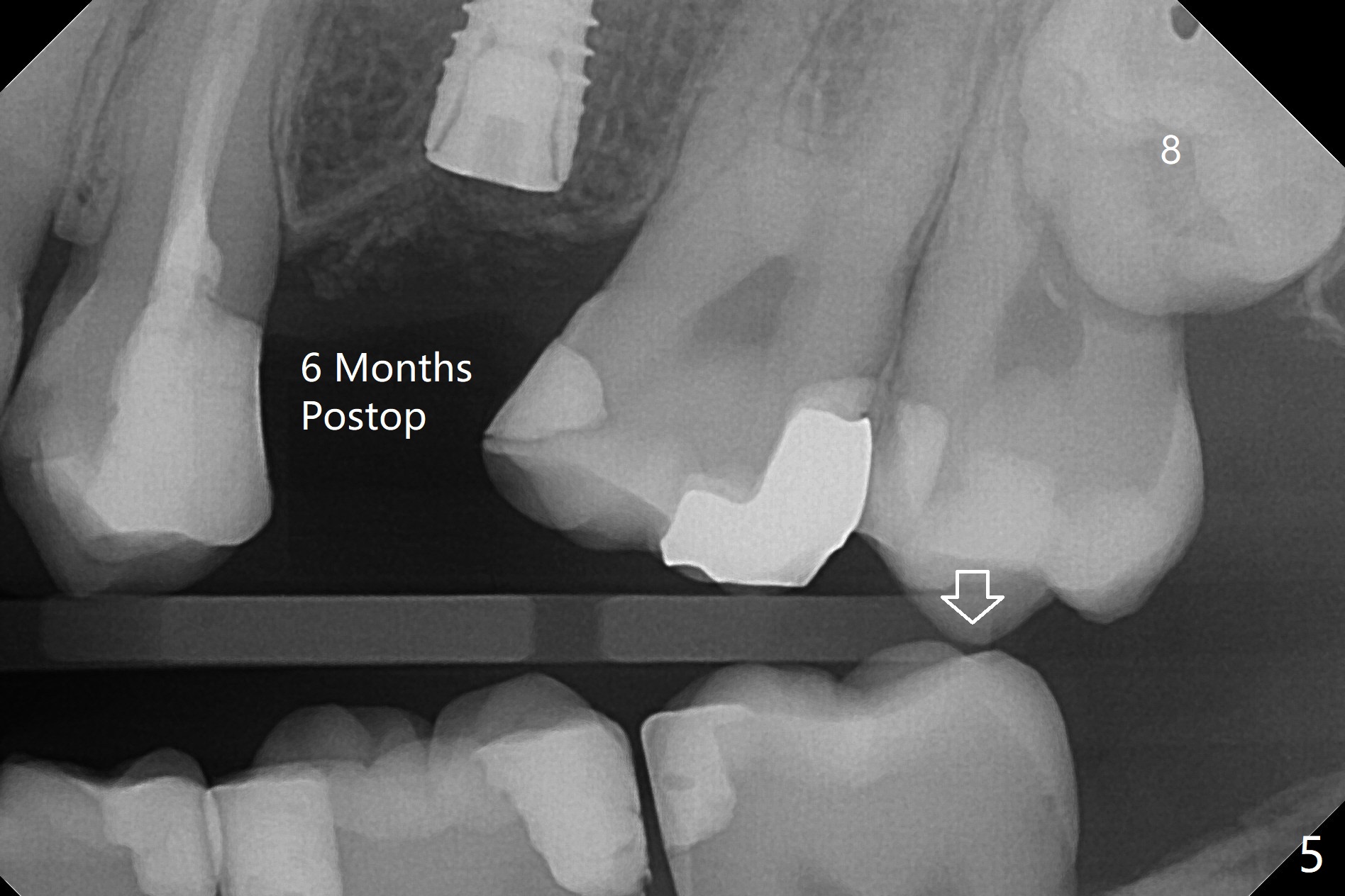 术后6个月植体愈合正常,但是6,7号牙好像前移(图五),切开,放置4.5x5(3)毫米愈合基台,必须磨去6号牙近中树脂(图七:<)。8阻生牙可能迫使7延长(图五:箭头),可能造成前牙开合(图六:*),6,7牙根之间几乎没有骨质。