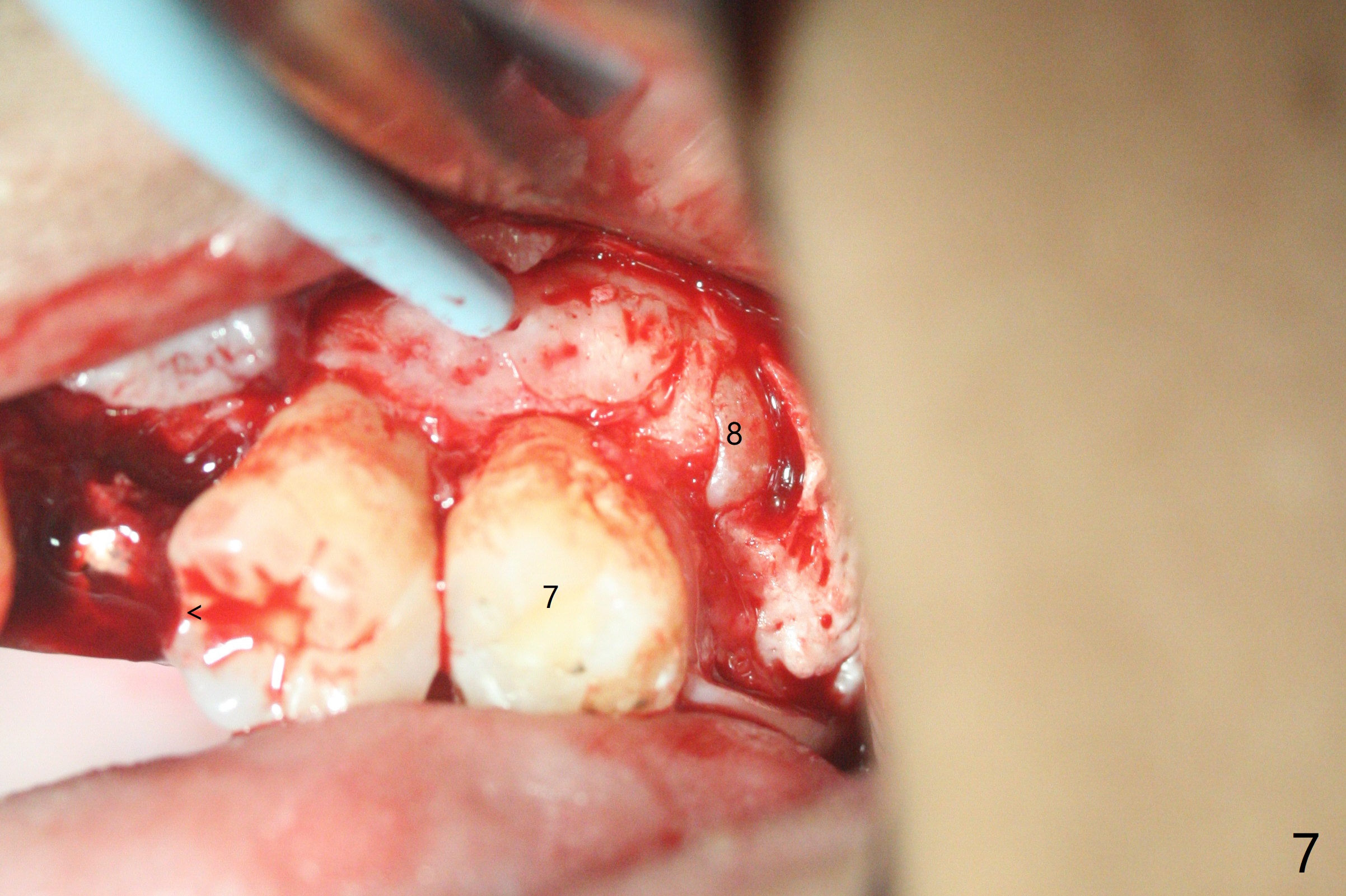 总之,左上8必须拔除(图七),其实必须两次手机切开才能去除。可能还需要拔除右上8,然后全口牙齿矫正。