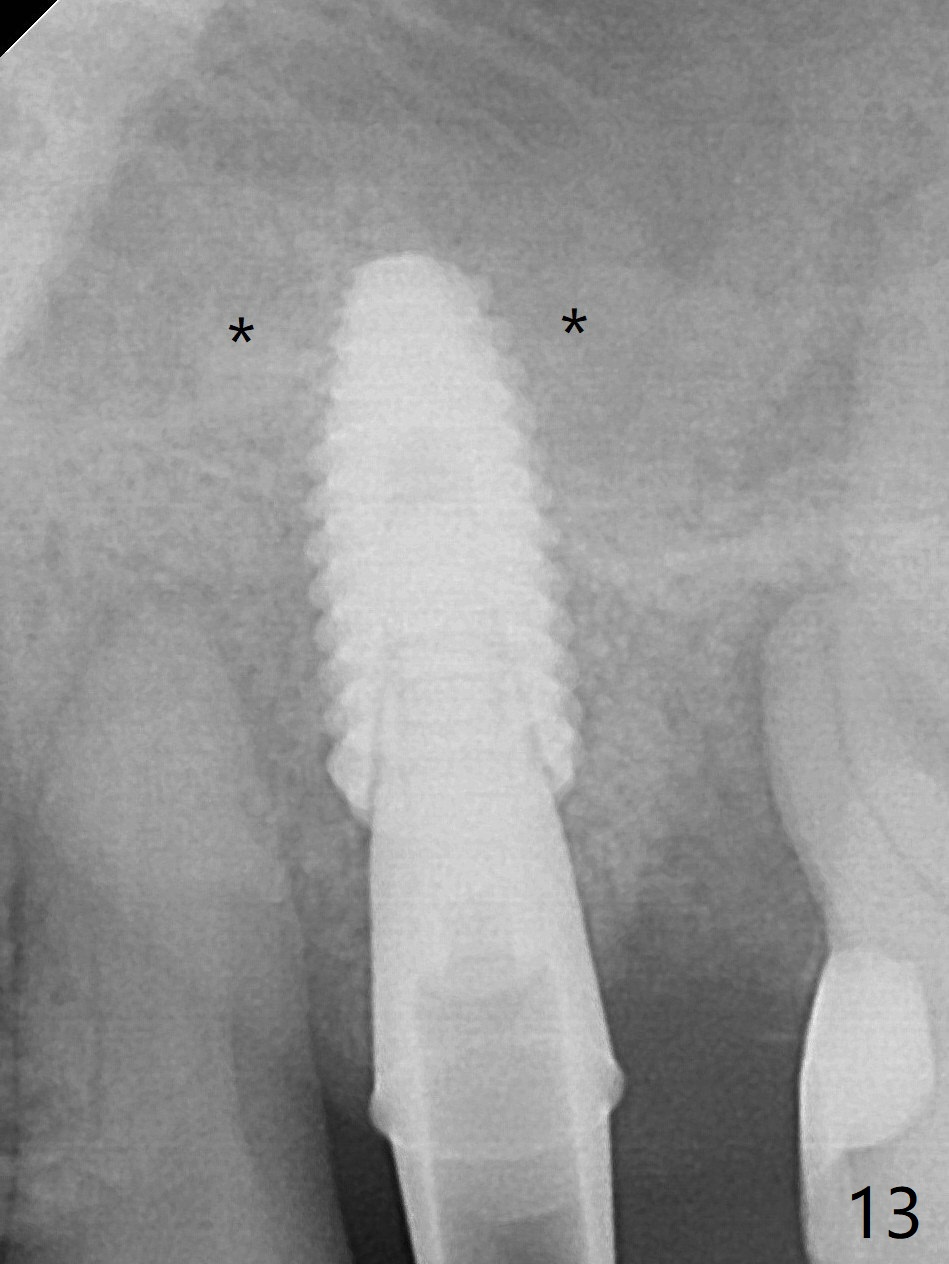 After placing PRF membrane and Vanilla graft for sinus lift (Fig.13 *), a 4.5x10 mm definitive implant is placed with loss of control in the trajectory (Fig.12,13). * in Fig.12: bone graft around the implant. Because of hemorrhage, deep position and block of the bone graft for sinus lift, it is difficult to control the entry of the final implant. The latter obviously slips into the original osteotomy. An angled abutment may be needed to correct the trajectory. Nearly 1 month postop, the 4.5x5.5(5) cementation abutment is loose. When it is removed, the patient feels pain from the implant. A 5.5x6 mm healing abutment is placed instead. The implant osteointegrates with trabecular pattern in the sinus 9 months postop (Fig.20 *). A 4.5x5.5(4) mm cementation abutment is used with mesial trimming before impression. The gingival cuff is healthy.