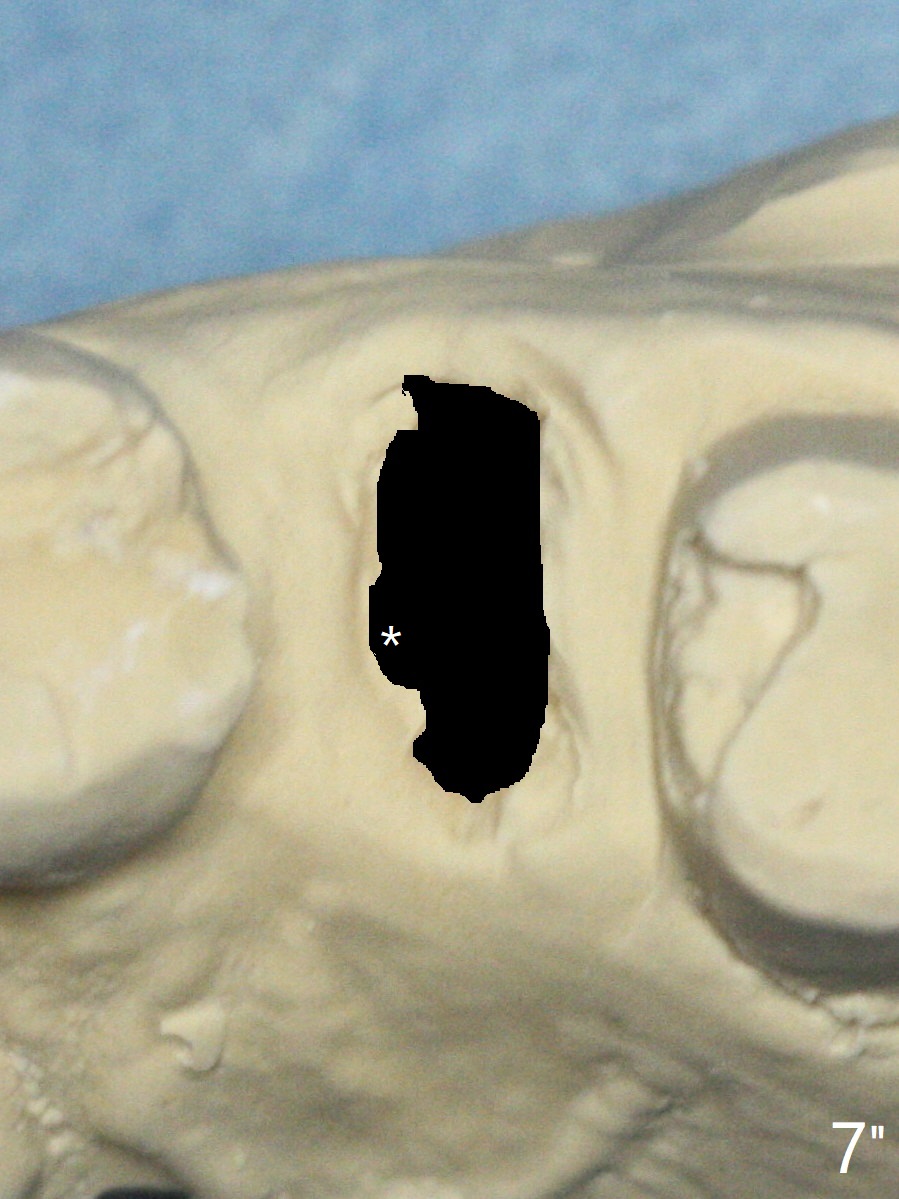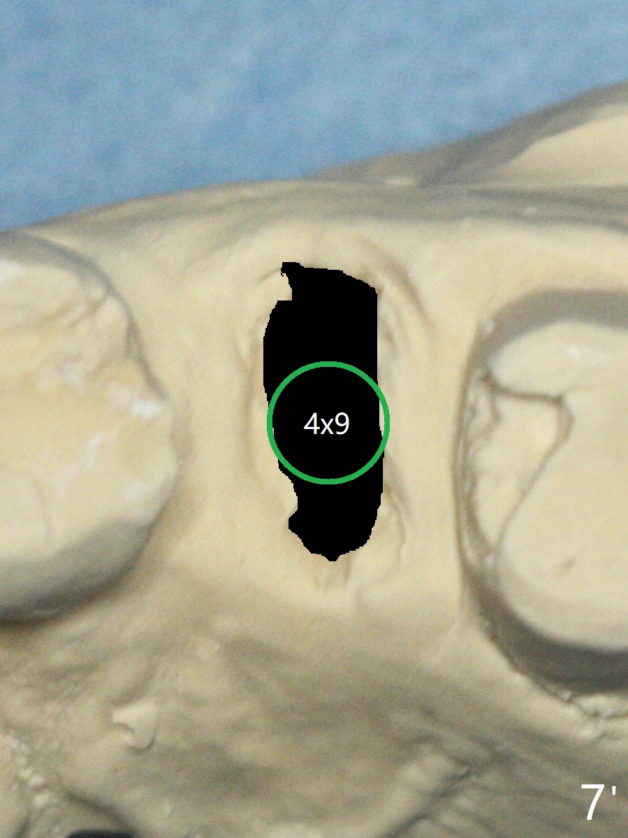 After mesial sheath preparation, insert a guide to finish osteotomy and 4x9 mm dummy implant (Fig.7' green). Remove the guide to check the relationship between the implant and the sheath. If needed, remove the middle of the sheath (Fig.7" *).