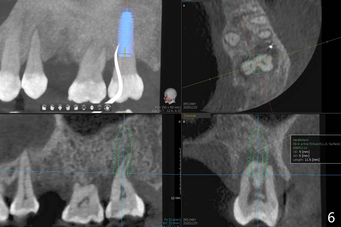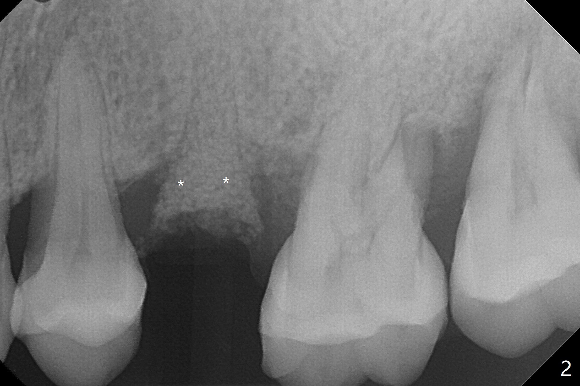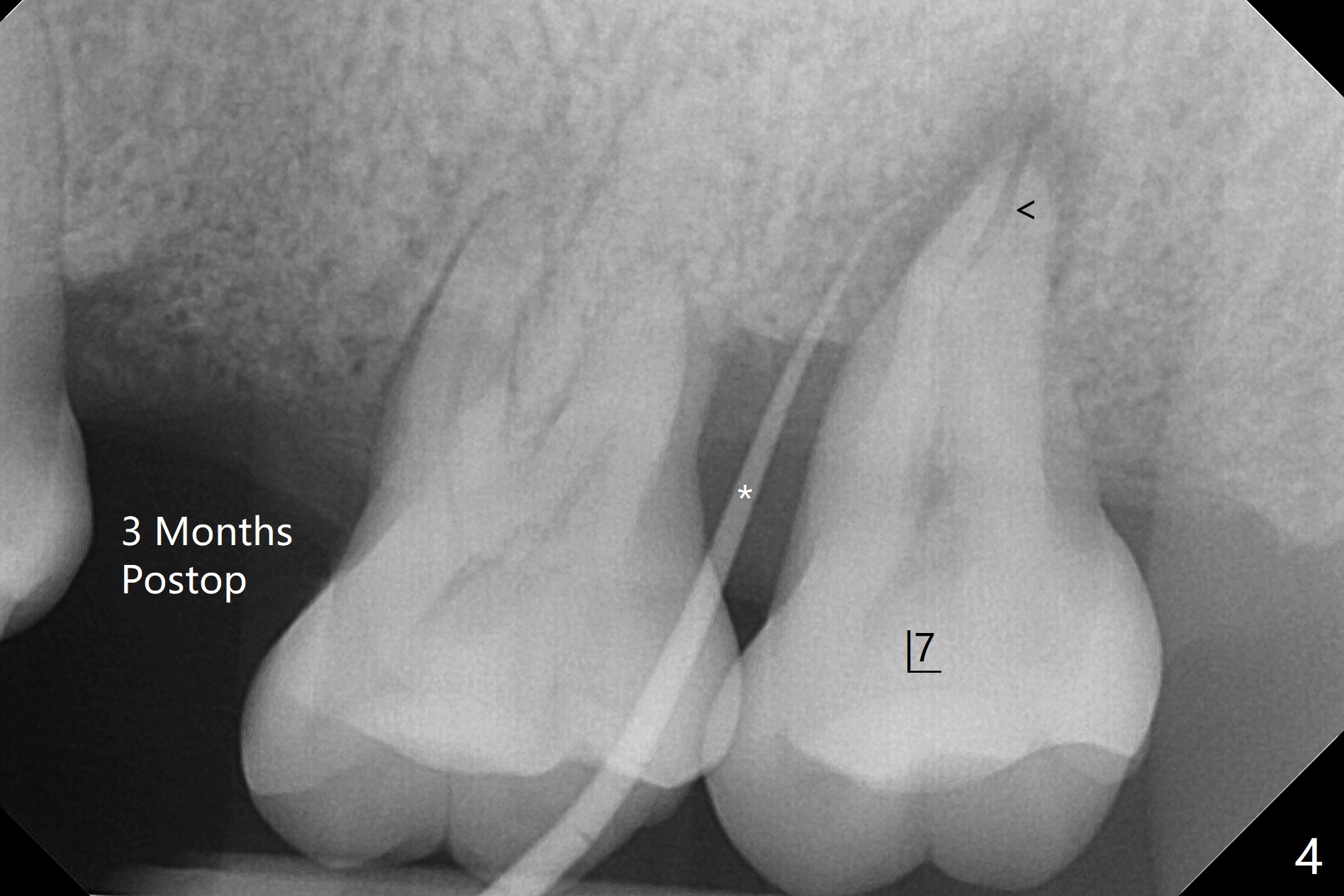 术后二周牙周敷料松动,取出后,伤口尚可(图三)。可能病人用右侧咀嚼,造成右上两个双尖牙松动疼痛,拔出后即刻种植修复,之后她能在右侧咀嚼,而食物撞击左上拔牙创疼痛,无法吃饭。术后三个月左上7疼痛,瘘道,插入牙胶尖(图四:*),根周阴影。其实腭侧根纵裂(图四,五:<),三个月已经发生(图二),可以即刻种植(图六),与5延期种植同时进行,使用导板。
