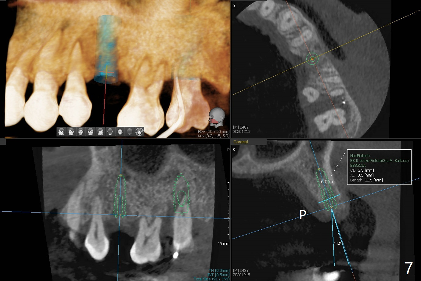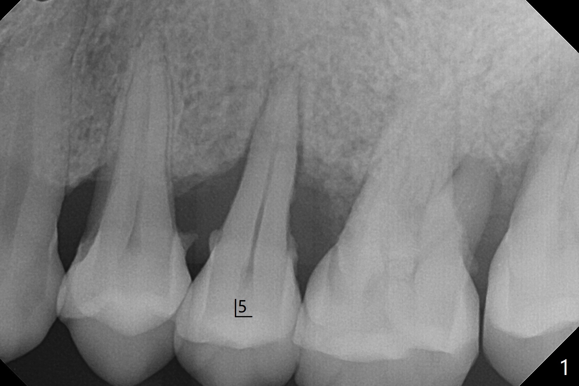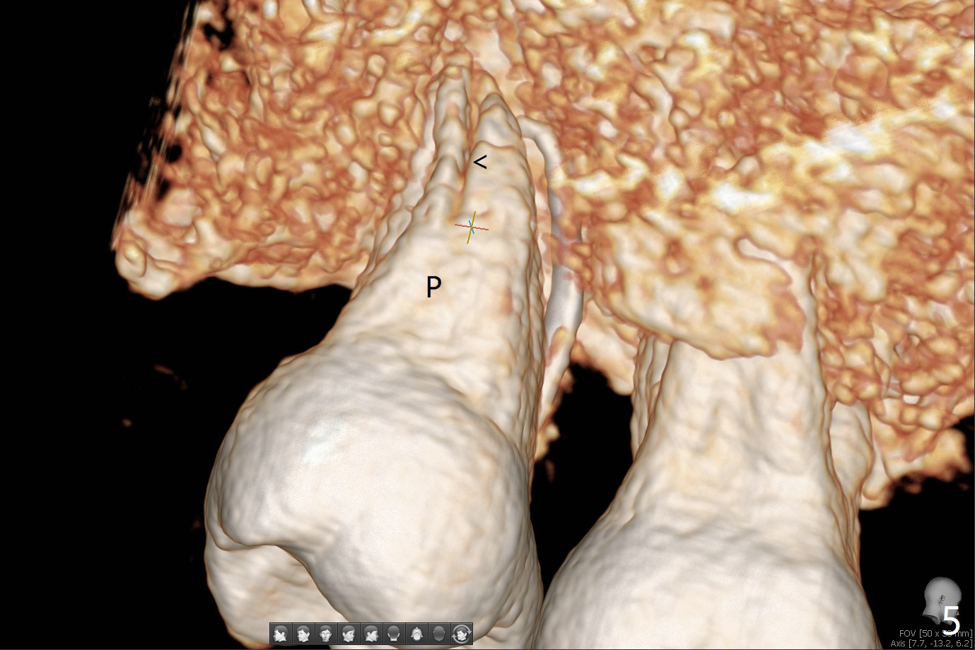 术后二周牙周敷料松动,取出后,伤口尚可(图三)。可能病人用右侧咀嚼,造成右上两个双尖牙松动疼痛,拔出后即刻种植修复,之后她能在右侧咀嚼,而食物撞击左上拔牙创疼痛,无法吃饭。术后三个月左上7疼痛,瘘道,插入牙胶尖(图四:*),根周阴影。其实腭侧根纵裂(图四,五:<),三个月已经发生(图二),可以即刻种植(图六),与5延期种植同时进行,使用导板。