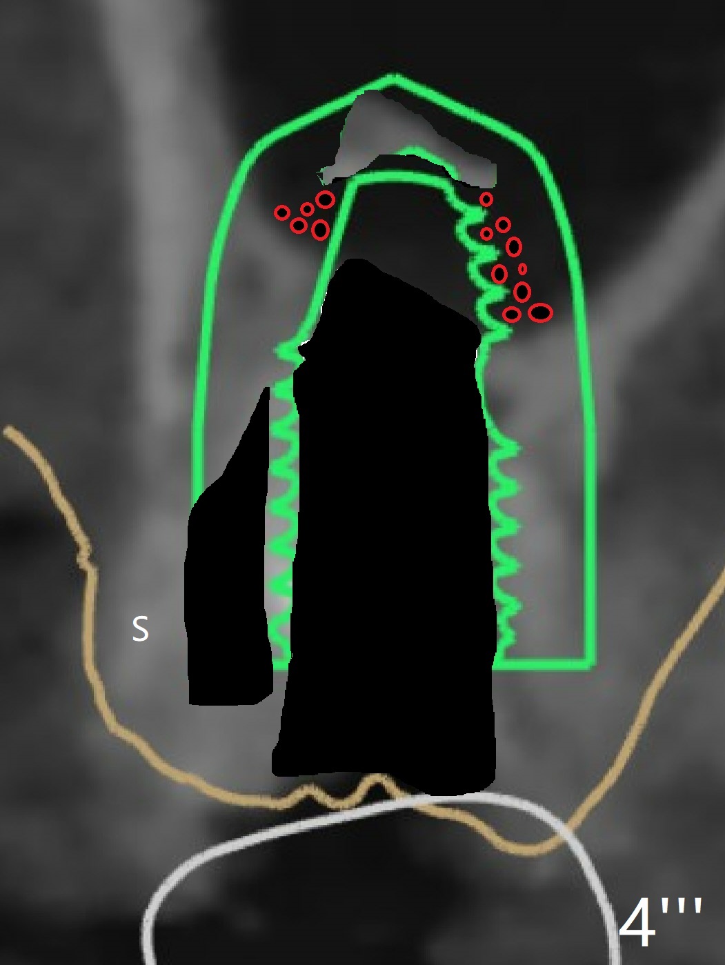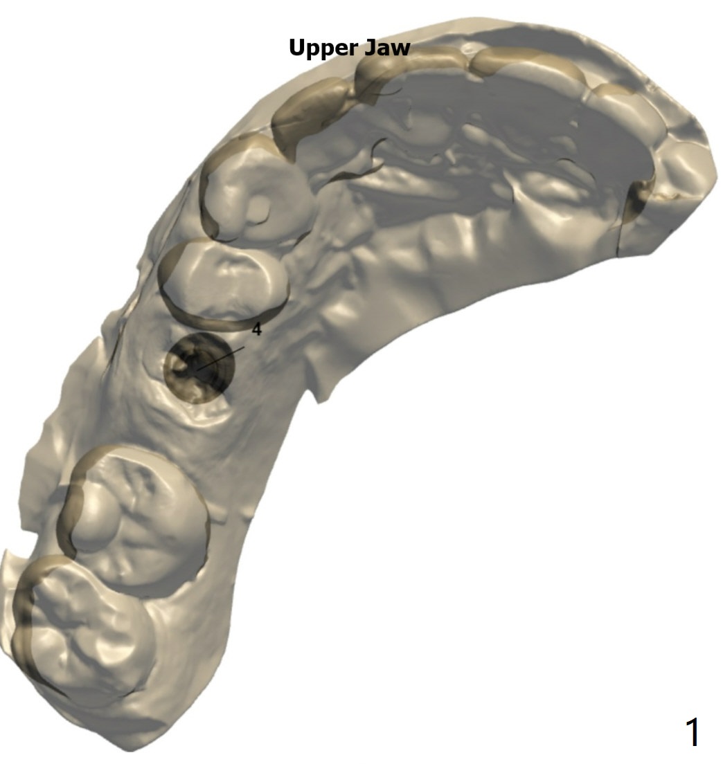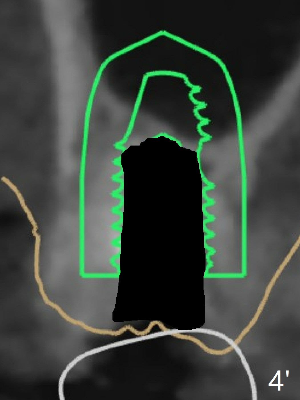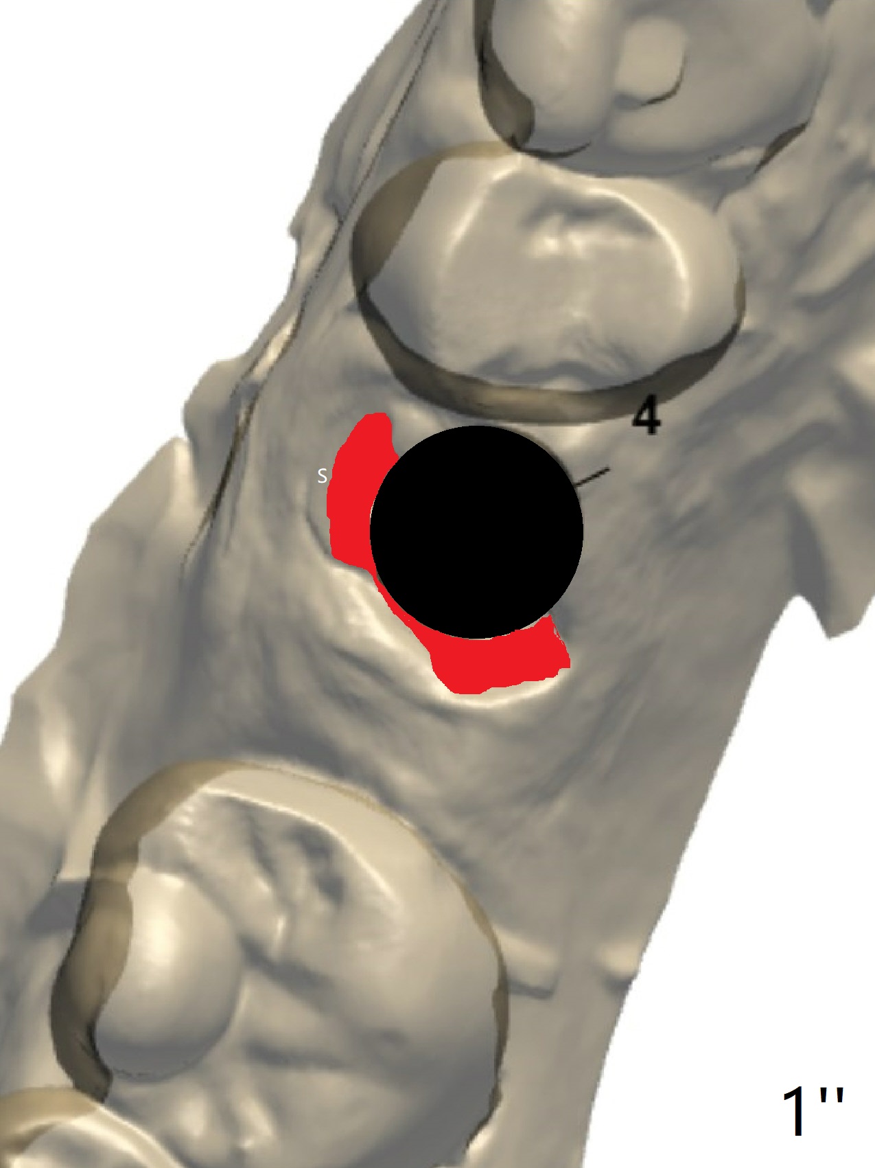 Remove superficial caries from the root stump (curette and surgical handpiece) and finish osteotomy while the residual root in place (Fig.1'). Remove the residual root (Fig.1'' red) except the buccal socket shield (S). Conduct osteotomy using guide (Fig.4' black) while the root is in place. Use the solid tooth and bony structure as a stopper for sinus lift (DIO sinus lift kit). Remove the remaining root (Fig.4'' (2nd smaller black area) except buccal shield (S) and place an implant.