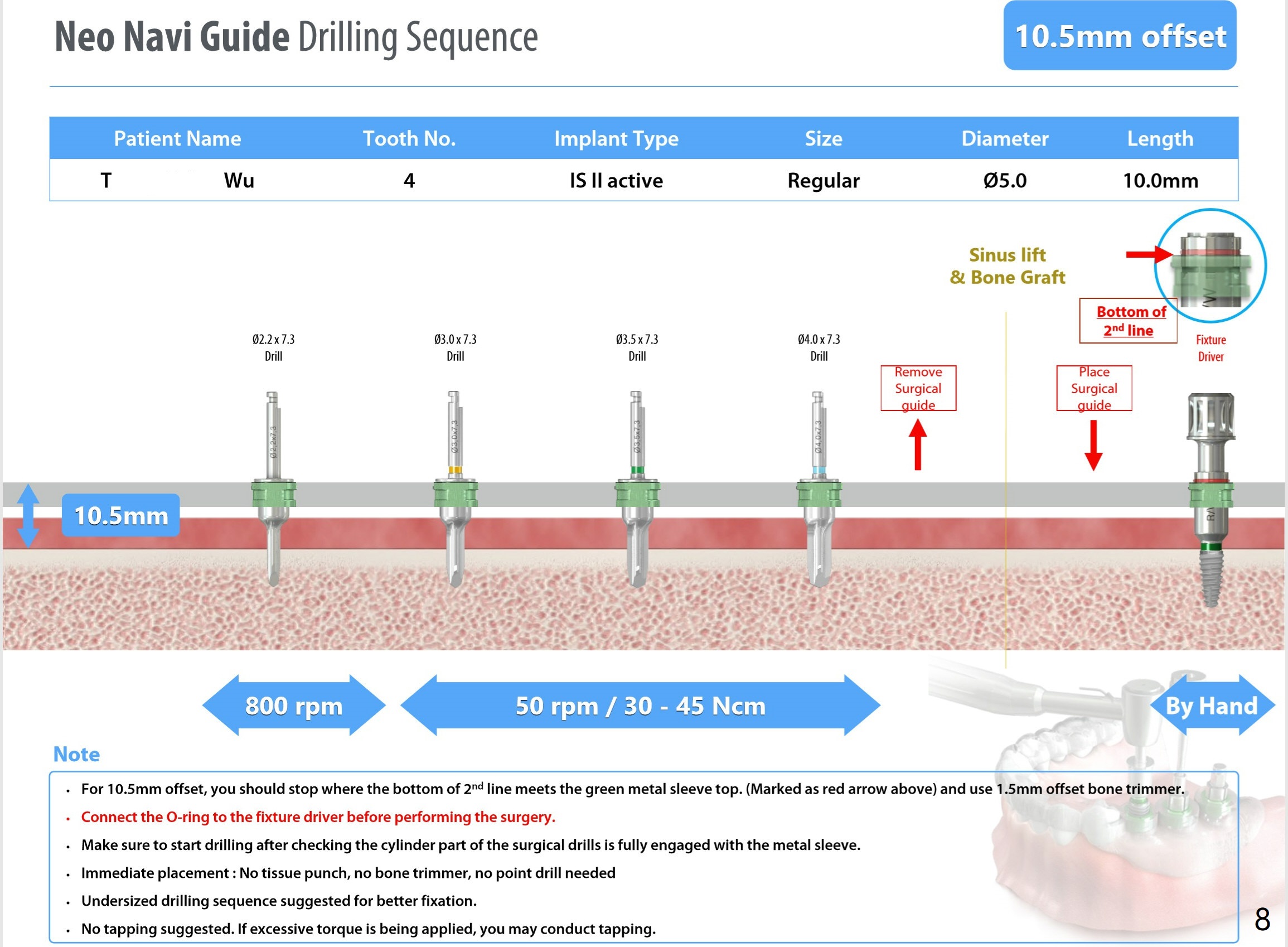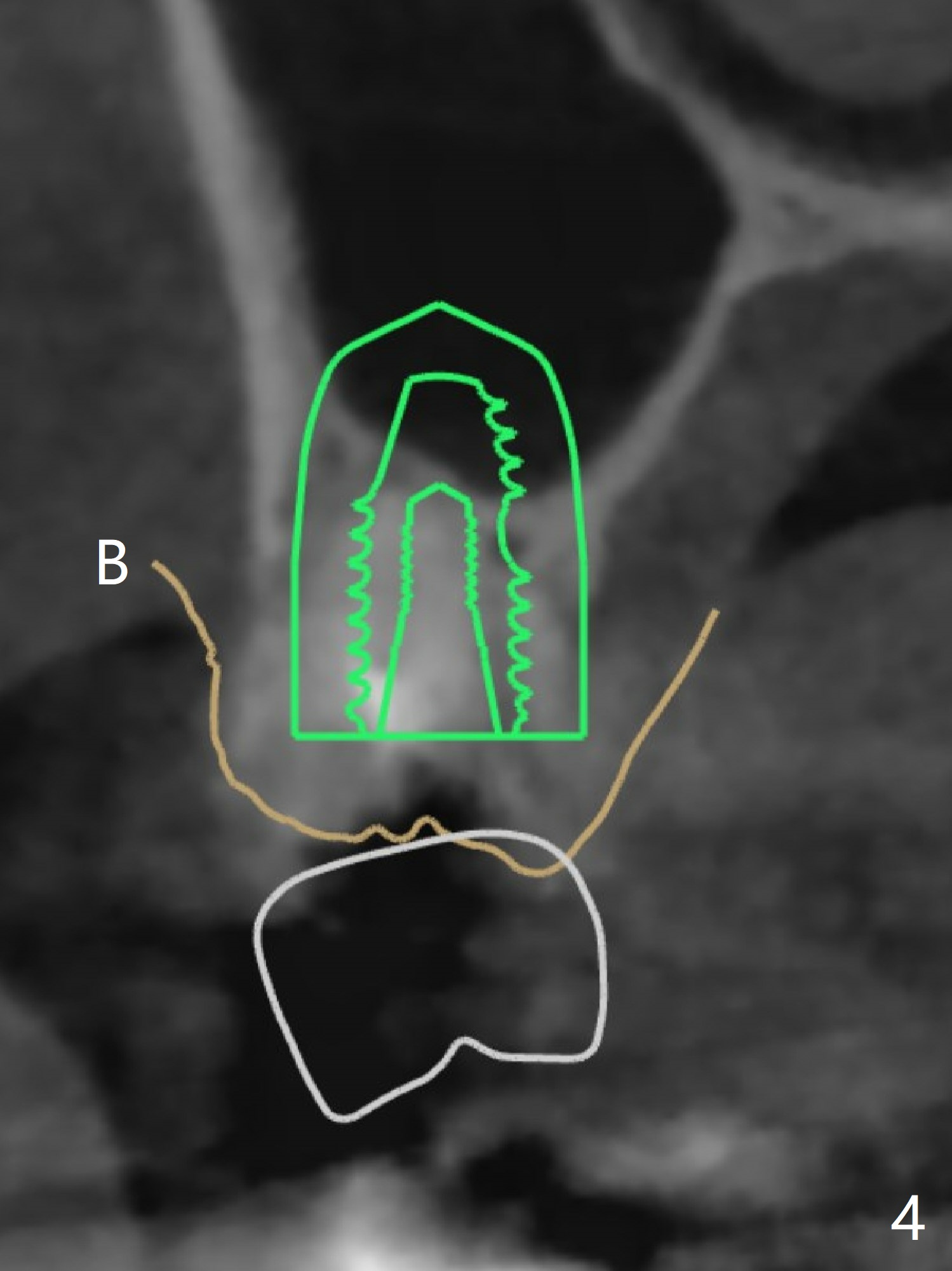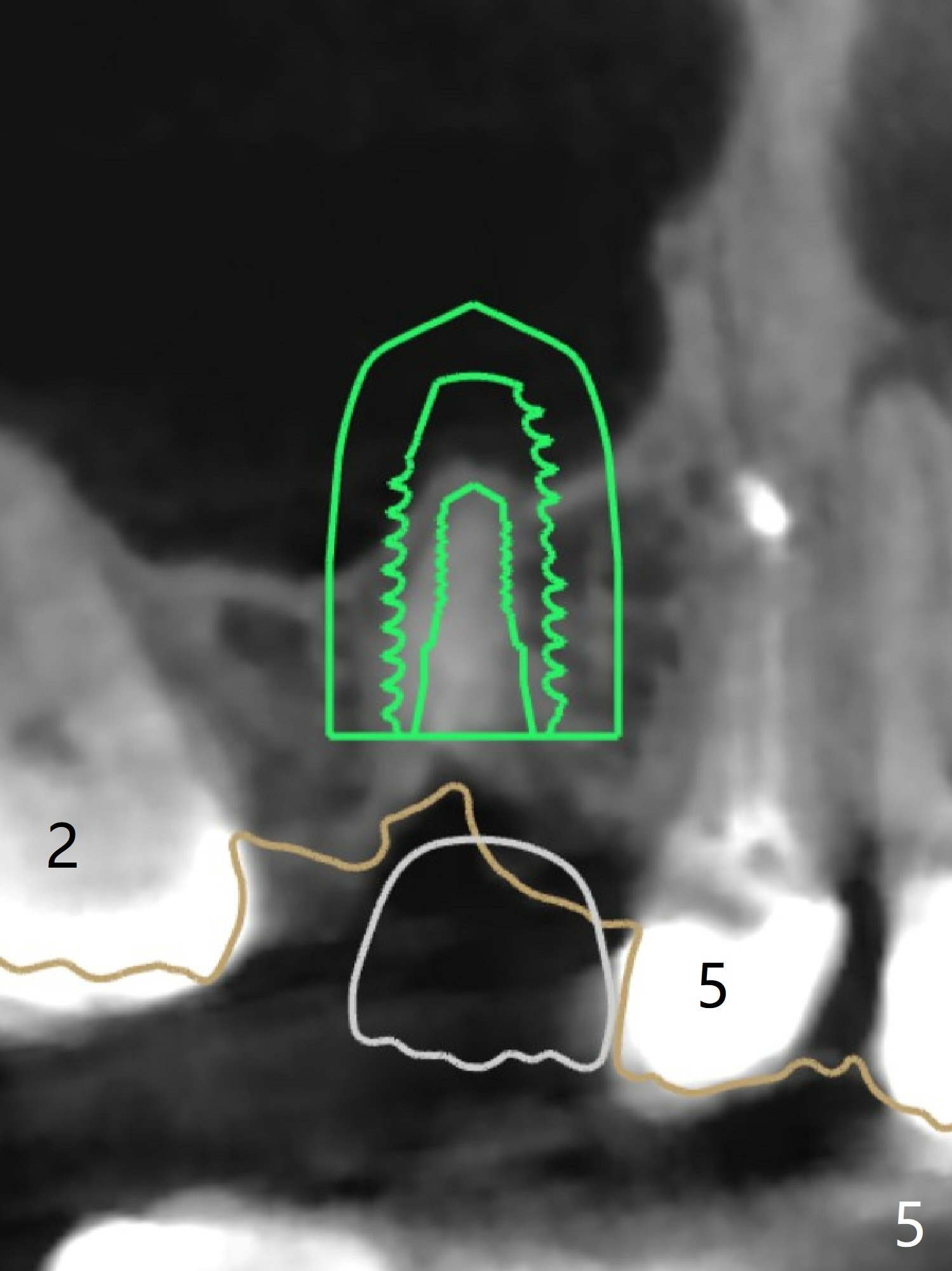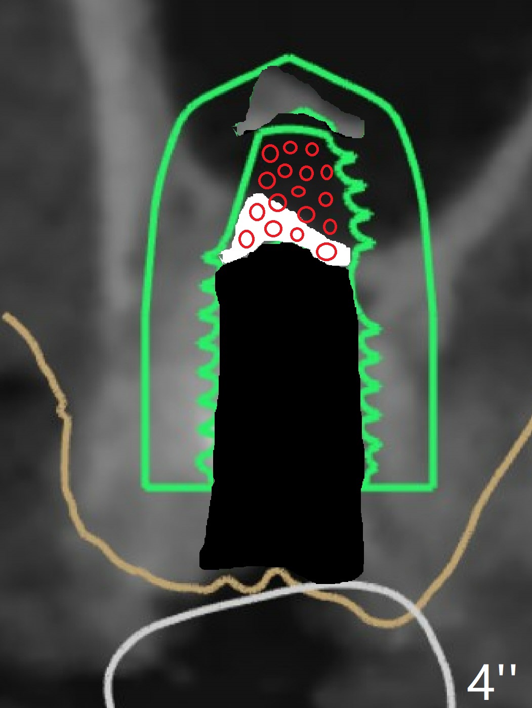 Remove superficial caries from the root stump (curette and surgical handpiece) and finish osteotomy while the residual root in place (Fig.1'). Remove the residual root (Fig.1'' red) except the buccal socket shield (S). Conduct osteotomy using guide (Fig.4' black) while the root is in place. Use the solid tooth and bony structure as a stopper for sinus lift (DIO sinus lift kit). Remove the remaining root (Fig.4'' (2nd smaller black area) except buccal shield (S) and place an implant.