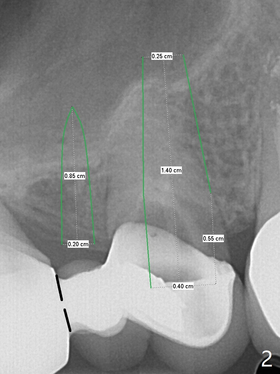 After sectioning the FPD as indicated by black dashed line in Fig.2, try to initiate osteotomy at #3 with 1.2 and 1.5 mm drills for 5 mm (bone height) and 1.0 and 1.5 mm Tatum micro-osteotomes for sinus lift and place a 2x8.5 mm IS mini-implant. If it is feasible, place a 4x14 mm tissue-level implant slightly mesial at #4. If not, place a larger one (4.5 mm) slightly distal for a cantilever FPD.