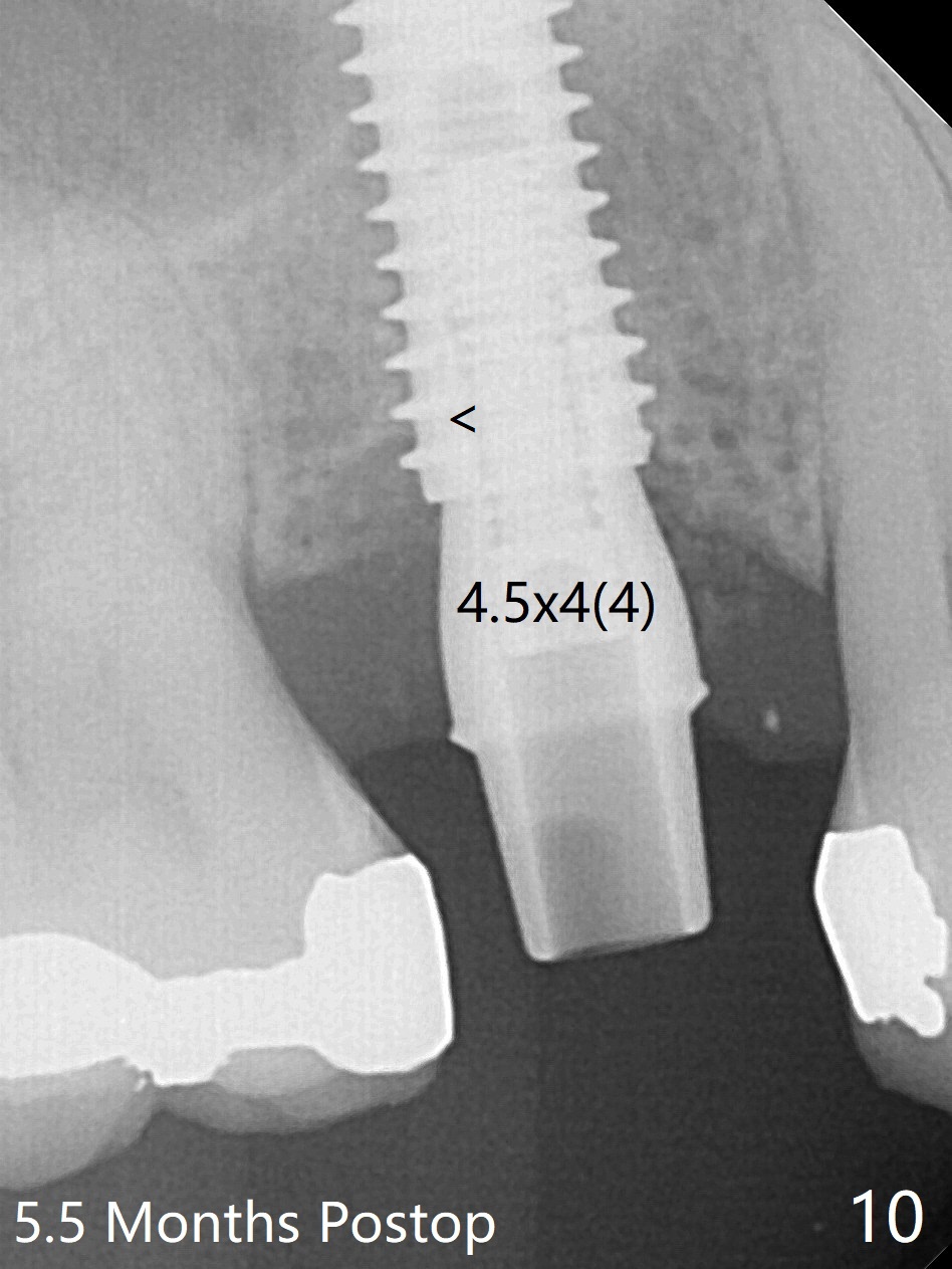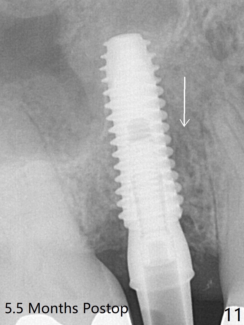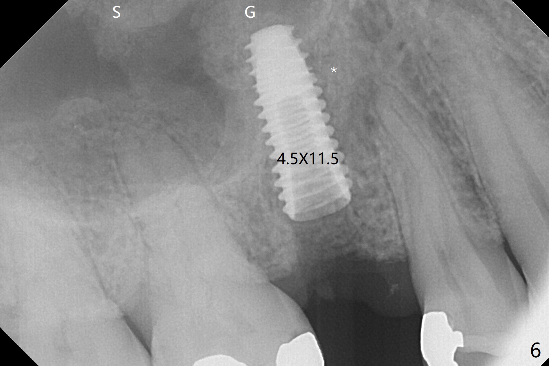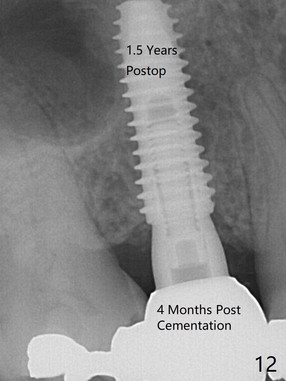 The 48-year-old man agrees to extract the tooth #4 with buccal and palatal fistulae (Fig.1,2 >) and large PARL (Fig.3 *) because of purulent discharge. The large post (Fig.3 P) is most likely associated with a longitudinal fracture. The latter is not noted until postop (Fig.4 <). Intraop finding is large amount of granulation tissue removed from the mesial apical region (Fig.3,5 *). With 10.5 mm offset, Sinus Approach Drill (19 mm) is estimated too short for sinus lift after 3x8.5 mm drill. Without careful repeated check, 2.2x10 and 2.2x11.5 mm drills are used. The sinus floor is perforated, but the membrane seems to be intact. The perforation is too small to insert PRF, but alright for allograft. Then nose blowing test shows that the sinus membrane is perforated, which seems to be repaired after placement of 2 pieces of PRF membrane, followed by another round of allograft (Fig.5 G), which is lifted by a 4x10 mm IS dummy implant. Before placement of a 4.5x11.5 mm final UF implant, allograft is placed in the 3 defective bony areas mentioned above, including the apical mesial one (Fig.6 *). But the final UF implant seems too short with non-satisfactory torque. The latter appears to be solved with the increased length of the implant (Fig.7). The gingiva around the provisional (P) is healthy without fistulae buccal (Fig.8) or palatal 17 days postop (Fig.9). A new abutment with 1 mm longer cuff is seated completely 5.5 months postop (Fig.10 < (no gap), as compared to Fig.7). The lower portion of the mesial defect seems to have been repaired (Fig.11 arrow, as compared to Fig.7). The bone in the sinus seems stable 1.5 years postop (Fig.12). There is no crestal bone loss 4 months post cementation (Fig.13). Return to Upper Premolar Immediate Implant, Trajectory II Xin Wei, DDS, PhD, MS 1st edition 09/27/2019, last revision 04/12/2021