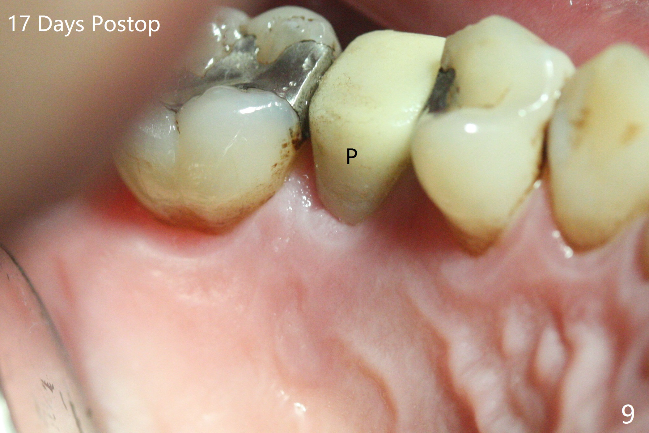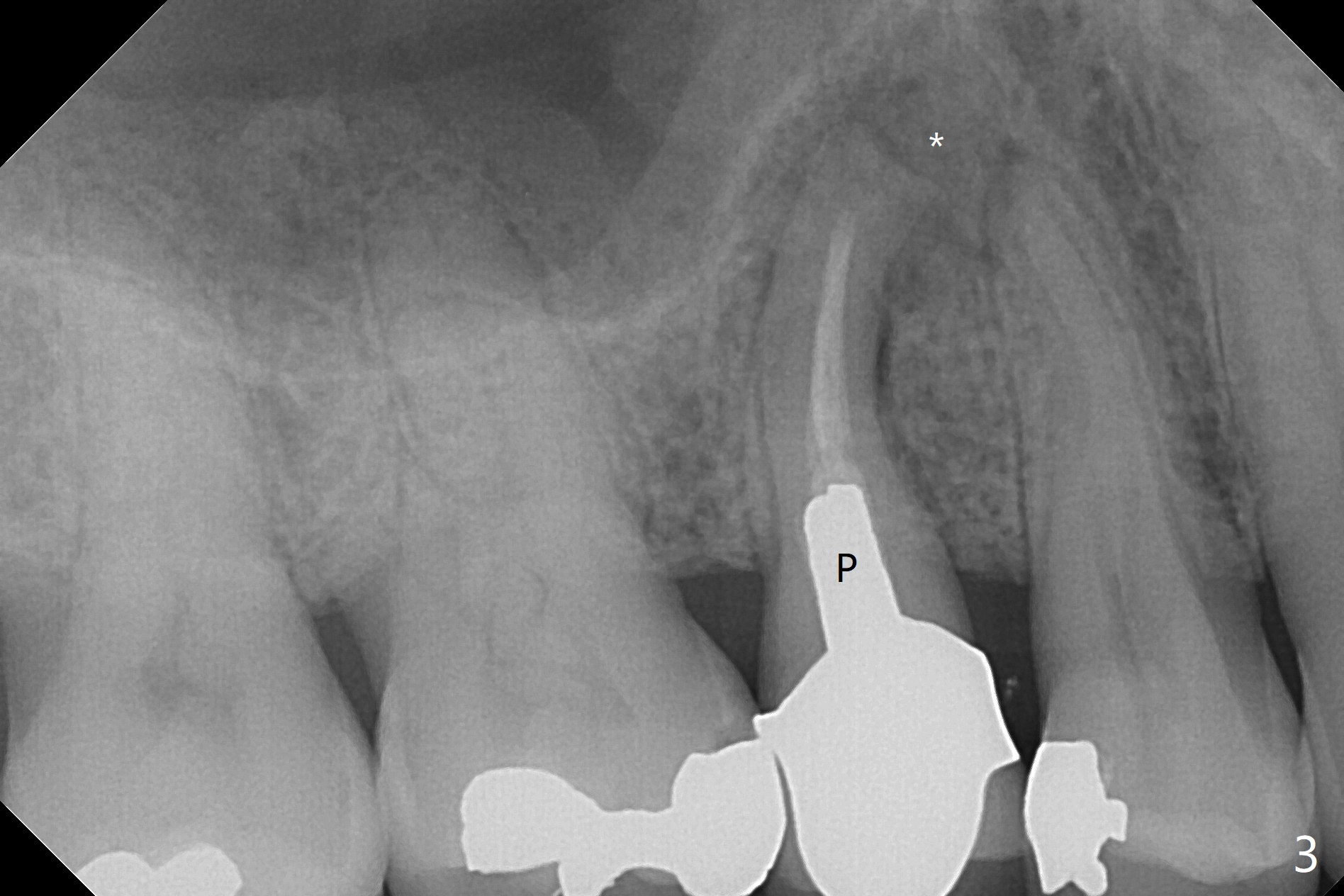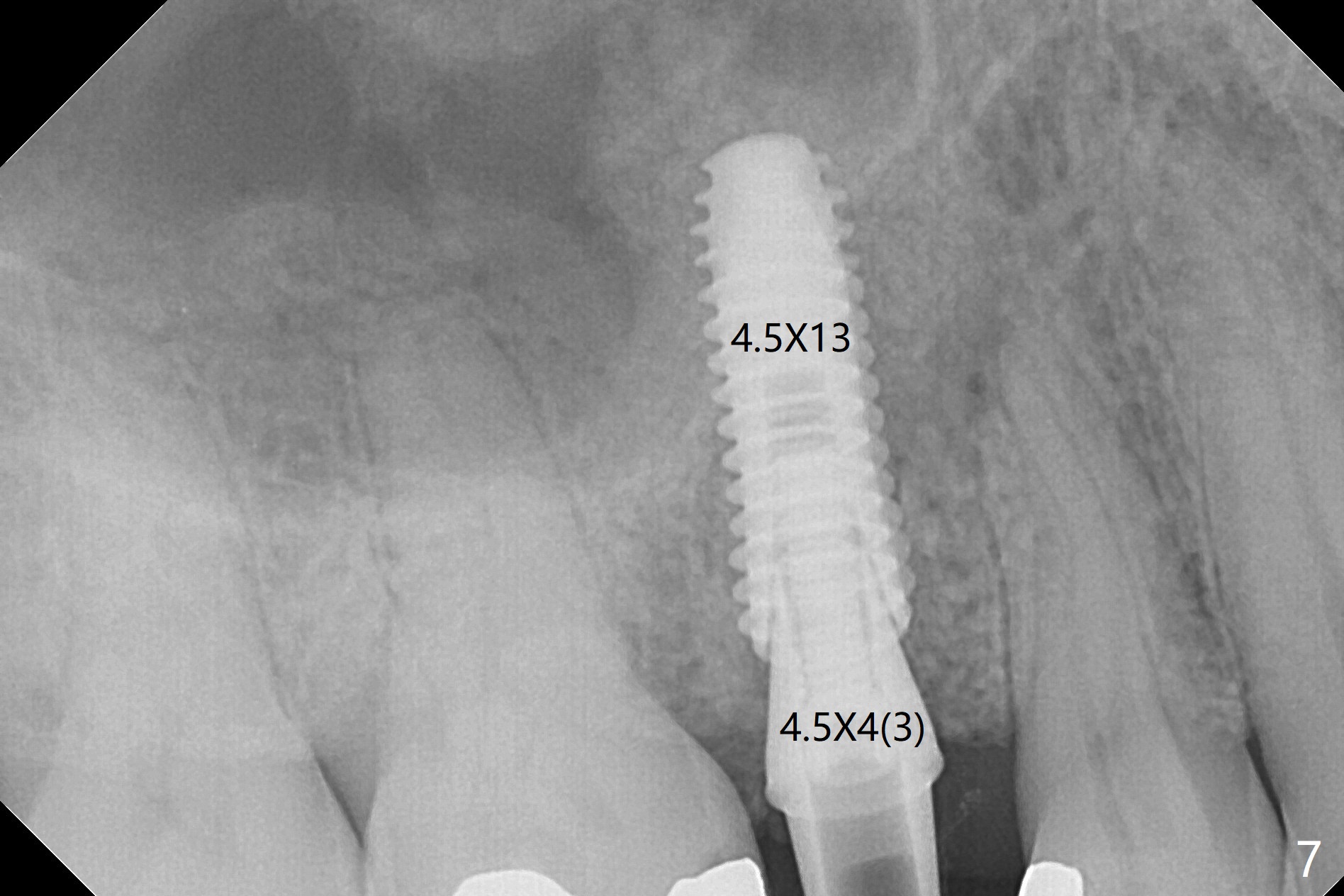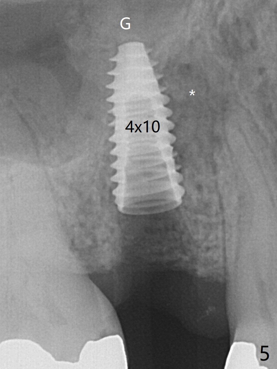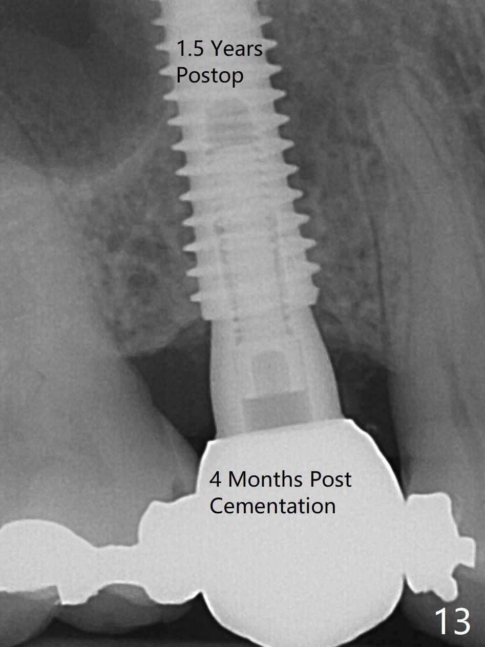 The 48-year-old man agrees to extract the tooth #4 with buccal and palatal fistulae (Fig.1,2 >) and large PARL (Fig.3 *) because of purulent discharge. The large post (Fig.3 P) is most likely associated with a longitudinal fracture. The latter is not noted until postop (Fig.4 <). Intraop finding is large amount of granulation tissue removed from the mesial apical region (Fig.3,5 *). With 10.5 mm offset, Sinus Approach Drill (19 mm) is estimated too short for sinus lift after 3x8.5 mm drill. Without careful repeated check, 2.2x10 and 2.2x11.5 mm drills are used. The sinus floor is perforated, but the membrane seems to be intact. The perforation is too small to insert PRF, but alright for allograft. Then nose blowing test shows that the sinus membrane is perforated, which seems to be repaired after placement of 2 pieces of PRF membrane, followed by another round of allograft (Fig.5 G), which is lifted by a 4x10 mm IS dummy implant. Before placement of a 4.5x11.5 mm final UF implant, allograft is placed in the 3 defective bony areas mentioned above, including the apical mesial one (Fig.6 *). But the final UF implant seems too short with non-satisfactory torque. The latter appears to be solved with the increased length of the implant (Fig.7). The gingiva around the provisional (P) is healthy without fistulae buccal (Fig.8) or palatal 17 days postop (Fig.9). A new abutment with 1 mm longer cuff is seated completely 5.5 months postop (Fig.10 < (no gap), as compared to Fig.7). The lower portion of the mesial defect seems to have been repaired (Fig.11 arrow, as compared to Fig.7). The bone in the sinus seems stable 1.5 years postop (Fig.12). There is no crestal bone loss 4 months post cementation (Fig.13). Return to Upper Premolar Immediate Implant, Trajectory II Xin Wei, DDS, PhD, MS 1st edition 09/27/2019, last revision 04/12/2021
