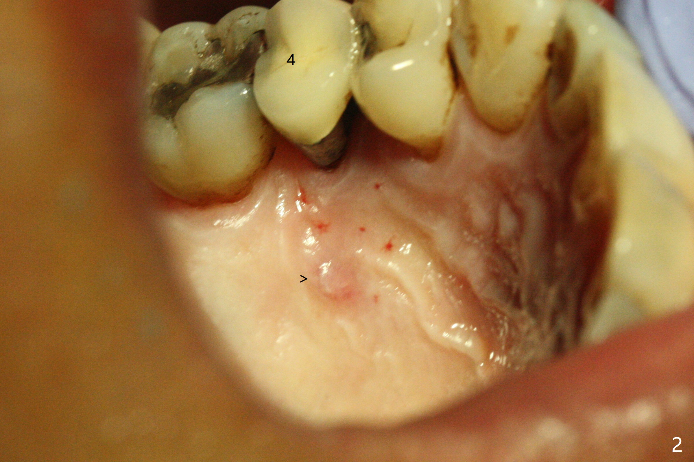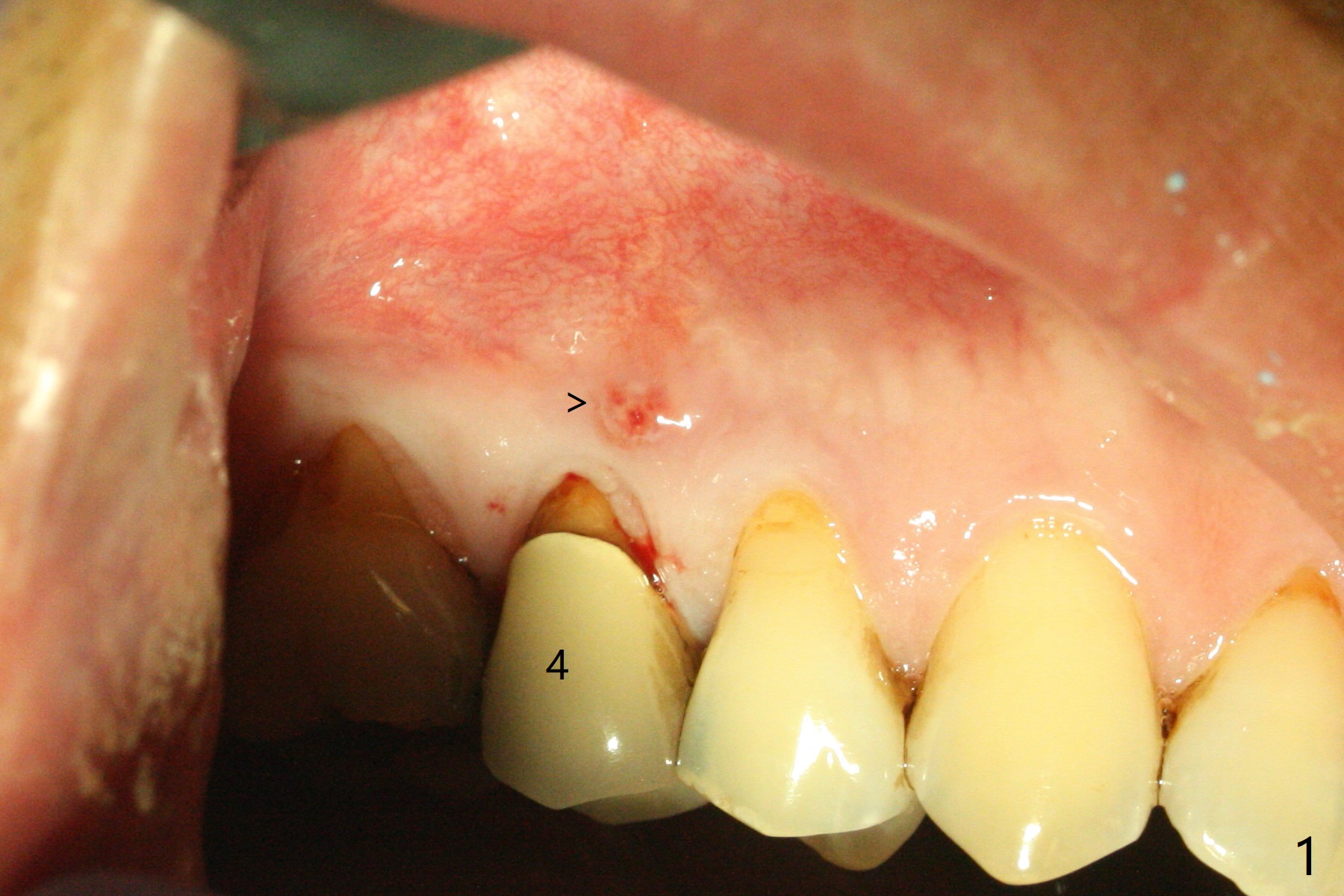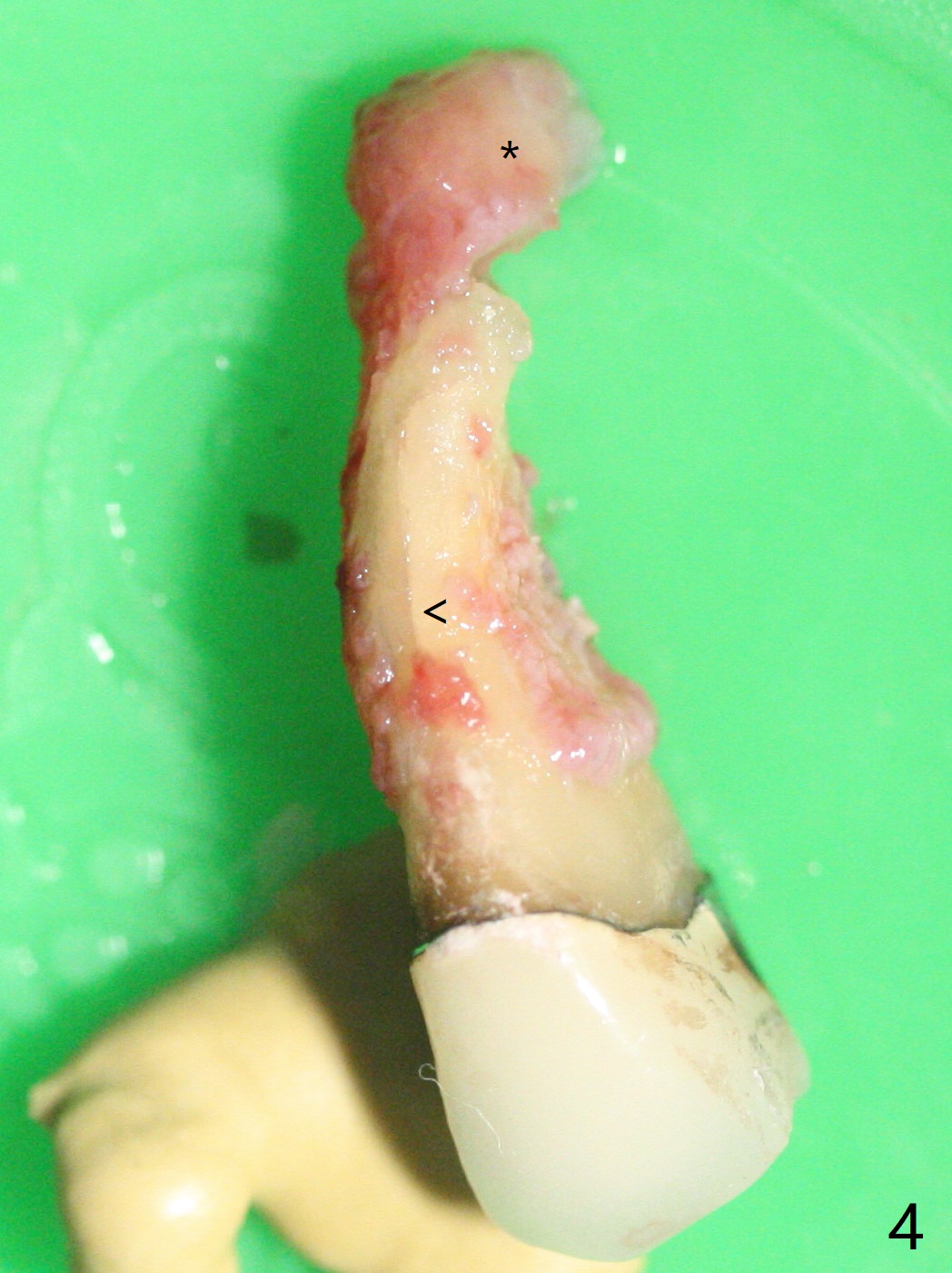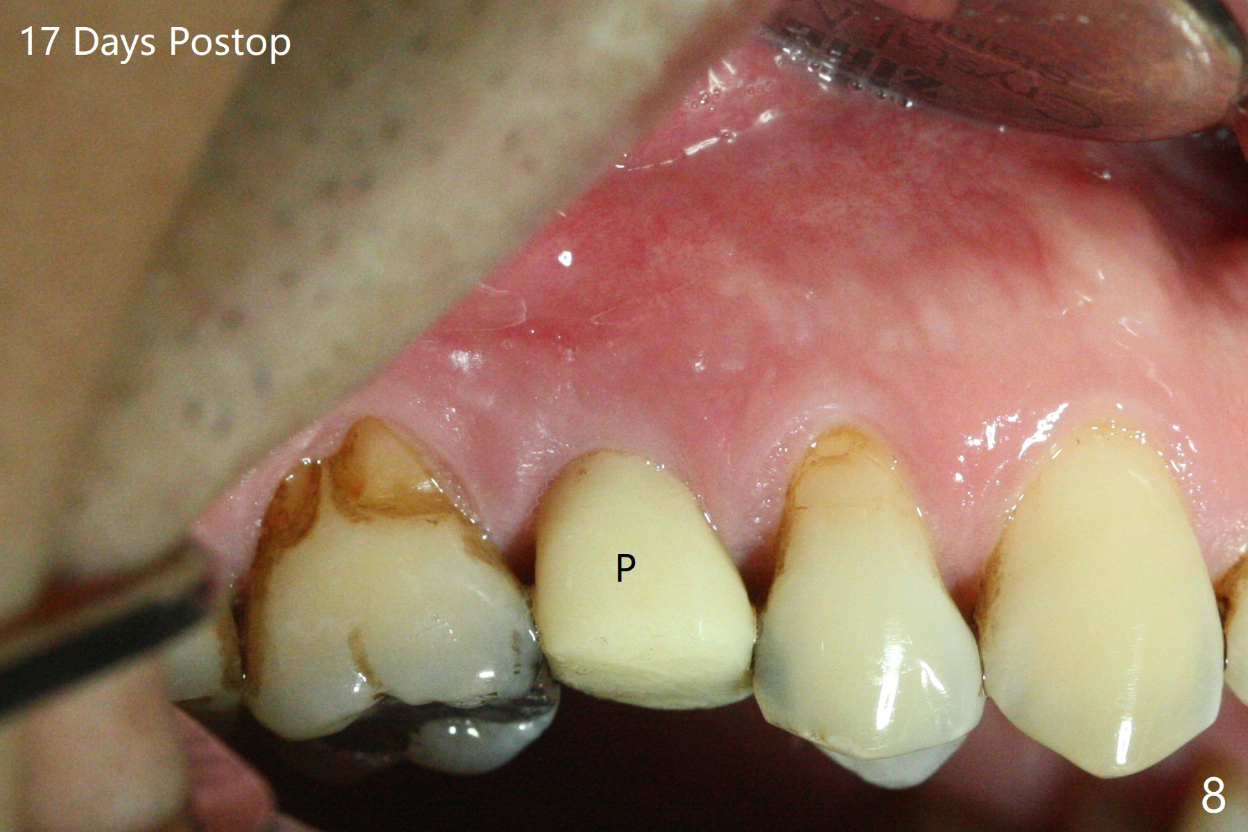 The 48-year-old man agrees to extract the tooth #4 with buccal and palatal fistulae (Fig.1,2 >) and large PARL (Fig.3 *) because of purulent discharge. The large post (Fig.3 P) is most likely associated with a longitudinal fracture. The latter is not noted until postop (Fig.4 <). Intraop finding is large amount of granulation tissue removed from the mesial apical region (Fig.3,5 *). With 10.5 mm offset, Sinus Approach Drill (19 mm) is estimated too short for sinus lift after 3x8.5 mm drill. Without careful repeated check, 2.2x10 and 2.2x11.5 mm drills are used. The sinus floor is perforated, but the membrane seems to be intact. The perforation is too small to insert PRF, but alright for allograft. Then nose blowing test shows that the sinus membrane is perforated, which seems to be repaired after placement of 2 pieces of PRF membrane, followed by another round of allograft (Fig.5 G), which is lifted by a 4x10 mm IS dummy implant. Before placement of a 4.5x11.5 mm final UF implant, allograft is placed in the 3 defective bony areas mentioned above, including the apical mesial one (Fig.6 *). But the final UF implant seems too short with non-satisfactory torque. The latter appears to be solved with the increased length of the implant (Fig.7). The gingiva around the provisional (P) is healthy without fistulae buccal (Fig.8) or palatal 17 days postop (Fig.9). A new abutment with 1 mm longer cuff is seated completely 5.5 months postop (Fig.10 < (no gap), as compared to Fig.7). The lower portion of the mesial defect seems to have been repaired (Fig.11 arrow, as compared to Fig.7). The bone in the sinus seems stable 1.5 years postop (Fig.12). There is no crestal bone loss 4 months post cementation (Fig.13). Return to Upper Premolar Immediate Implant, Trajectory II Xin Wei, DDS, PhD, MS 1st edition 09/27/2019, last revision 04/12/2021