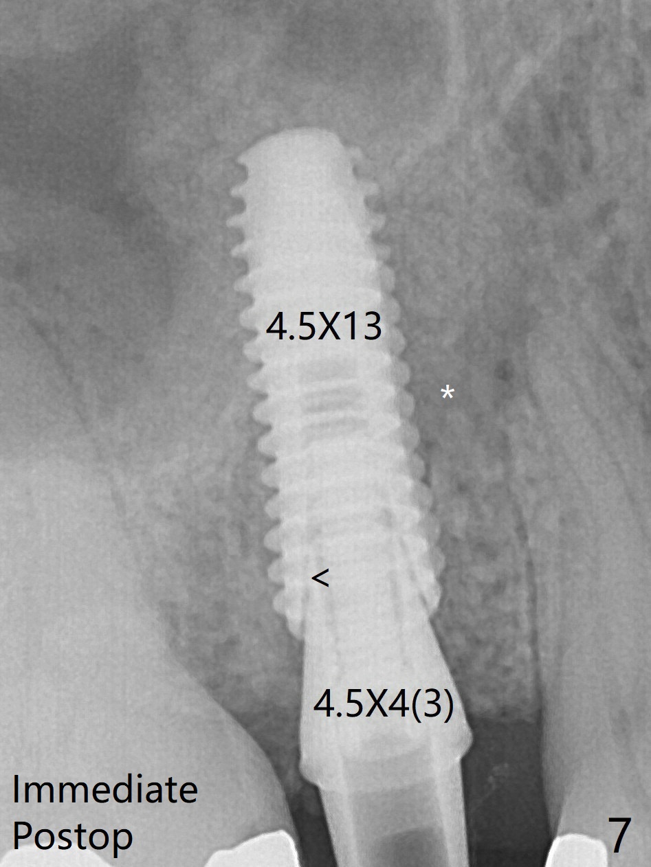 A new abutment with 1 mm longer cuff is seated completely 5.5 months postop (Fig.10 (<: no gap, as compared to Fig.7).