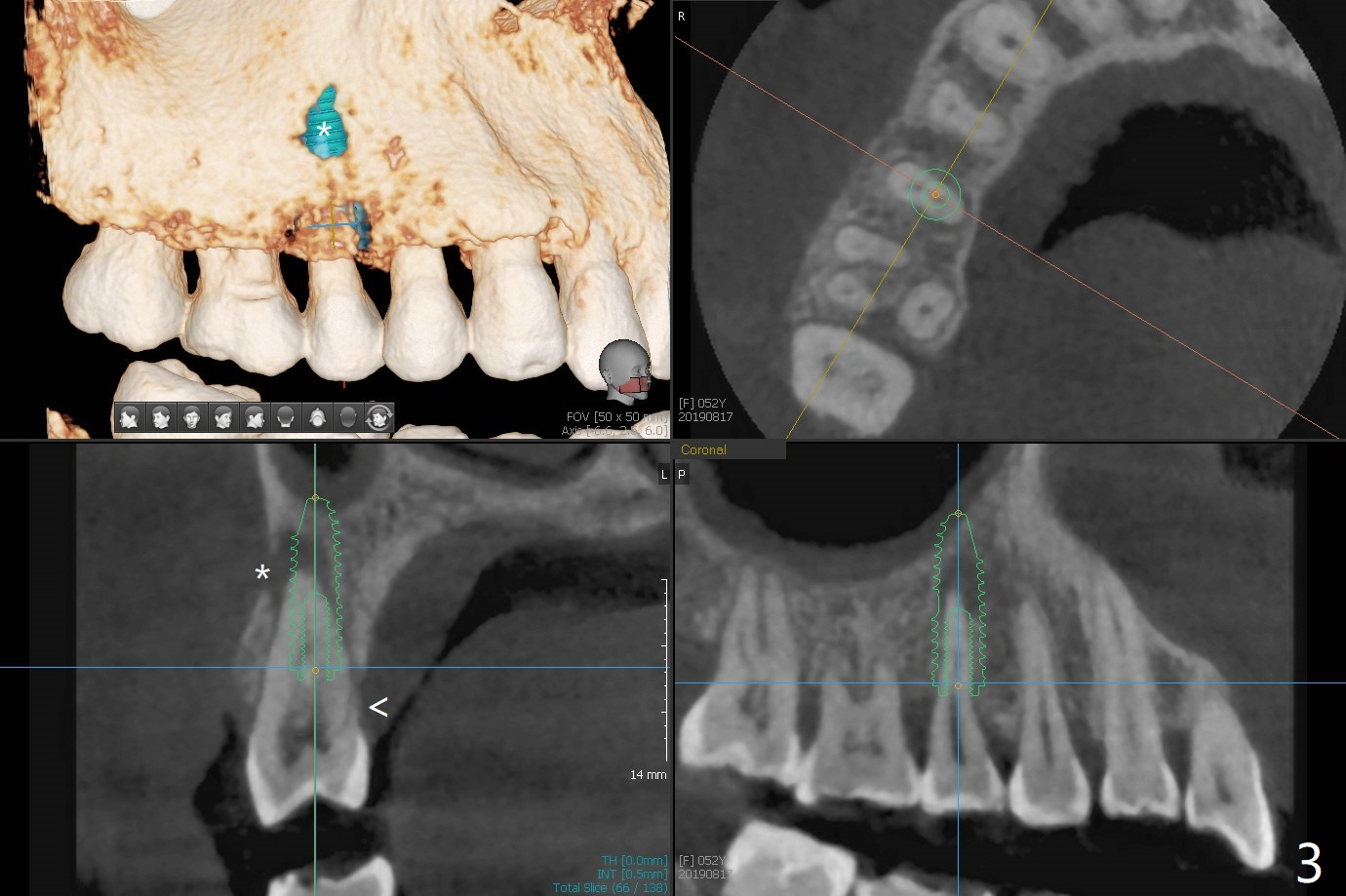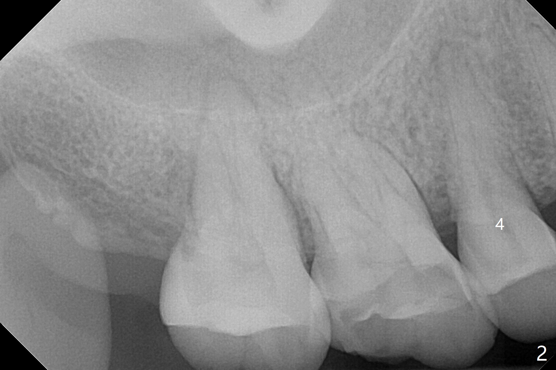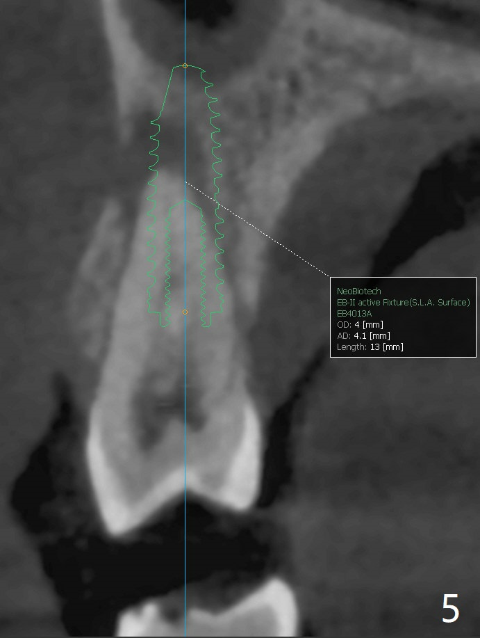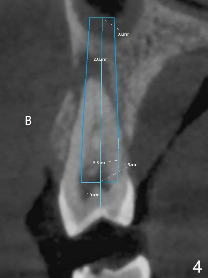 A 52-year-old woman had palatal periodontal infection at #2 a half month earlier (Fig.1,2), which was treated with Arestin. When she returns, the tooth #4 has palatal subgingival oblique fracture (Fig.3 <), interfering with mastication. Due to emergency, free hand immediate implant is planned. The buccal apical defect (Fig.3 *) will be repaired with PRF membrane (x1) and allograft after osteotomy (with gauze in place). A 4.5x20 mm tissue-level implant will be placed (Fig.4) instead of a bone-level one (Fig.5).