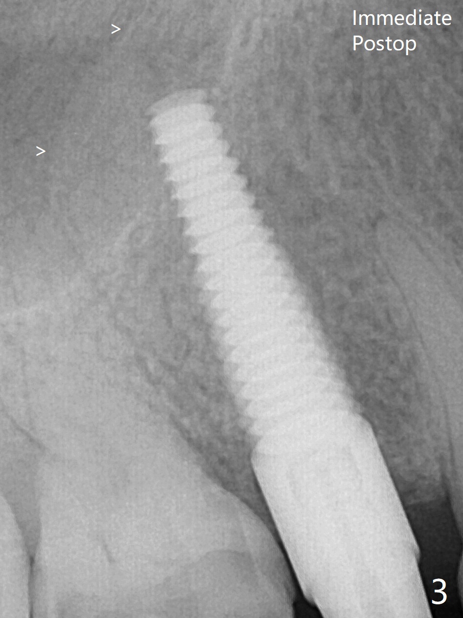 The nervous patient is not pleased with lengthened procedure and pressure from sinus lift in spite of seemingly sufficient anesthesia (Fig.3 >). Later the implant is placed deeper ~ .5 mm for restoration. The sinus floor appears to be thickened (Fig.4 > with apparently increased bone density), while the original sinus floor becomes indistinct 3.5 months postop. The unipost cannot be removed for cementation.
