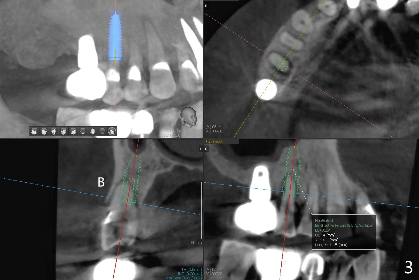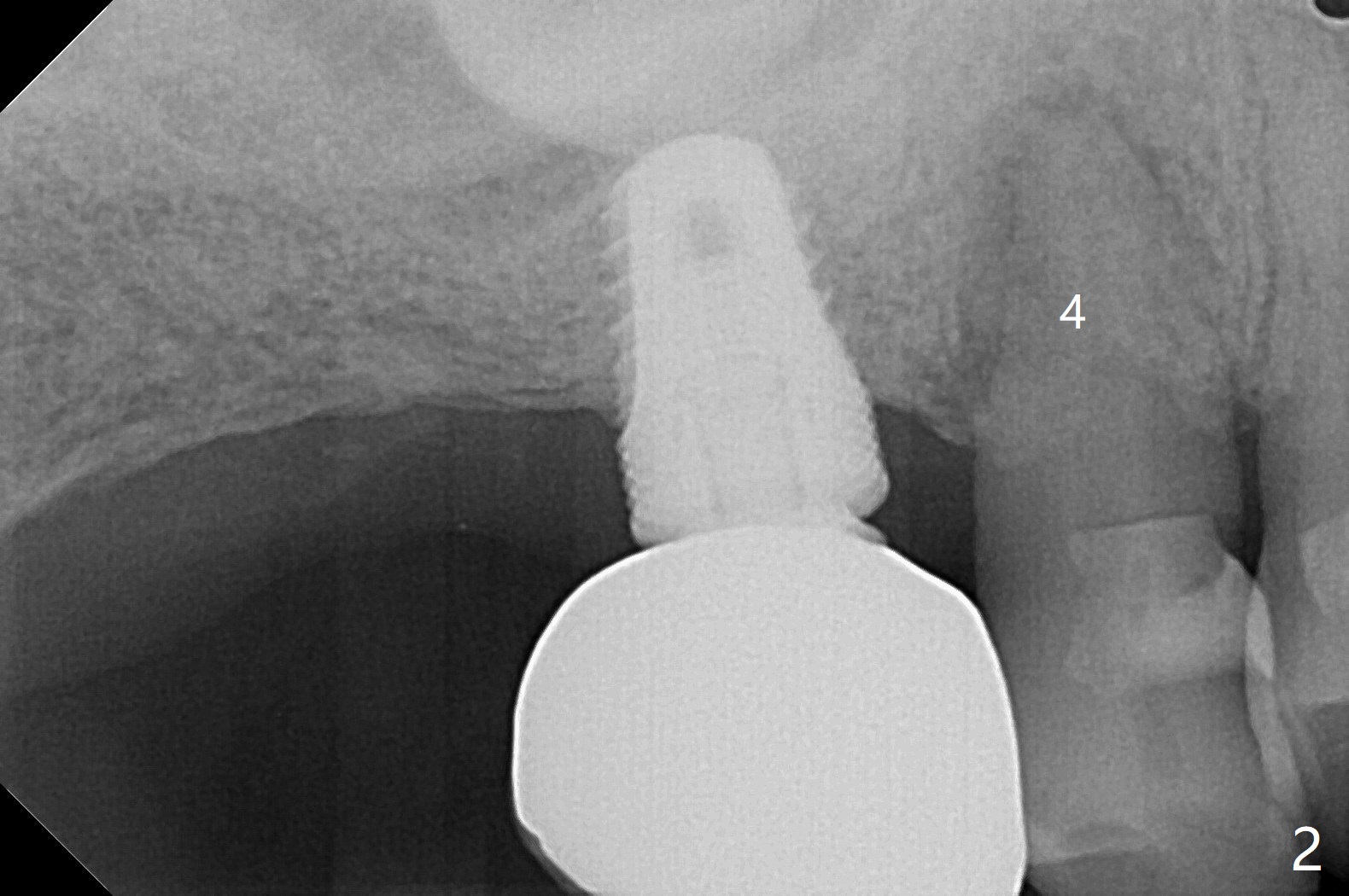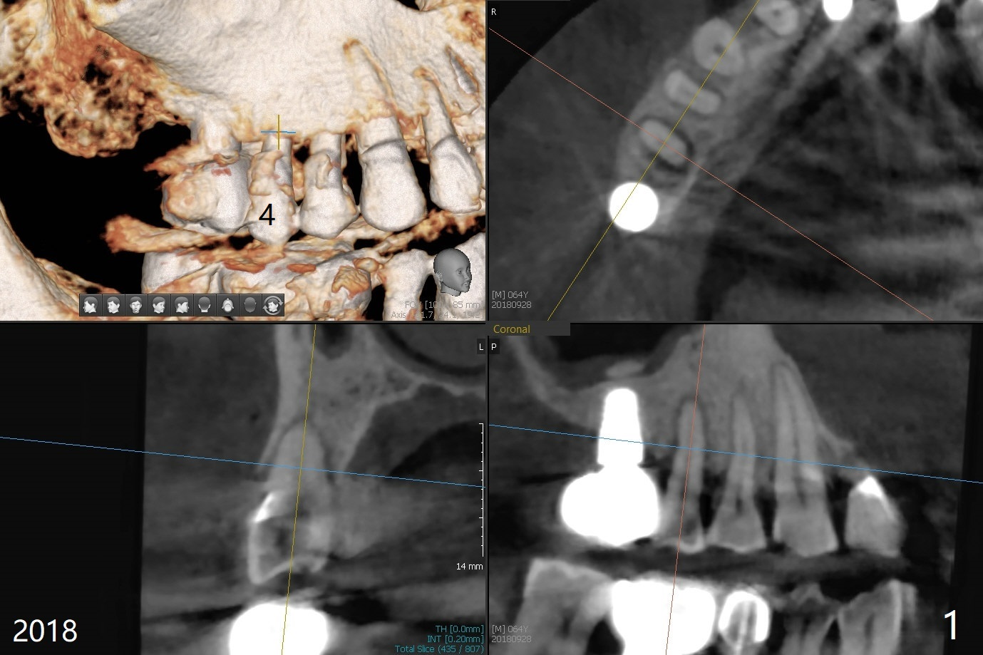 67岁男三年前CT显示4号牙牙周膜增宽(图一),最近咬到米粒中沙子突然松动(图二),要求退休前拔除种植(图三)。