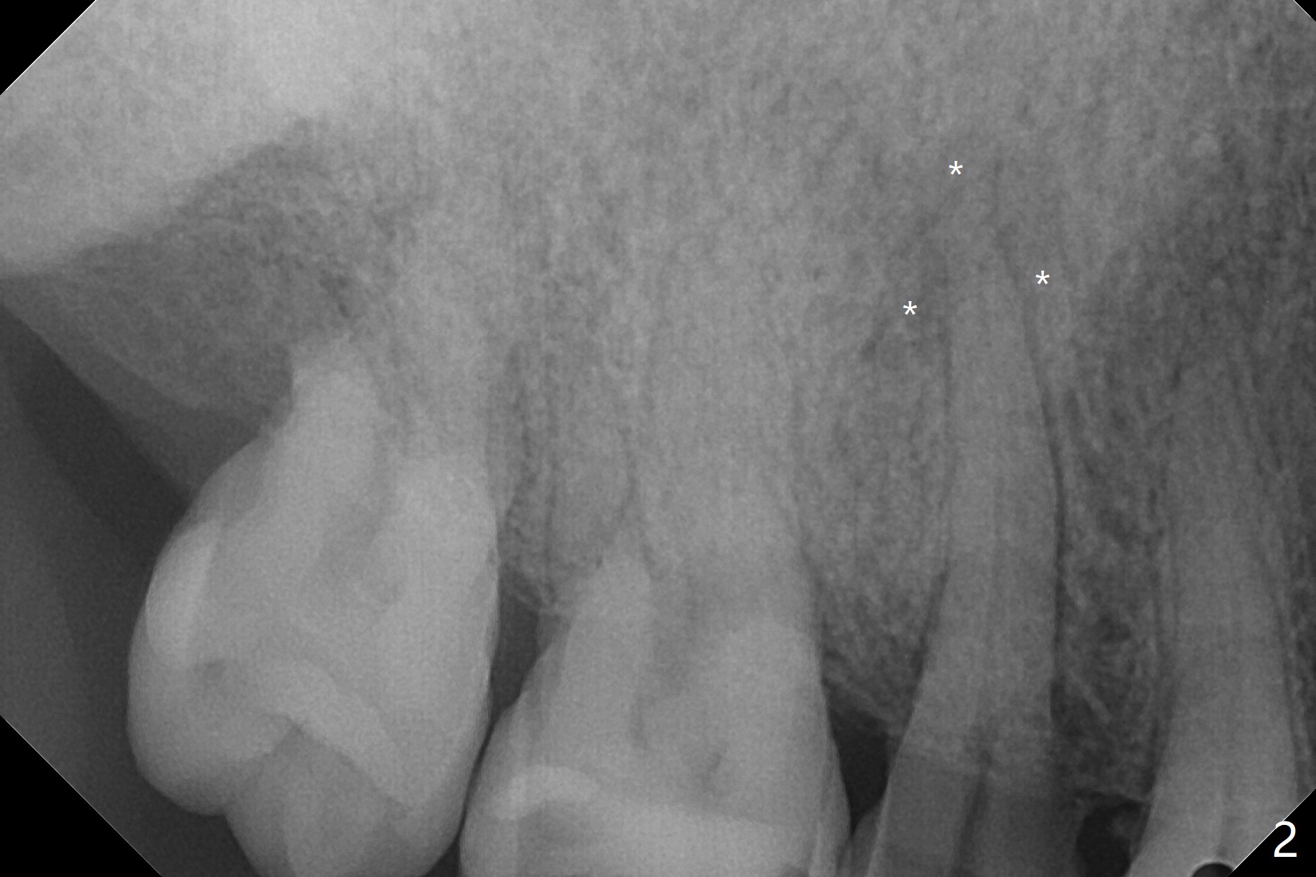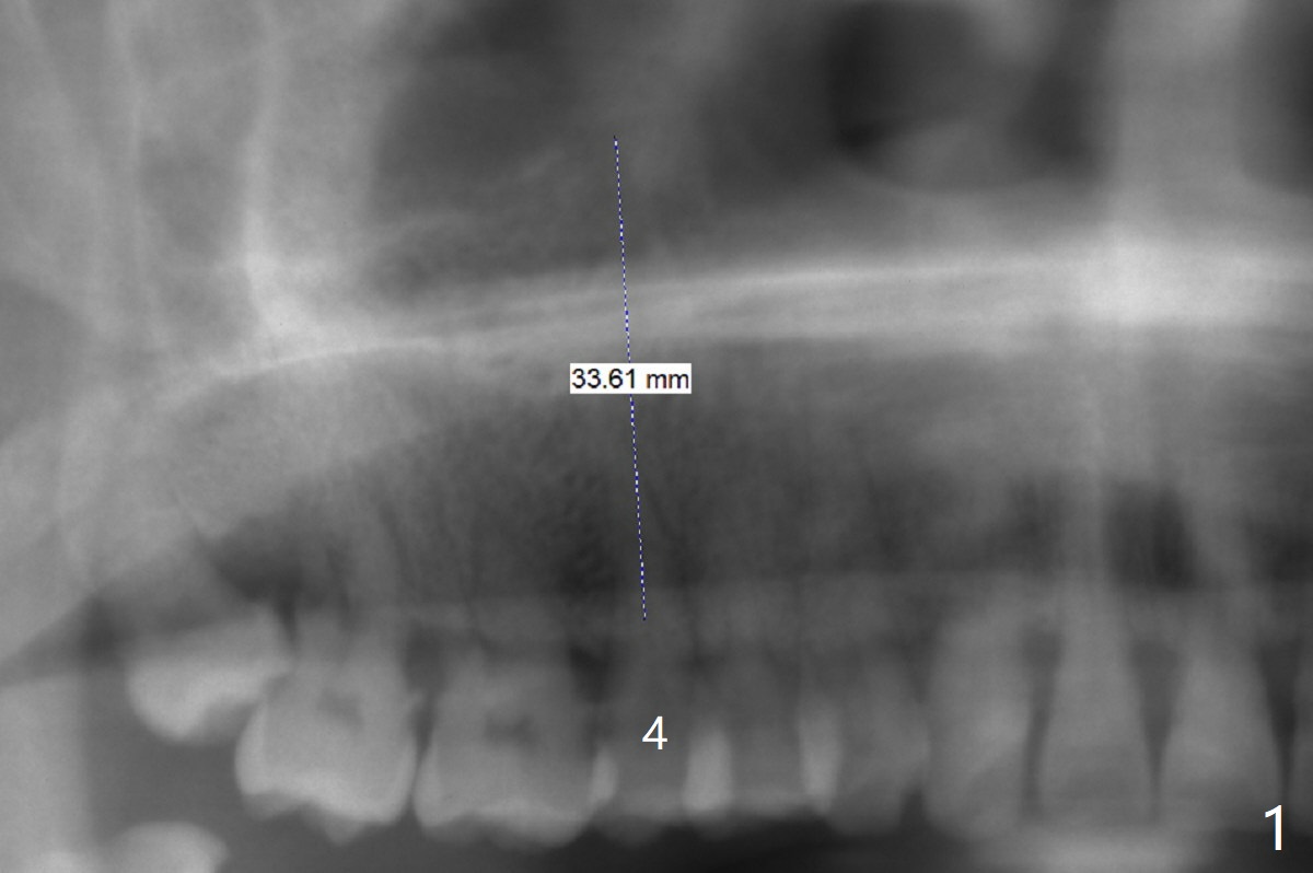 A 61-year-old man develops light pain associated with the tooth #4 with palatal subgingvial fracture (Fig.2 (*: periapical radiolucency)). Since the bone is apparent long (Fig.1), a long implant (15 mm bone level for guide, as long as 18 mm free hand or 20 mm tissue level) is to be placed for stability and early restoration. Because of palatal fracture in association with bone loss, the implant will be not placed too palatal. In fact the patient chooses to save the tooth with RCT.