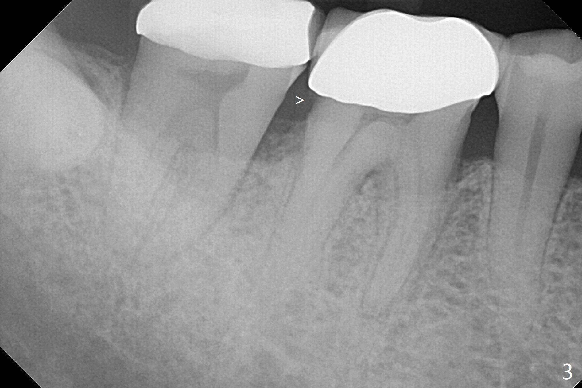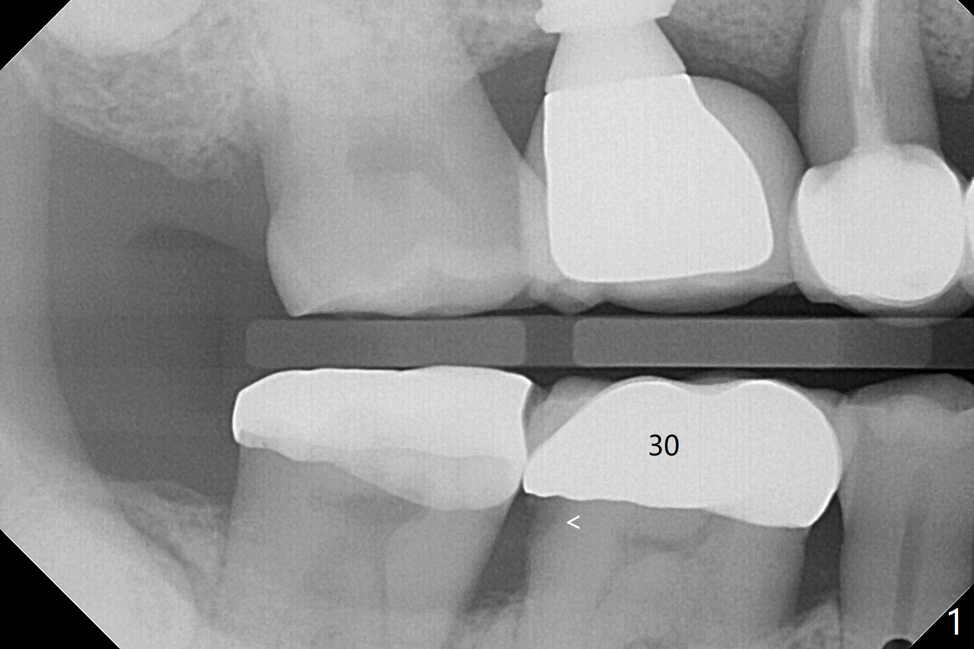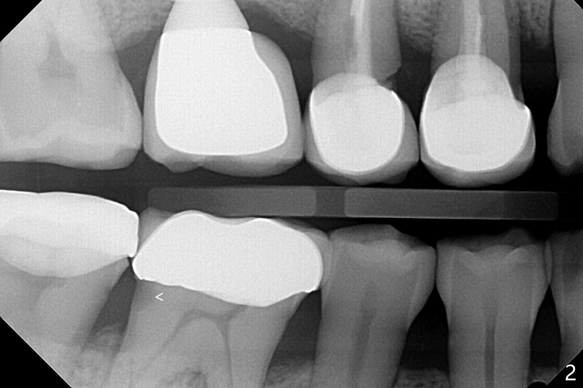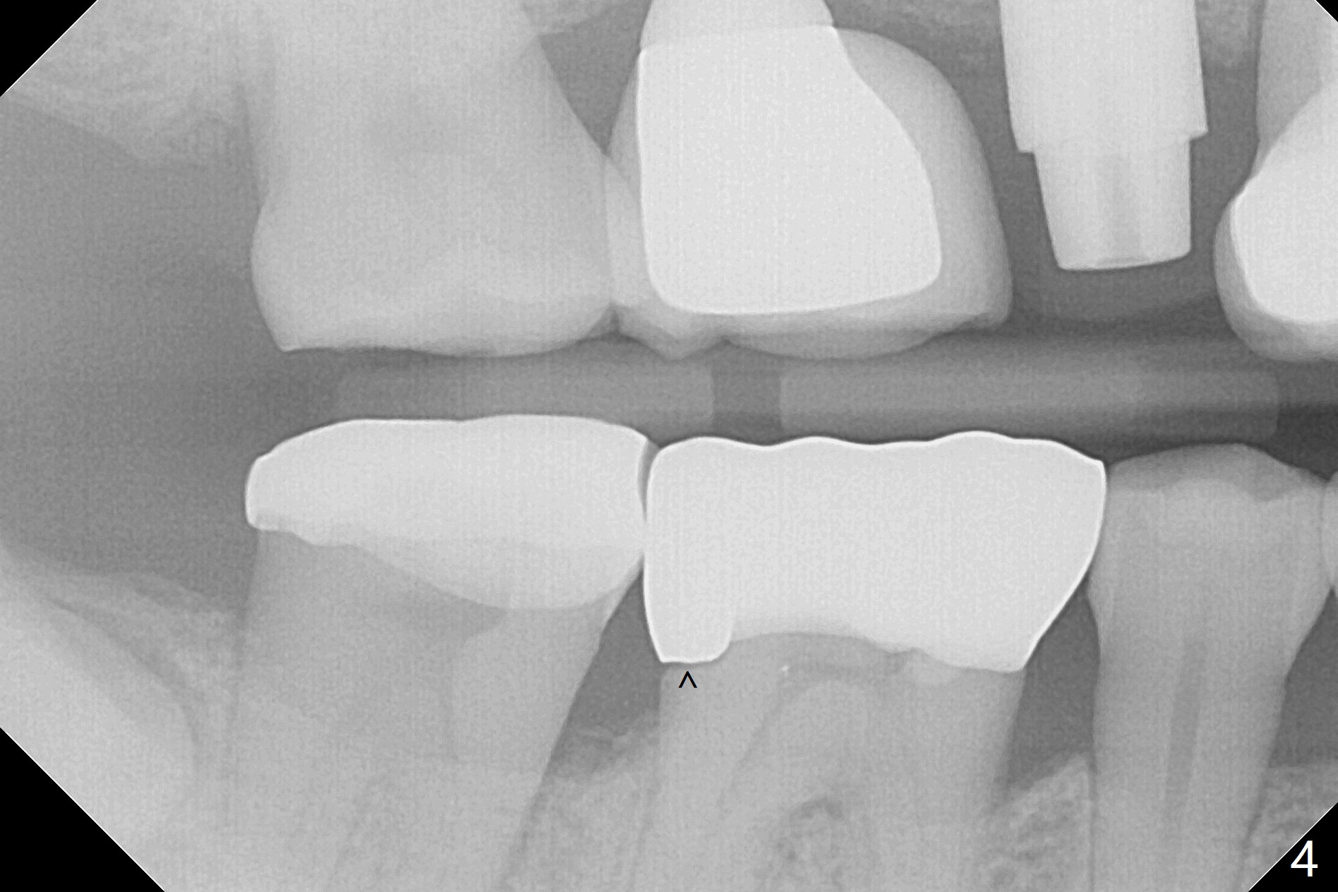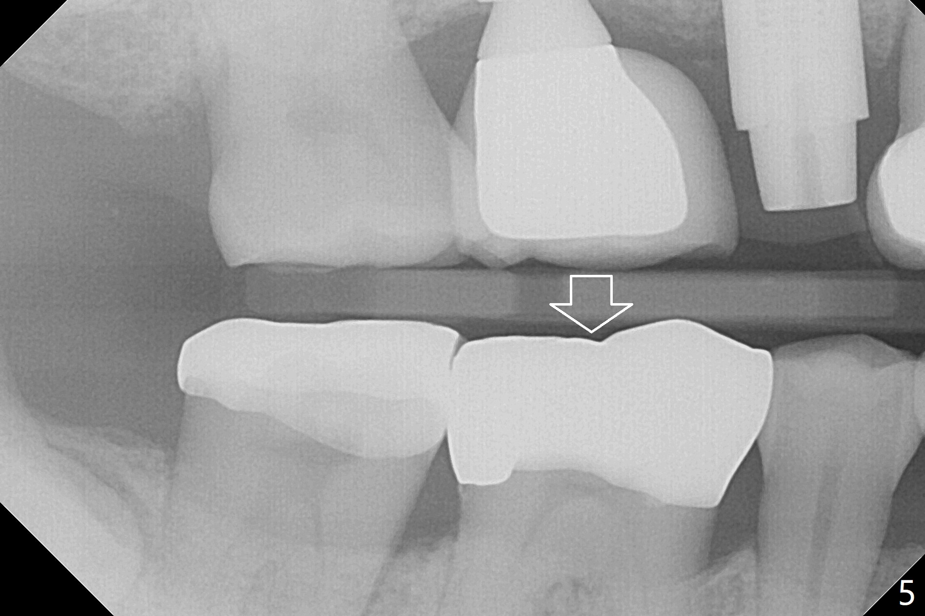 A 53-year-old man returns for #30 crown redo with distal open margin (Fig.1-3 arrowhead) after #4 implant. In addition to the distal margin caries, there is buccal one after removal of the existing crown. Composite build up is done for the buccal cavitation, whereas heavy chamfer margin is prepared distal. BW is taken immediately before cementation with open margin (Fig.4 ^). The latter disappears when the crown is cemented with pressure (Fig.5 arrow).