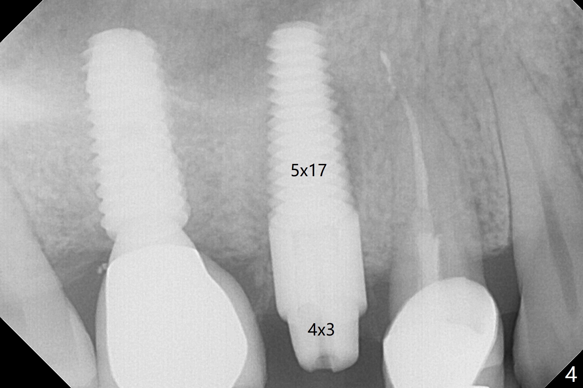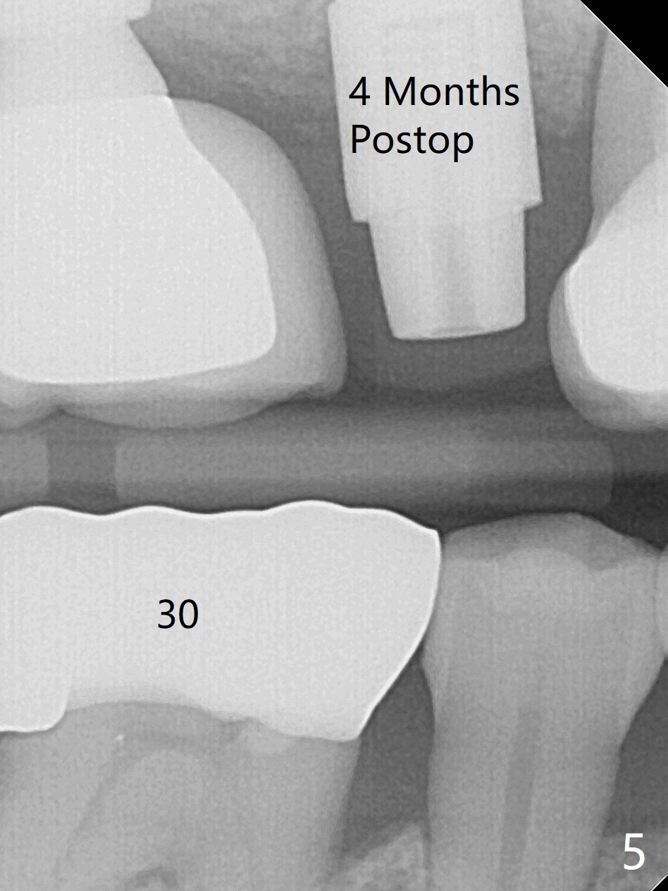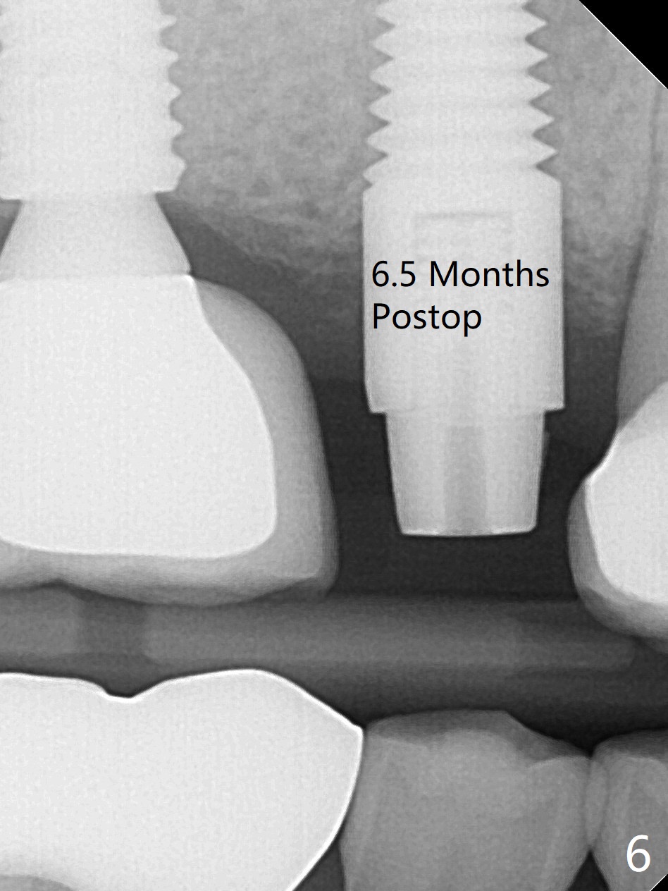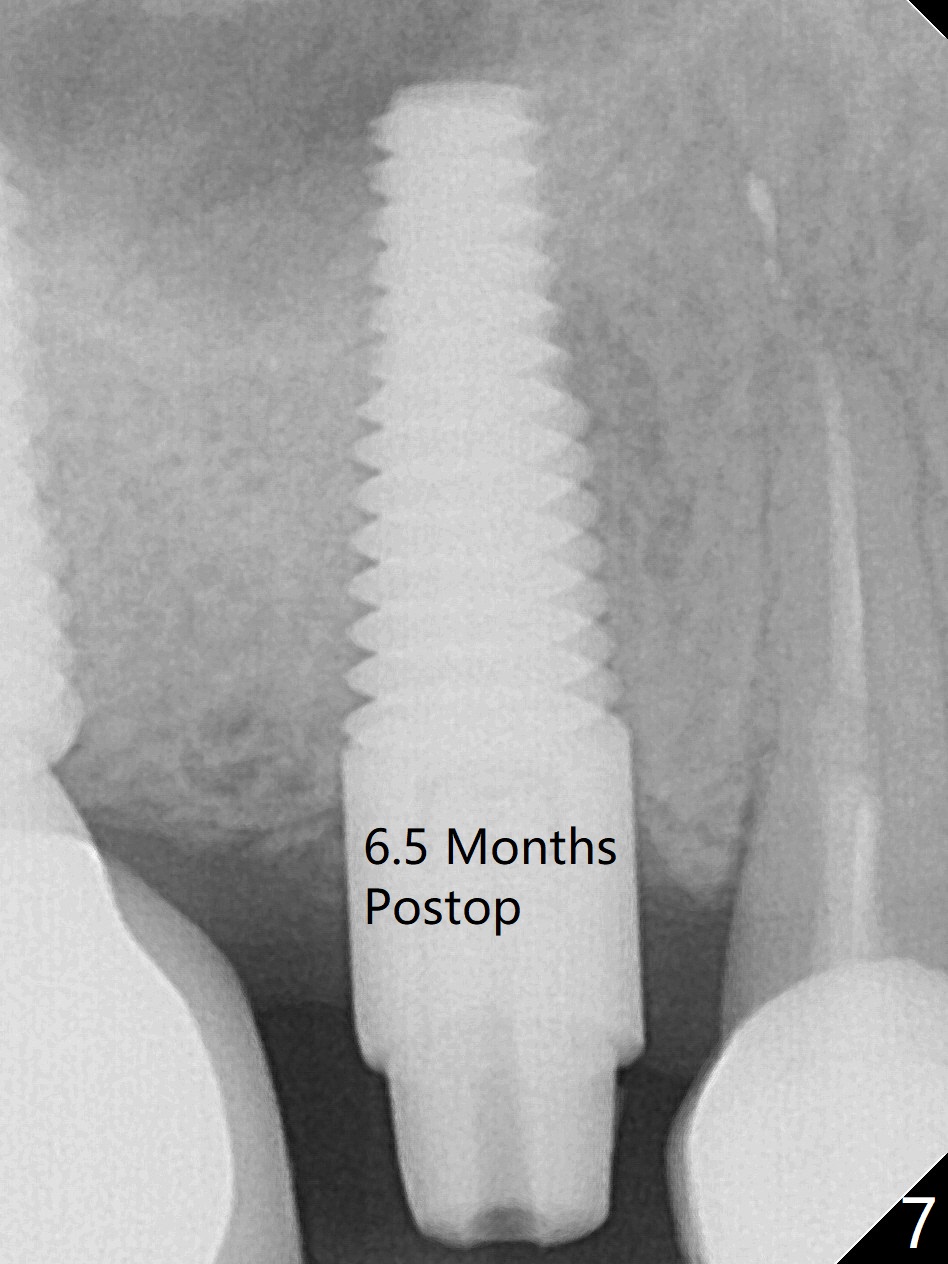 In spite of a fistula at #4, the buccal plate is present because of the exostosis (Fig.1 *). Since the socket is long and narrow, it is difficult to initiate osteotomy in the distal slope. Since the buccal plate is low, osteotomy is established as palatal as possible. The sinus floor is thin, but hard to elevate with Magic Sinus Lifter. Use of 3 mm Magic Expander leads to sinus floor break through and membrane perforation. After increase in the osteotomy with sequential expanders, a 5x20 mm tap is inserted with stability (Fig.2). Two pieces of PRF membrane are inserted for sinus membrane repair, followed by small amount of allograft (mixed with PRF, Fig.3 *) and a 4.5x17 mm dummy implant. A 5x17 mm tissue level implant is placed with >45 Ncm; with immediate placement of a 4x3 mm abutment (Fig.4), an immediate provisional is fabricated. There is no postop nasal hemorrhage. The immediate provisional has occlusal perforation 1.5 months postop. The tooth #13 has mobility due to its overuse and missing the teeth #14 and 18. Bitewing taken while redoing crown for #30 shows that the implant threads are subcrestal (Fig.5). There is no crestal bone resorption 6.5 months postop (Fig.6,7), while the periradicular radiolucency decreases (Fig.7).