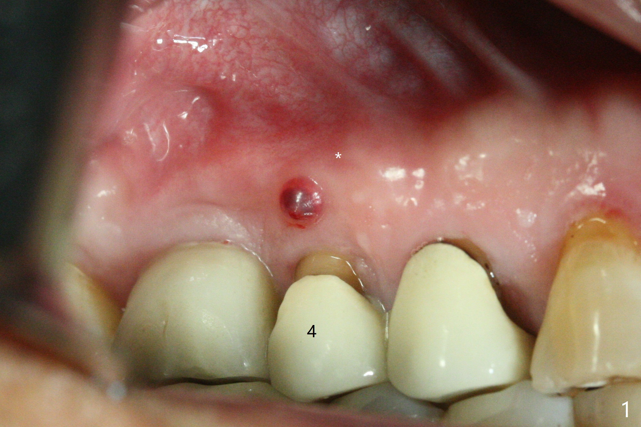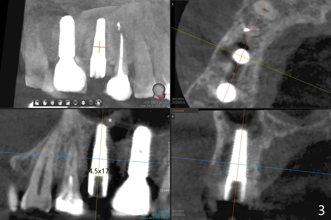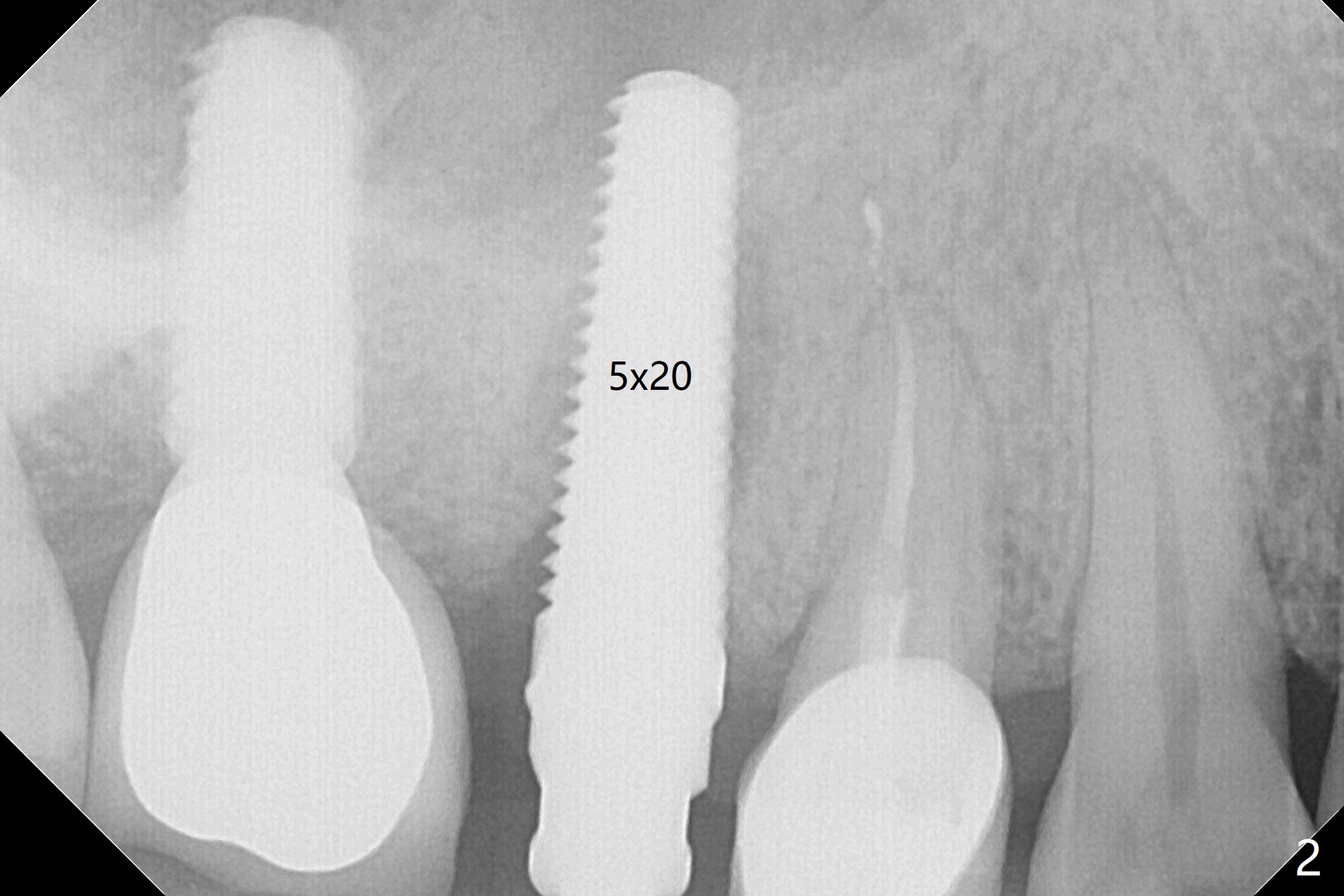 In spite of a fistula at #4, the buccal plate is present because of the exostosis (Fig.1 *). Since the socket is long and narrow, it is difficult to initiate osteotomy in the distal slope. Since the buccal plate is low, osteotomy is established as palatal as possible. The sinus floor is thin, but hard to elevate with Magic Sinus Lifter. Use of 3 mm Magic Expander leads to sinus floor break through and membrane perforation. After increase in the osteotomy with sequential expanders, a 5x20 mm tap is inserted with stability (Fig.2). Two pieces of PRF membrane are inserted for sinus membrane repair, followed by small amount of allograft (mixed with PRF, Fig.3 *) and a 4.5x17 mm dummy implant. A 5x17 mm tissue level implant is placed with >45 Ncm; with immediate placement of a 4x3 mm abutment (Fig.4), an immediate provisional is fabricated. There is no postop nasal hemorrhage. The immediate provisional has occlusal perforation 1.5 months postop. The tooth #13 has mobility due to its overuse and missing the teeth #14 and 18. Bitewing taken while redoing crown for #30 shows that the implant threads are subcrestal (Fig.5). There is no crestal bone resorption 6.5 months postop (Fig.6,7), while the periradicular radiolucency decreases (Fig.7).