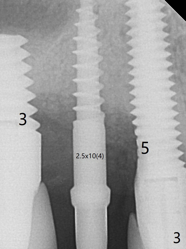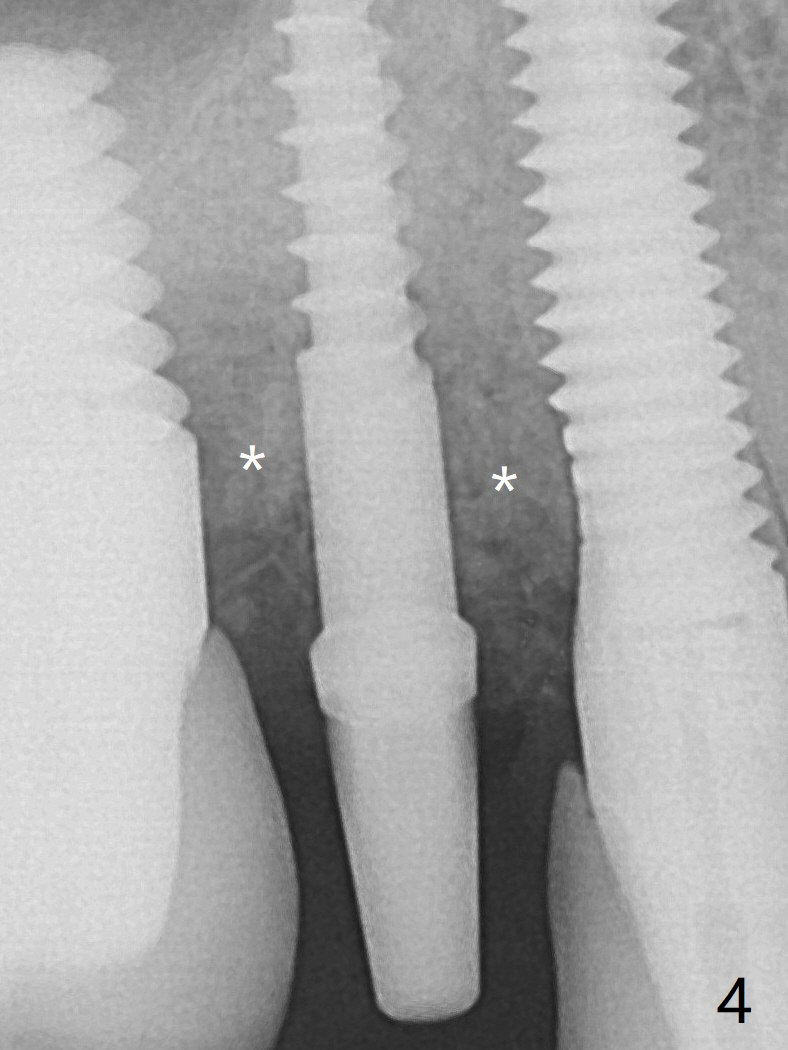 A 2.5x10(4) mm 1-piece implant is placed with <50 Ncm; since the trimmed implant threads at #5 are exposed (Fig.3), Vanilla graft with Osteogen is placed mesial and distal to the new small implant (Fig.4 *). The mesial, coronal implant threads at #3, uncovered by the bone (Fig.3), are not exposed by the incision directly, but the bone graft appears to contact them. There is no bone loss 3.5 months postop (Fig.5,6) or 4 months post cementation (8 months post cementation, Fig.8,9). There is no sign of periimplantitis. The implant remains mobile and symptomatic (chewing pain) 14 months post cementation (Fig.10).