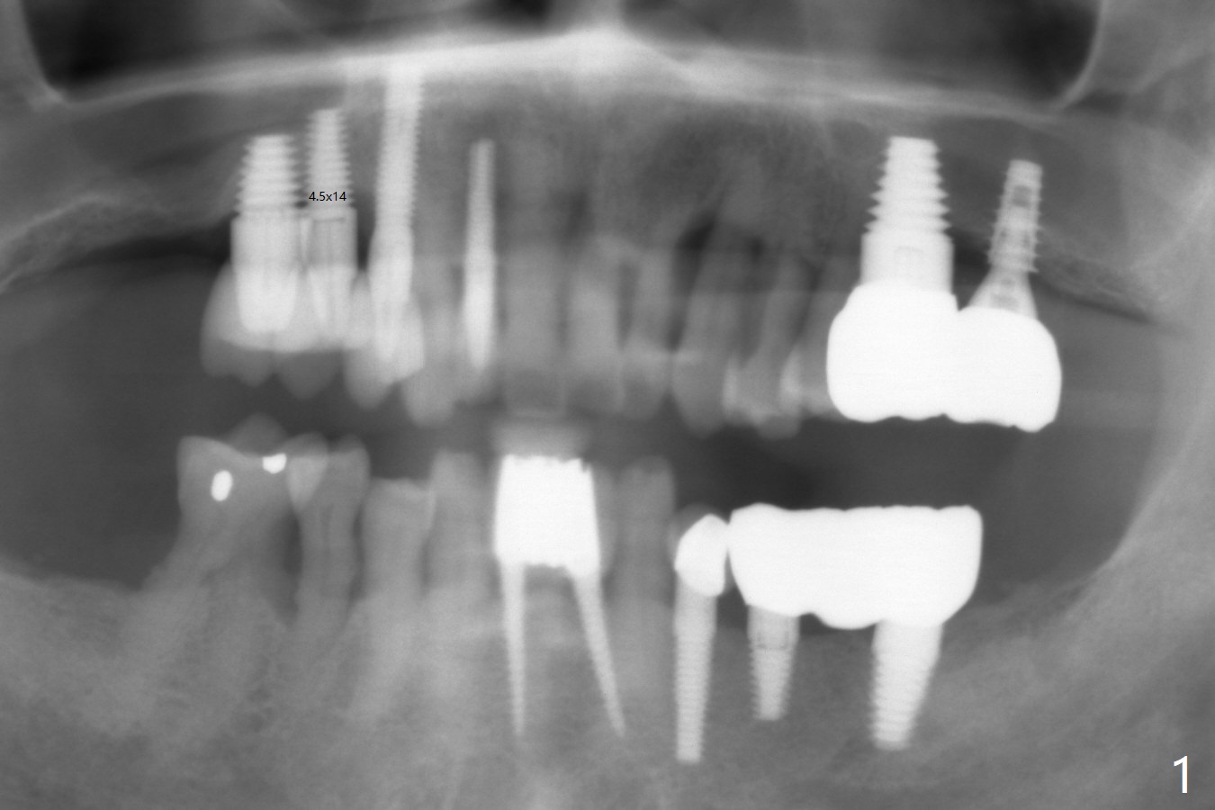A 60-year-old man develops periimplantitis at #3-5 (Fig.1). After failure of two rounds of bone graft, the implant at #4 is removed with bone graft 3.5 months earlier. The infection resolves. Before the implant removal, there is no gingiva between #4 and 5. It appears that these 3 implants are placed too close to each other and/or they are too large. To prevent recurrent infection, a 2.5 or 3.0 mm implant will be placed. Take preop PA. Incision will be made. If the bone is narrow buccopalatally, use 1 and 1.5 mm microosteotomes to initiate osteotomy. Also prepare Tatum 1- and 2-piece implants (3.5 mm).
