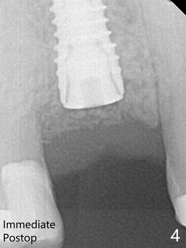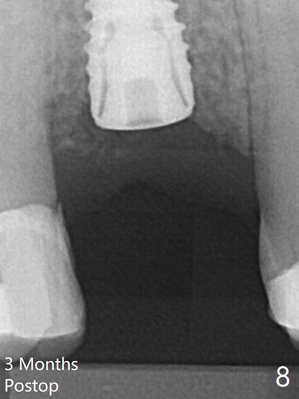 术后三个月根尖片显示骨粉减少(图八)。不可吸收膜脱落可能造成骨粉流失。应该做减张缝合。树脂敷料,而不是牙周敷料。其实缝合压扁骨粉,愈合或者细长的修复基台有支撑,减张作用。后面讨论。中央血供不够,伤口裂开。周围骨粉能成活就好。
