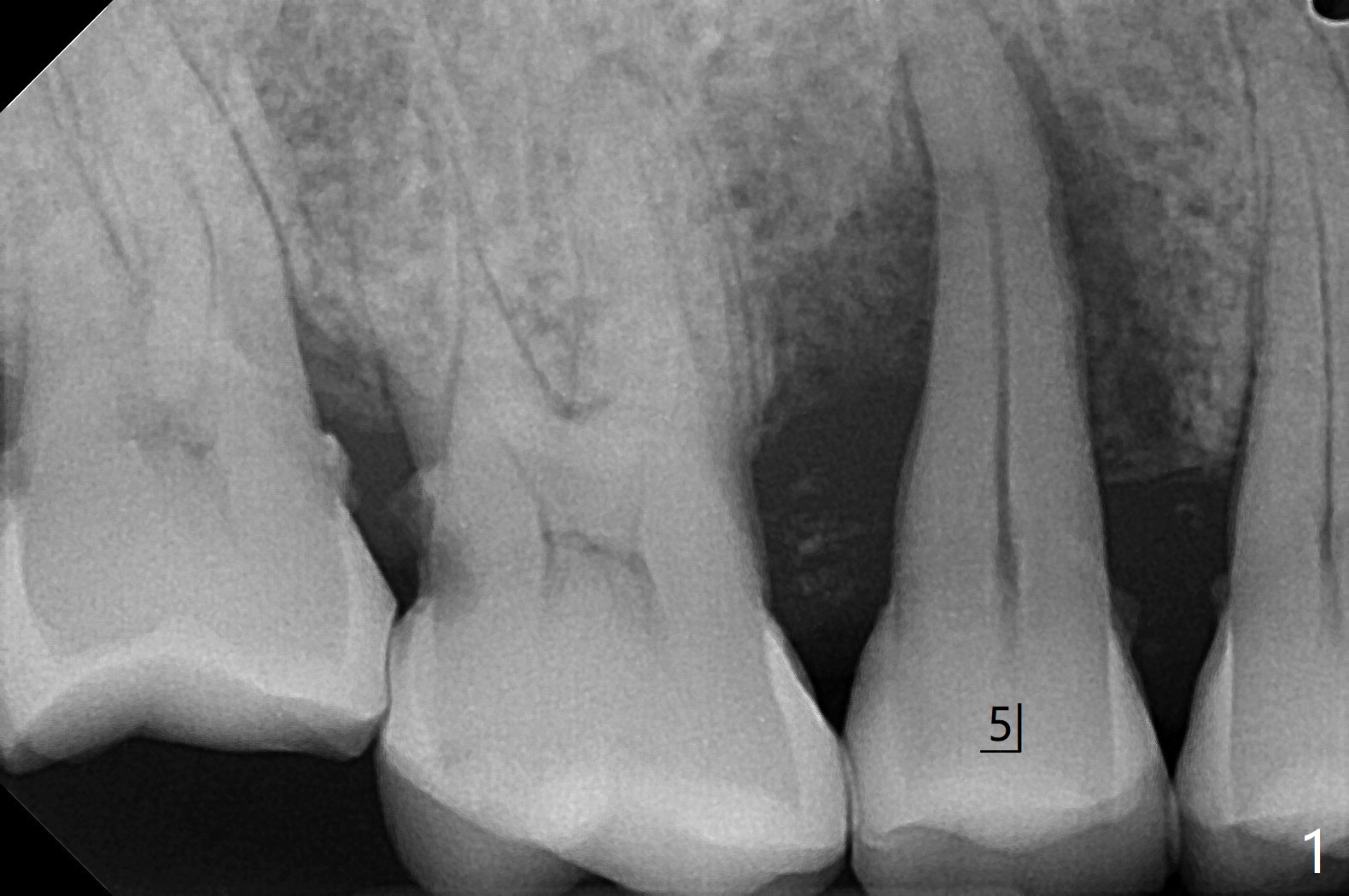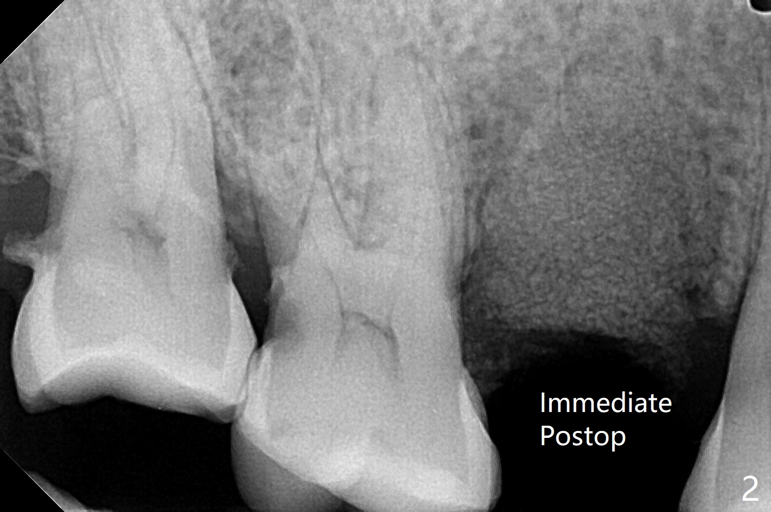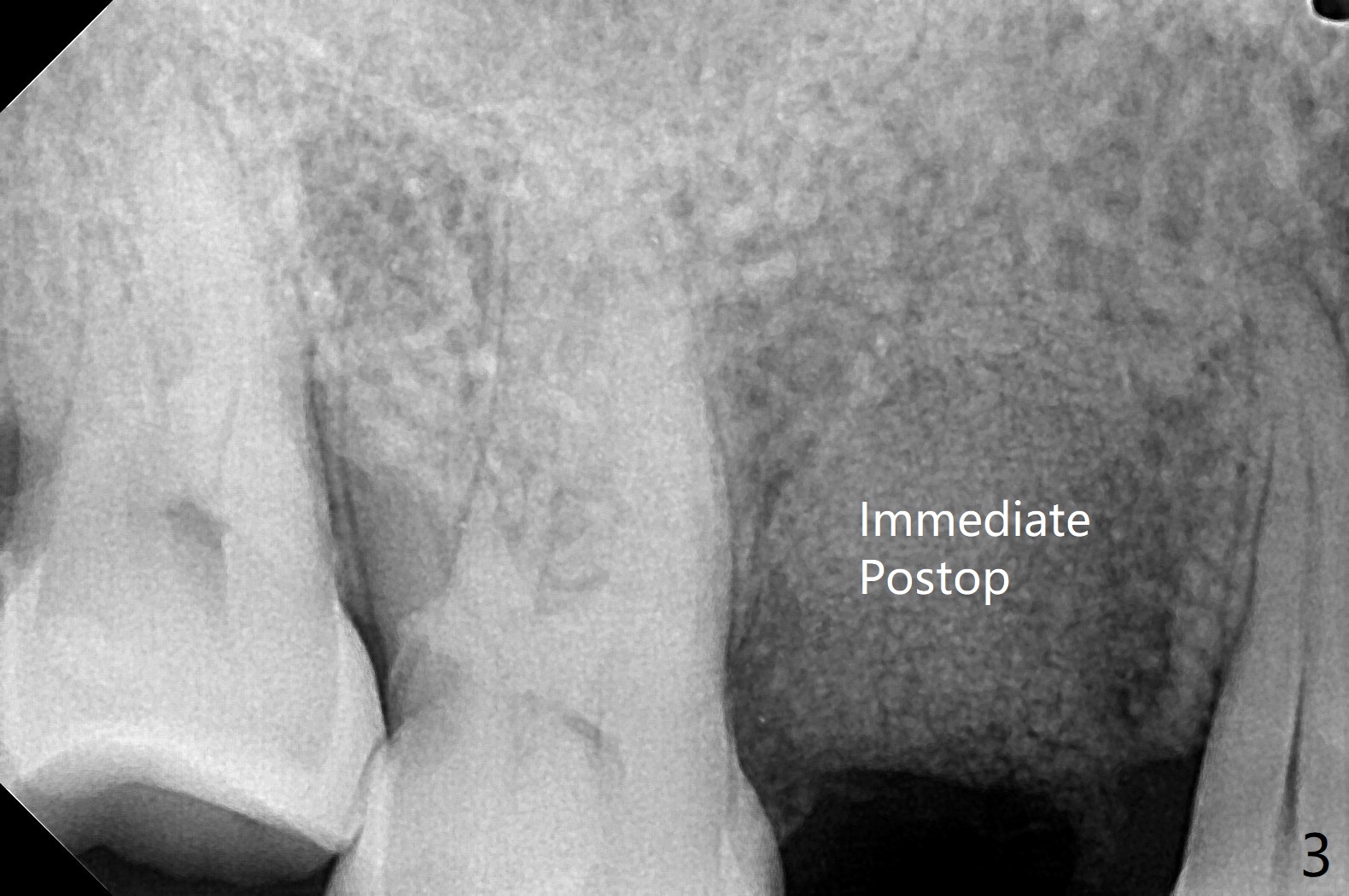 61岁女,右下六缺失,要求拔除纵裂右上五(图一:舌侧部分松动),刮除大量肉芽组织后,植入皮质骨骨粉(图二,三),覆盖6个月吸收膜,4-0 PGA 缝线,牙周敷料。
