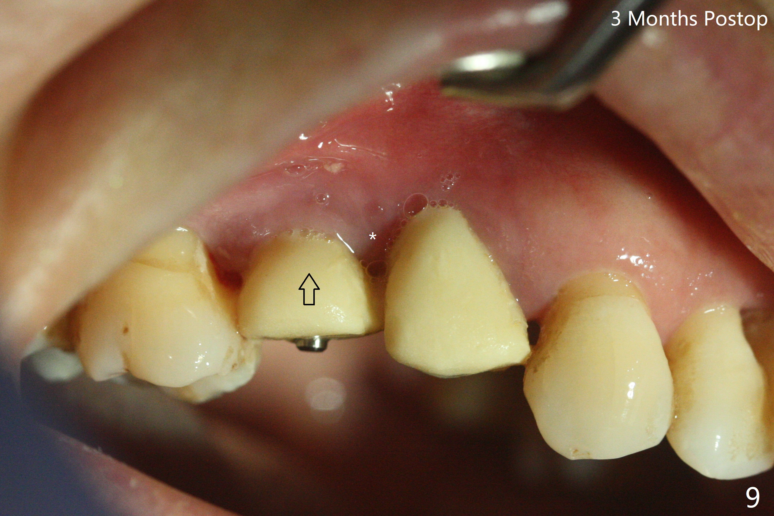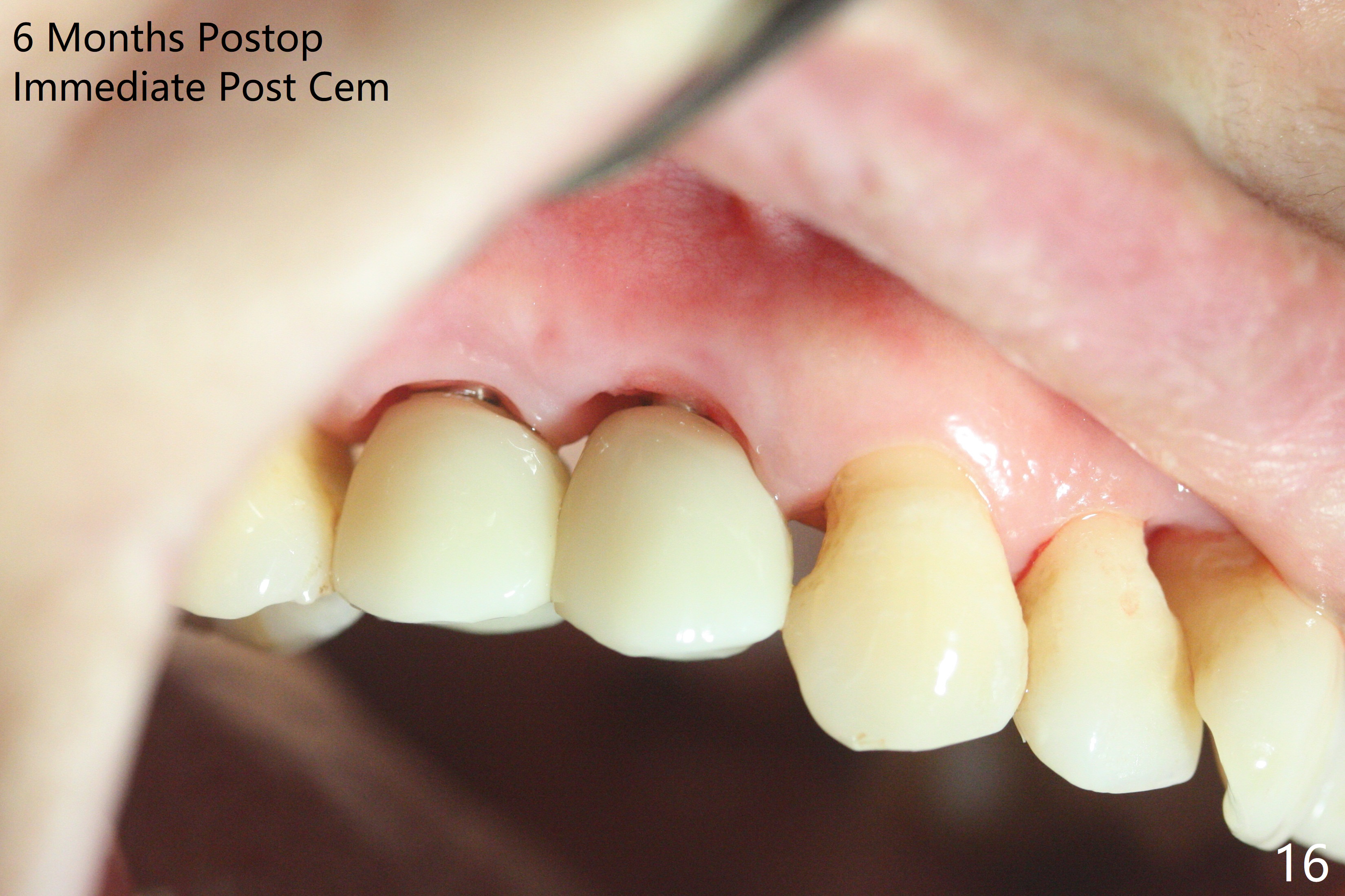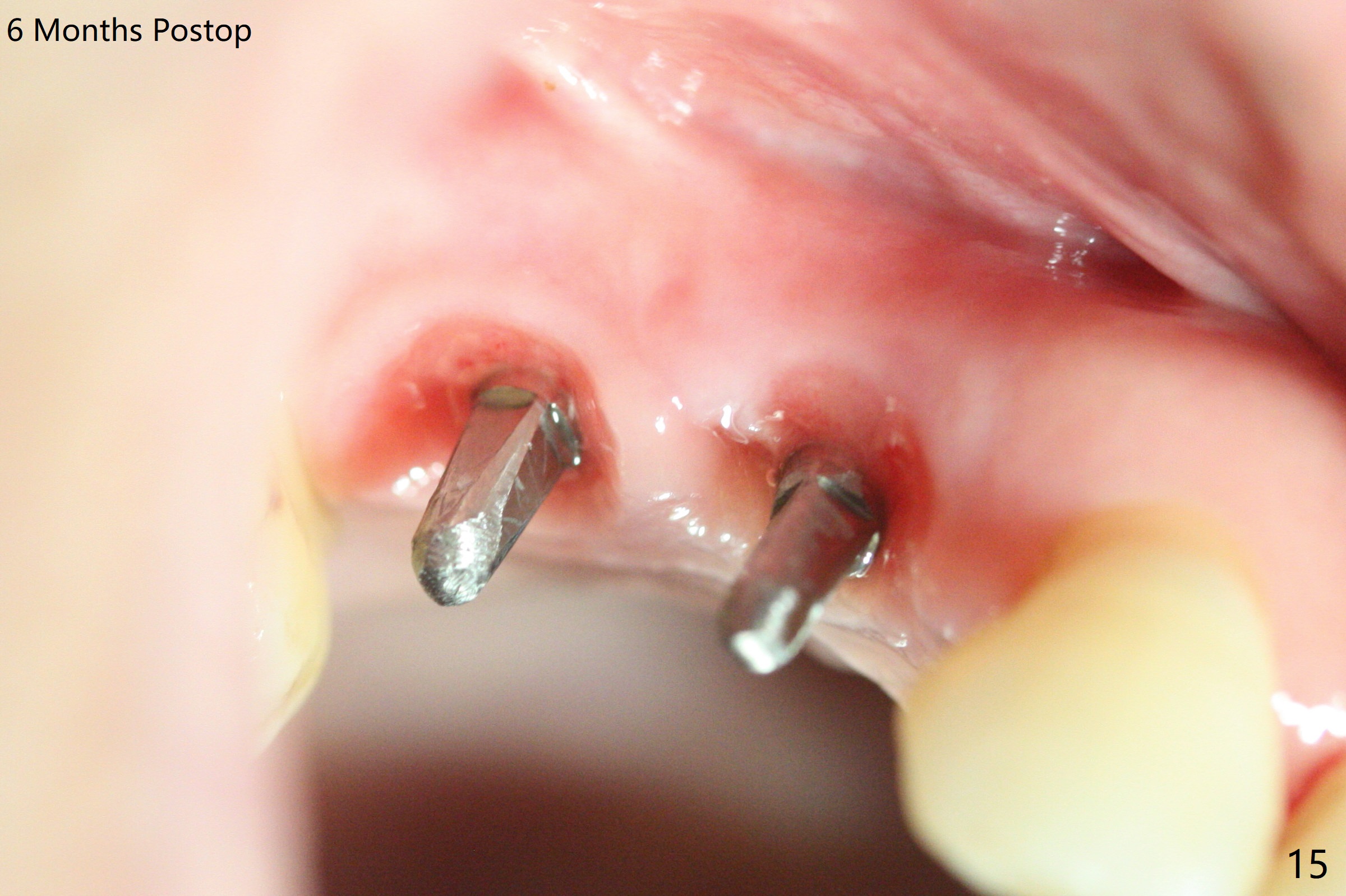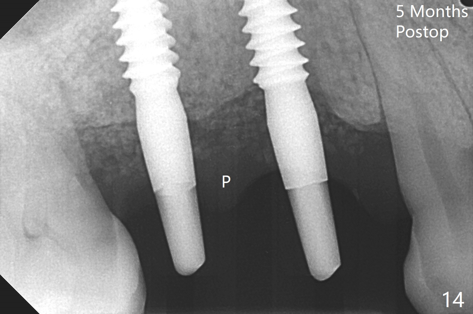 术前CT显示右上4牙槽骨比5窄(图一,二),3.5毫米植体比较合适,况且牙龈厚,基台长的一段式植体显得得当。为了取得最好的植体方位,4先拔除(图三),种植(图四),调整后者深度后,拔除5(术前征求病人同意),开始钻洞(图五),完成种植(图六)。粘性骨粉不仅放置于植体周围,而且6牙根近中(图七),4/5牙槽嵴和龈乳头(P)之间,减少术后龈乳头萎缩(图八:*)。制作两个分开临时牙冠,有利于维持龈乳头。对于病人来说,临时牙冠帮助咀嚼,而对侧拔牙创无法吃饭。术后3个月两个分开临时牙冠(其中一个龈方移位(图九:箭头)保持龈乳头(*)和牙龈外形(图十:*)。临时牙冠取出后,调整基台高度,少量钛屑(不妨大局)附着在健康的牙龈沟(图十一),再次显示两个基台之间龈乳头(图十二:*),衬里,修整的临时牙冠又插回牙龈沟(图十三:箭头),继续维持软组织形态,准备一个月后,调整基台边缘(图十二:箭头),取模。术后五个月大部分骨粉依然保留在植体和邻牙周围,龈乳头退缩不多(图十四: P)。三个月后(术后六个月)钛削无影无踪(图十五,与图十一对比))。永久性牙冠周围空间慢慢会消失(图十六,使用临时性胶水)。