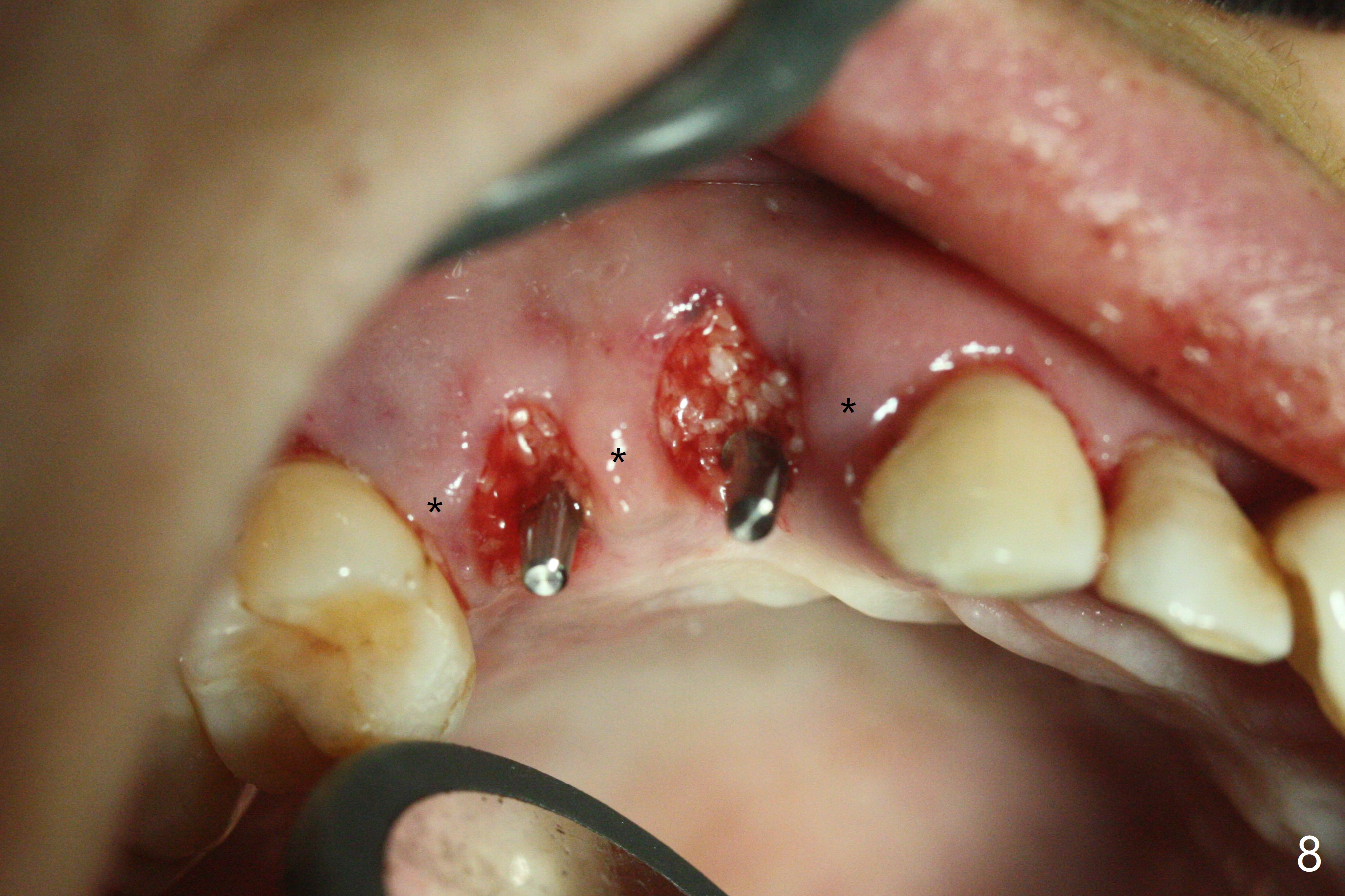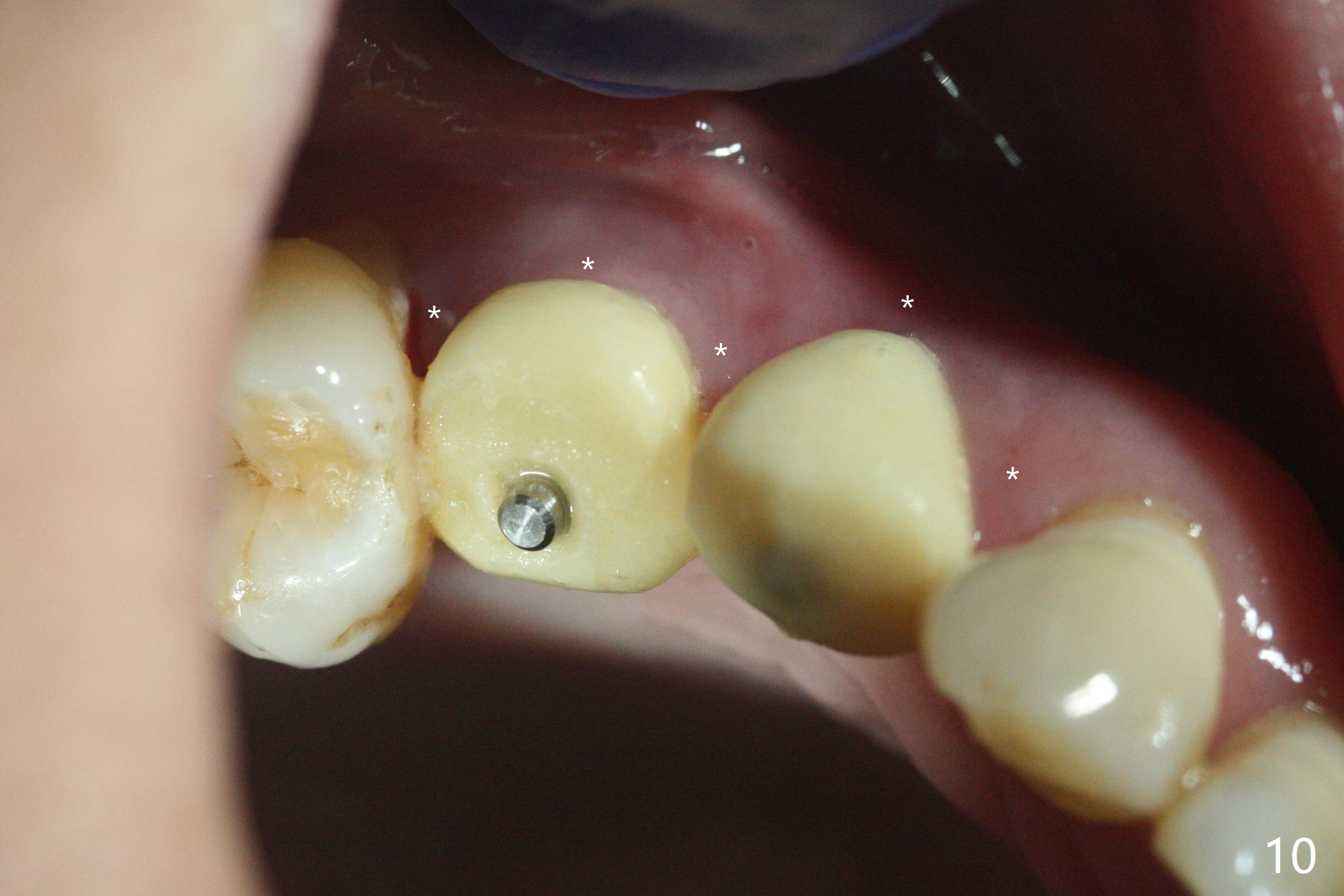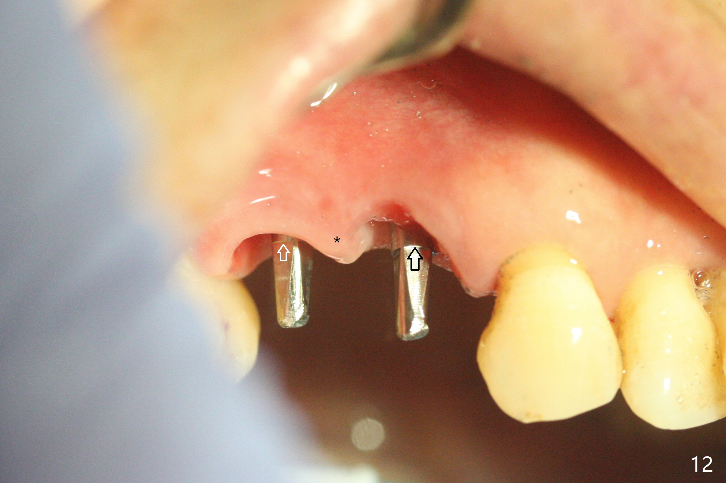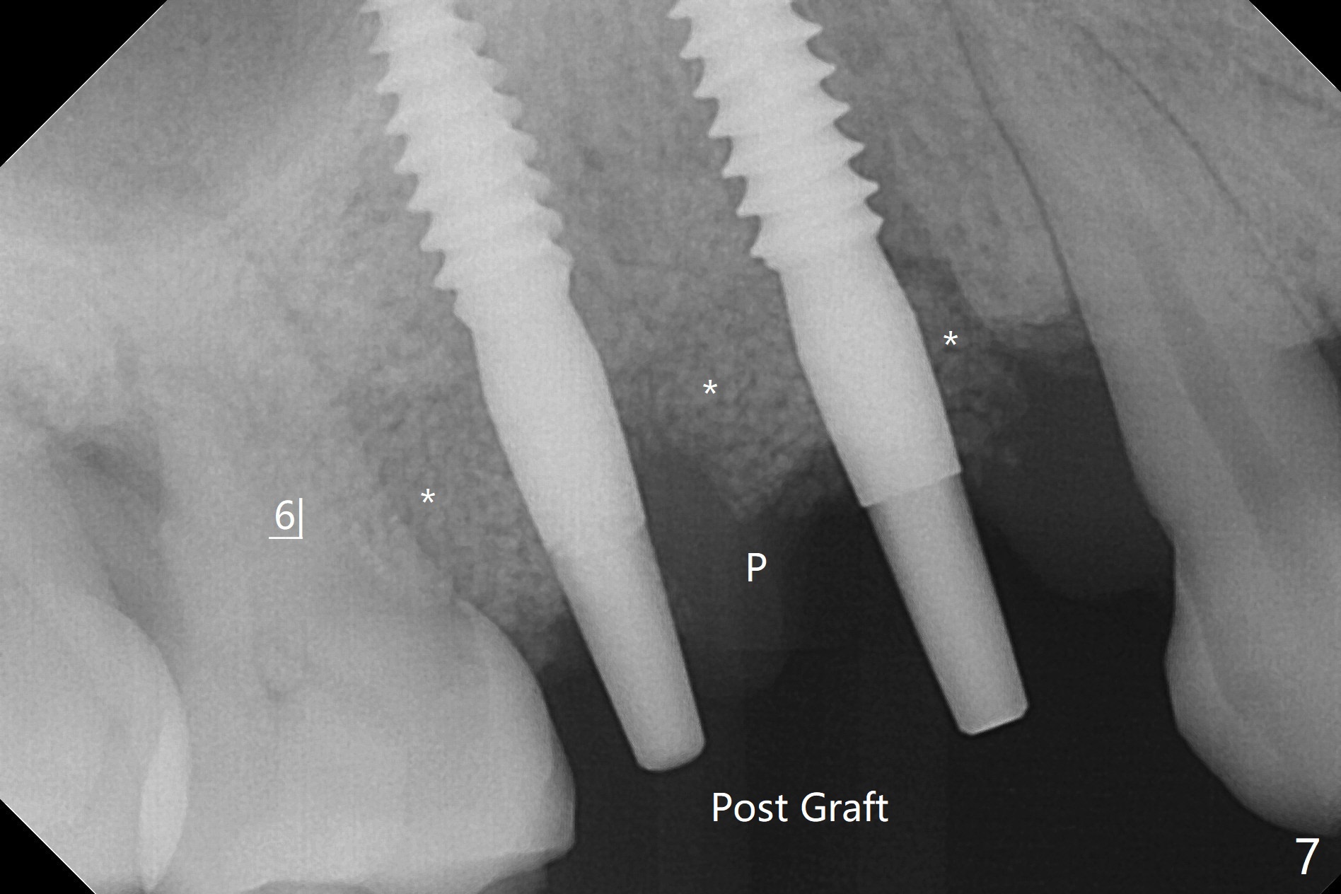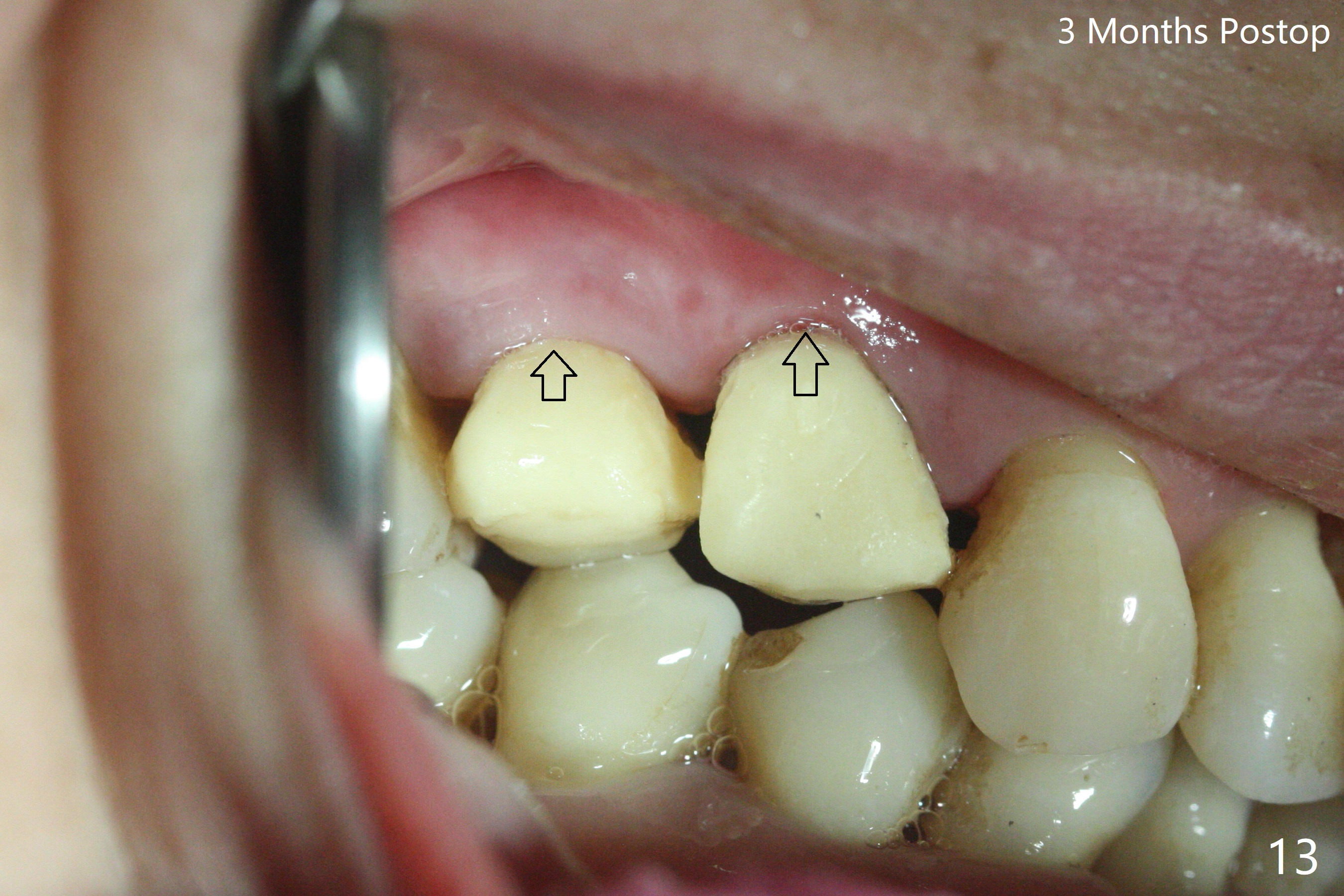 术前CT显示右上4牙槽骨比5窄(图一,二),3.5毫米植体比较合适,况且牙龈厚,基台长的一段式植体显得得当。为了取得最好的植体方位,4先拔除(图三),种植(图四),调整后者深度后,拔除5(术前征求病人同意),开始钻洞(图五),完成种植(图六)。粘性骨粉不仅放置于植体周围,而且6牙根近中(图七),4/5牙槽嵴和龈乳头(P)之间,减少术后龈乳头萎缩(图八:*)。制作两个分开临时牙冠,有利于维持龈乳头。对于病人来说,临时牙冠帮助咀嚼,而对侧拔牙创无法吃饭。术后3个月两个分开临时牙冠(其中一个龈方移位(图九:箭头)保持龈乳头(*)和牙龈外形(图十:*)。临时牙冠取出后,调整基台高度,少量钛屑(不妨大局)附着在健康的牙龈沟(图十一),再次显示两个基台之间龈乳头(图十二:*),衬里,修整的临时牙冠又插回牙龈沟(图十三:箭头),继续维持软组织形态,准备一个月后,调整基台边缘(图十二:箭头),取模。术后五个月大部分骨粉依然保留在植体和邻牙周围,龈乳头退缩不多(图十四: P)。三个月后(术后六个月)钛削无影无踪(图十五,与图十一对比))。永久性牙冠周围空间慢慢会消失(图十六,使用临时性胶水)。