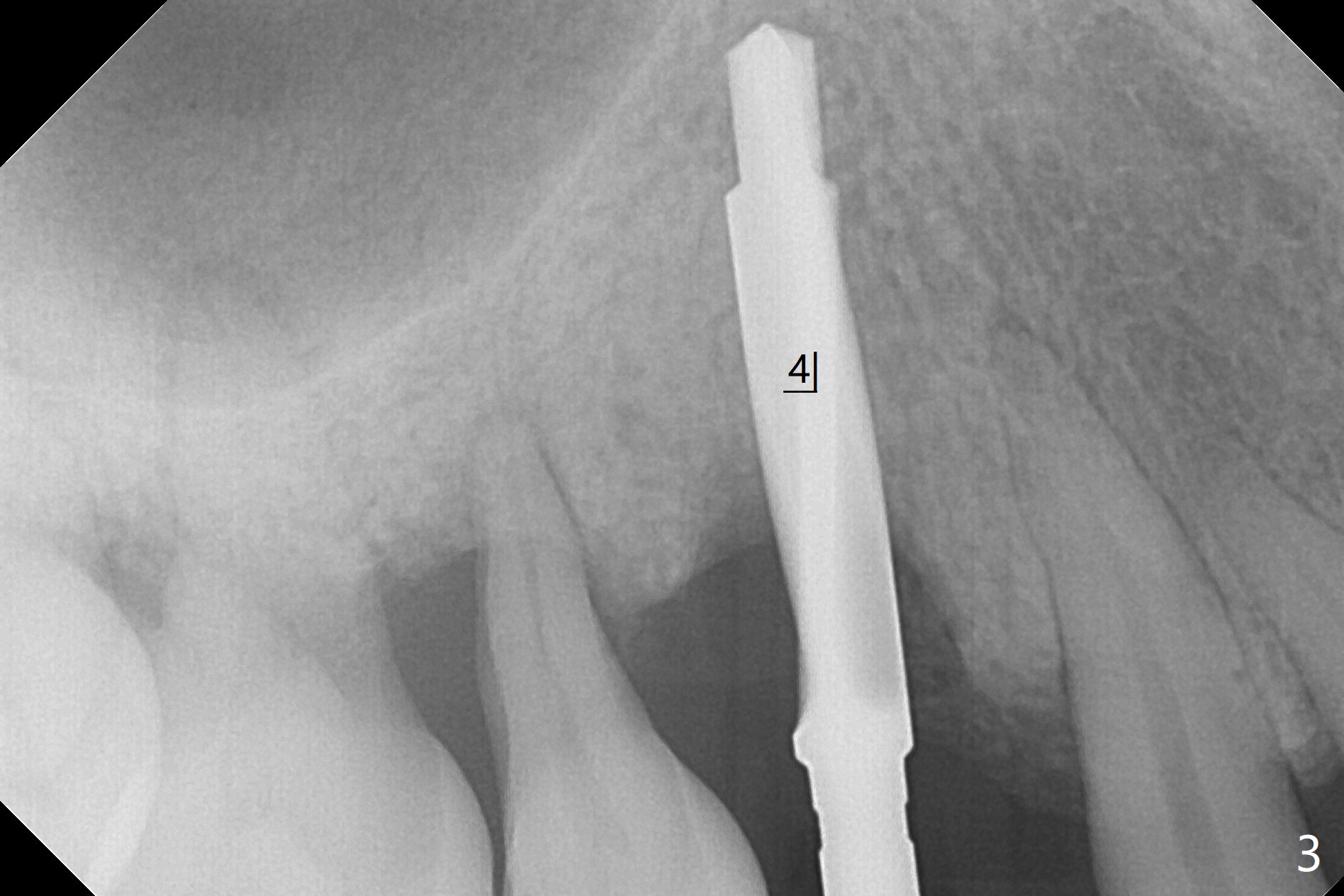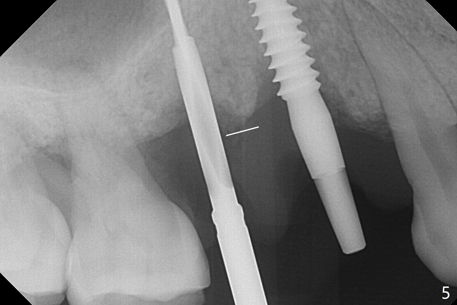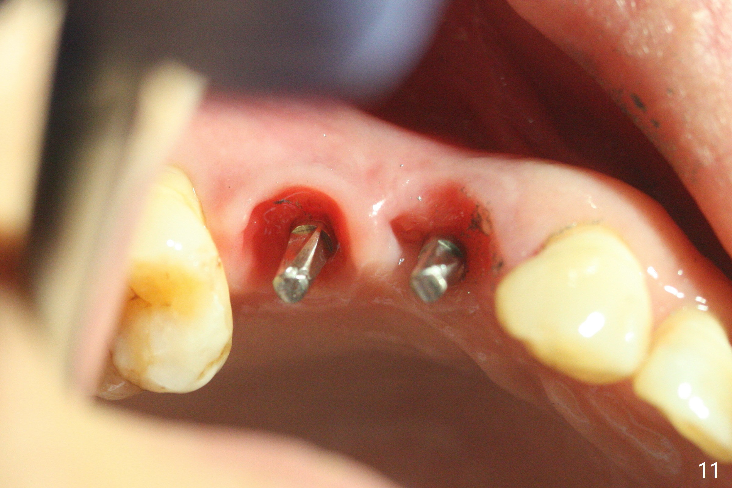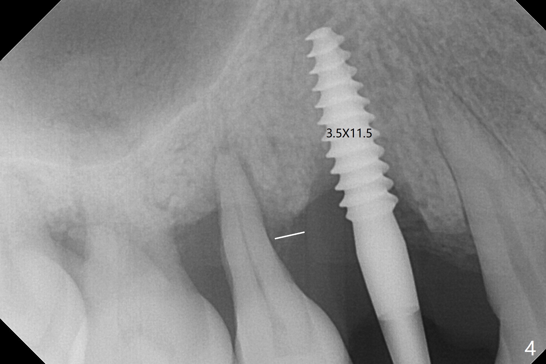 术前CT显示右上4牙槽骨比5窄(图一,二),3.5毫米植体比较合适,况且牙龈厚,基台长的一段式植体显得得当。为了取得最好的植体方位,4先拔除(图三),种植(图四),调整后者深度后,拔除5(术前征求病人同意),开始钻洞(图五),完成种植(图六)。粘性骨粉不仅放置于植体周围,而且6牙根近中(图七),4/5牙槽嵴和龈乳头(P)之间,减少术后龈乳头萎缩(图八:*)。制作两个分开临时牙冠,有利于维持龈乳头。对于病人来说,临时牙冠帮助咀嚼,而对侧拔牙创无法吃饭。术后3个月两个分开临时牙冠(其中一个龈方移位(图九:箭头)保持龈乳头(*)和牙龈外形(图十:*)。临时牙冠取出后,调整基台高度,少量钛屑(不妨大局)附着在健康的牙龈沟(图十一),再次显示两个基台之间龈乳头(图十二:*),衬里,修整的临时牙冠又插回牙龈沟(图十三:箭头),继续维持软组织形态,准备一个月后,调整基台边缘(图十二:箭头),取模。术后五个月大部分骨粉依然保留在植体和邻牙周围,龈乳头退缩不多(图十四: P)。三个月后(术后六个月)钛削无影无踪(图十五,与图十一对比))。永久性牙冠周围空间慢慢会消失(图十六,使用临时性胶水)。
