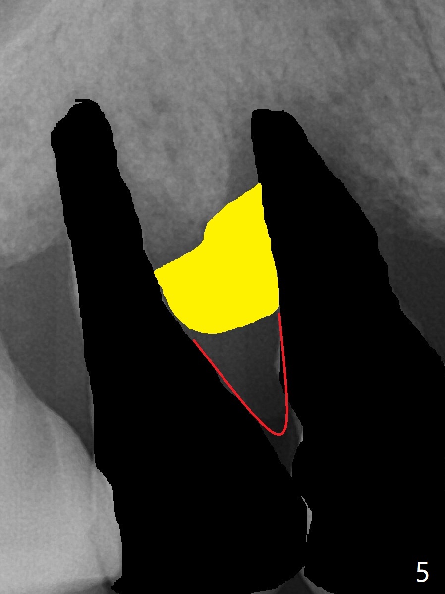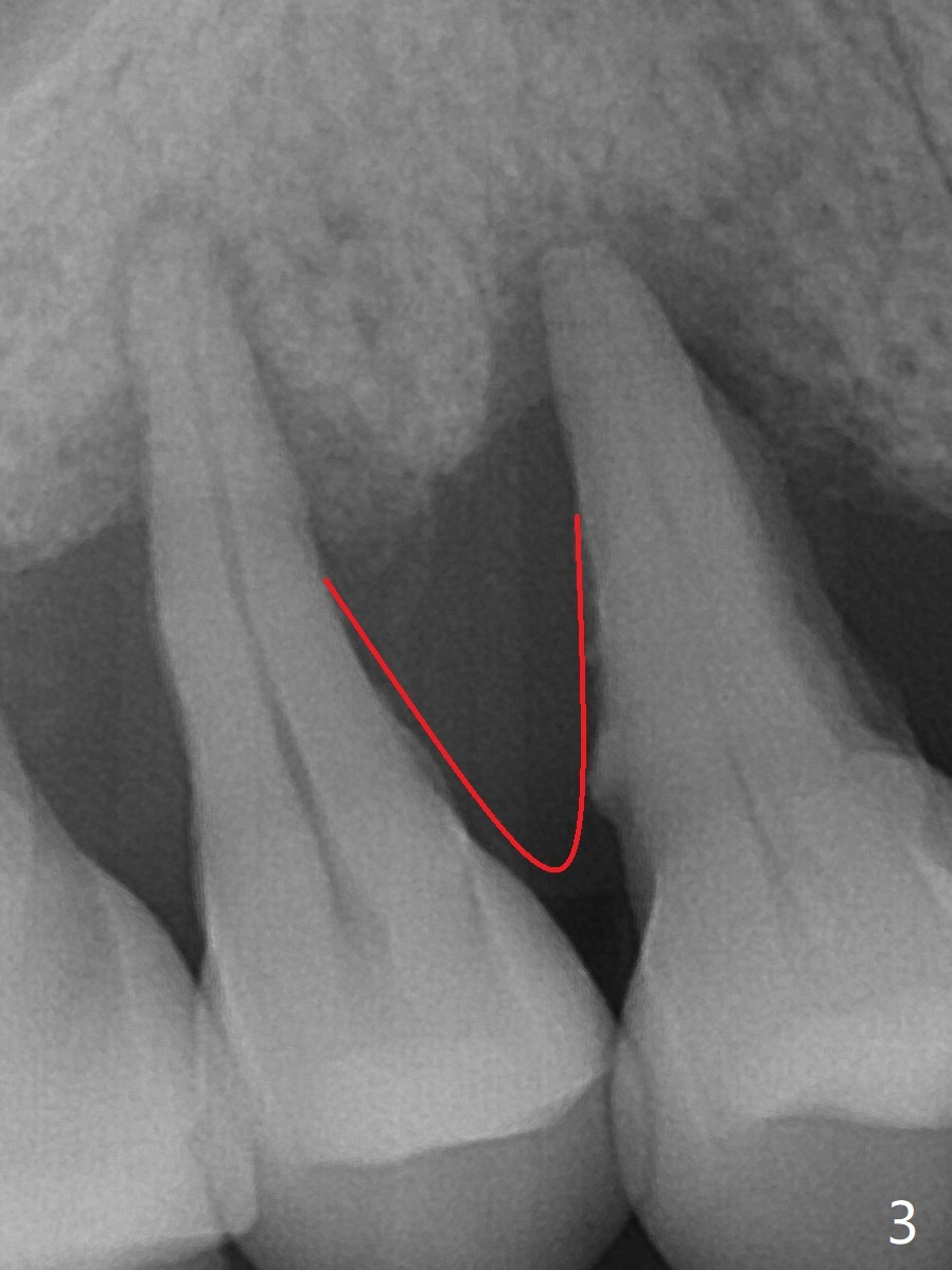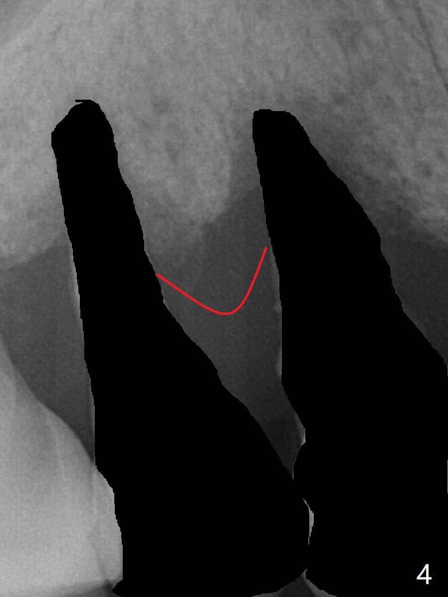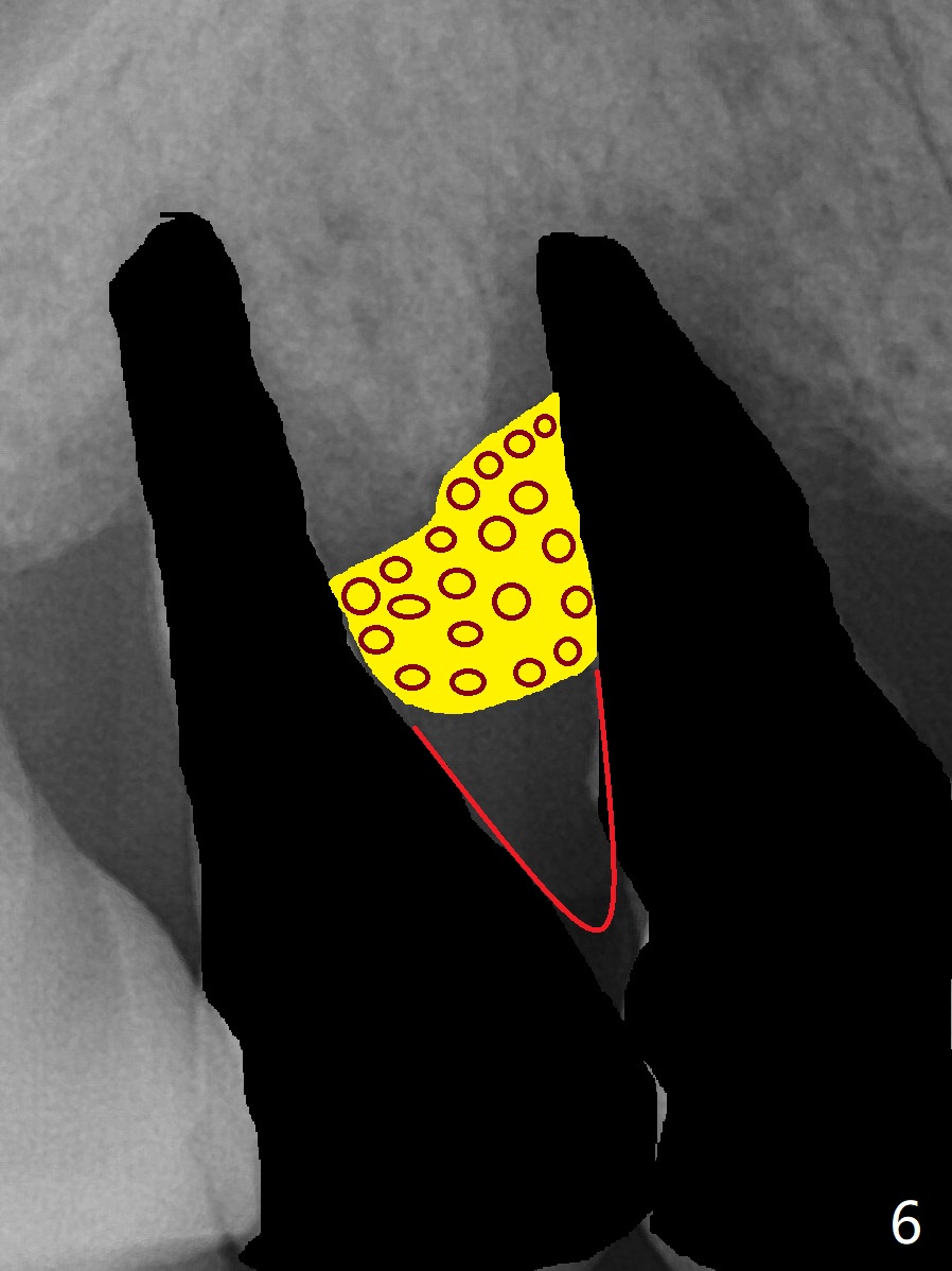 图三红线代表龈乳头,当两个邻牙拔除后,没有特殊处理,龈乳头不可避免收缩(图四)。如何预防呢?拔除4时,发现牙槽窝肉芽组织延申到牙槽嵴与乳头之间(图五:黄色)。刮治肉芽组织后,在空缺处,填入粘性骨粉(图六:圆圈),应该能够减少术后龈乳头萎缩。