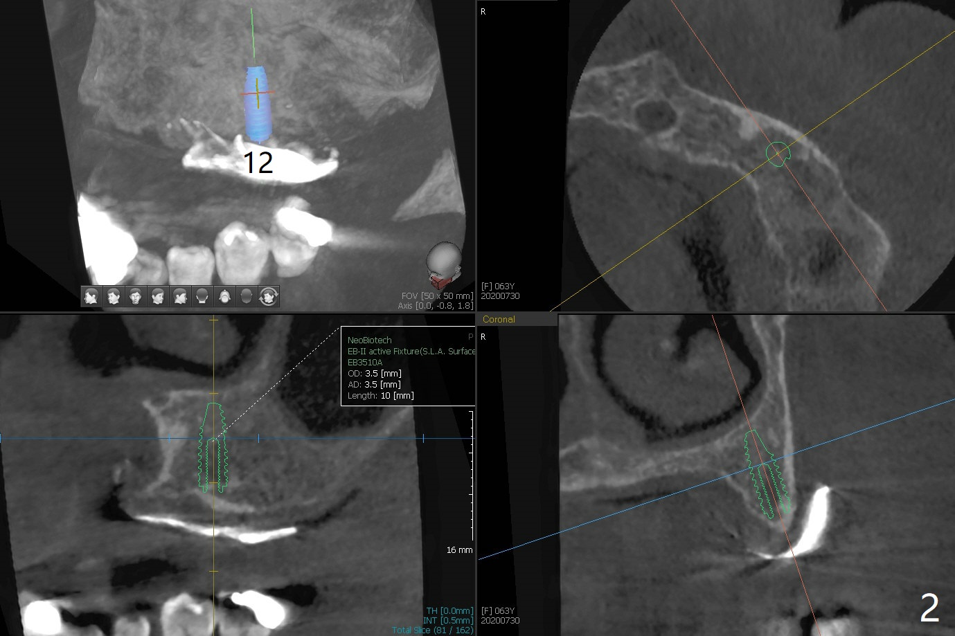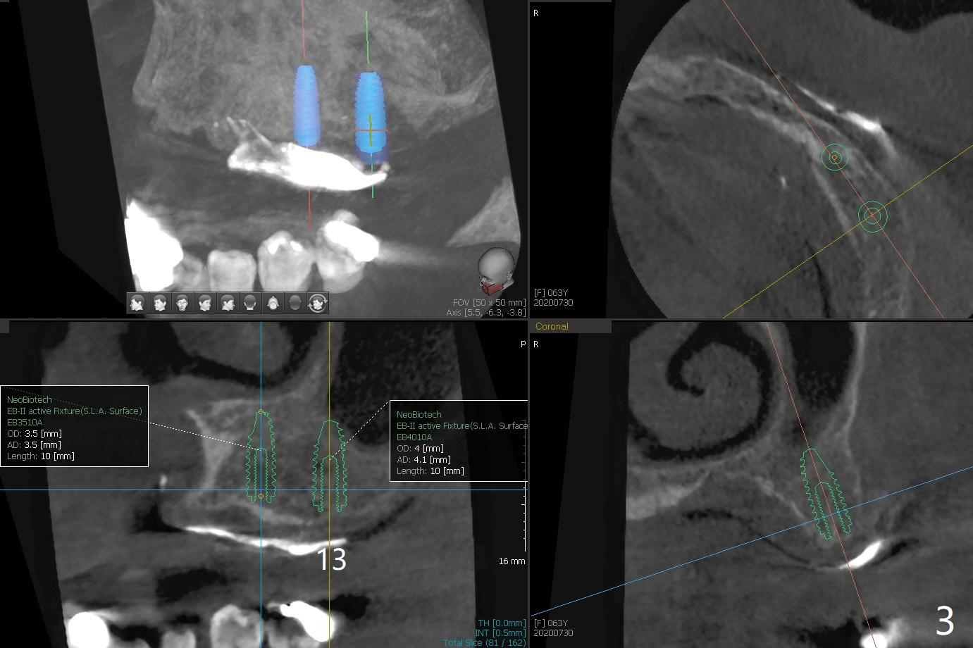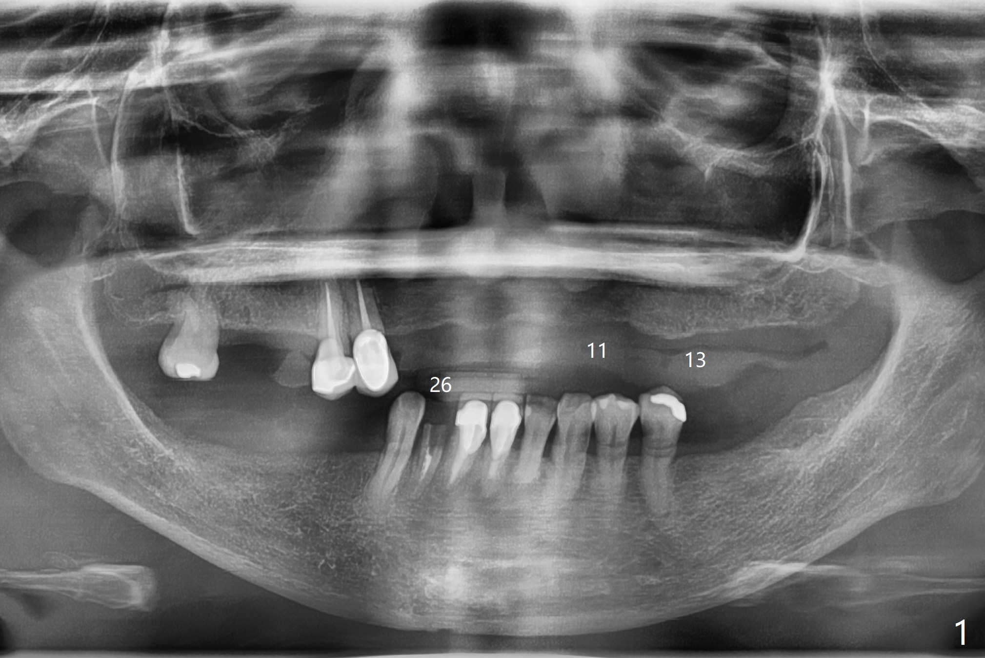 A 63-year-old woman presents to clinic with fractured crown/post at #26 (Fig.1). After recementation of the crown, the upper Valplast RPD is found to be unstable. After discussion, she agrees to have two implants and ball abutments at #11 and 13 for retention. Use pink acrylic to fixate a denture tooth of #3 to the Valplast. Alginate impression (upper and lower jaws with RPDs and upper without RPD) will be taken to make radiographic stent (Barium Sulfate). With the latter, take small field CT (5x5 cm) to decide the size of the implants. After implant and ball abutment placement, soft reline the Valplast until osteointegration. When Barium Sulfate and Jet are mixed with monomer, the mixture is applied to tissue surface of #11-13 of the upper Valplast. CT is taken. The latter shows that the bone at #11 is thin, while the bone at #14 is short. The sites of #12 and 13 are proper for implant placement (Fig.2,3).