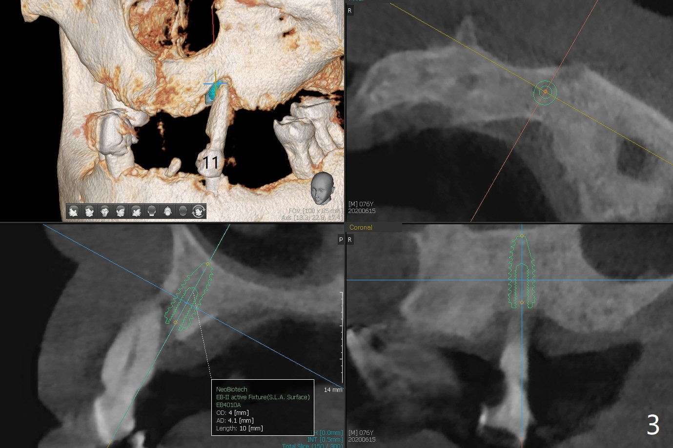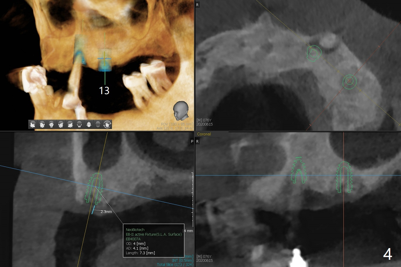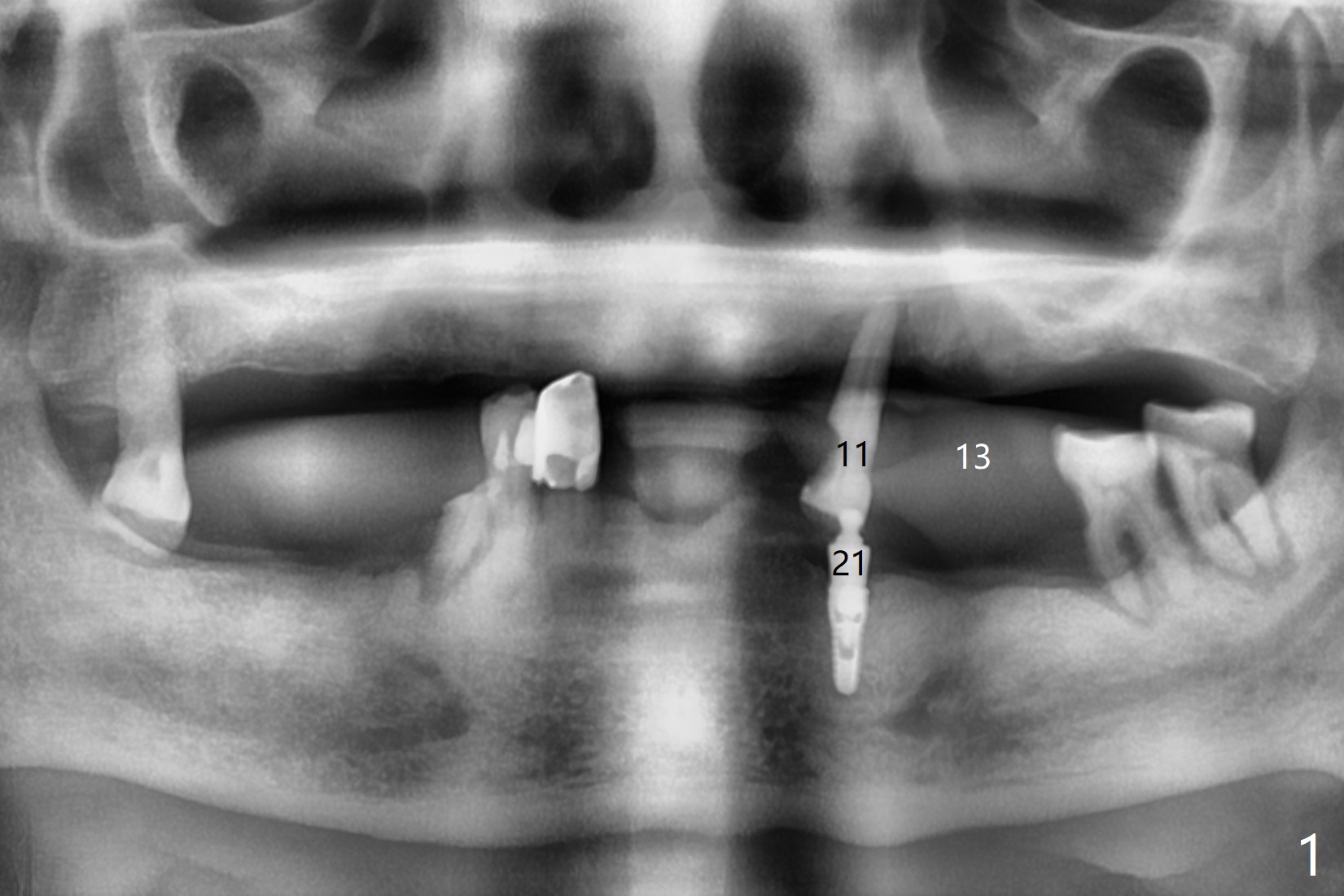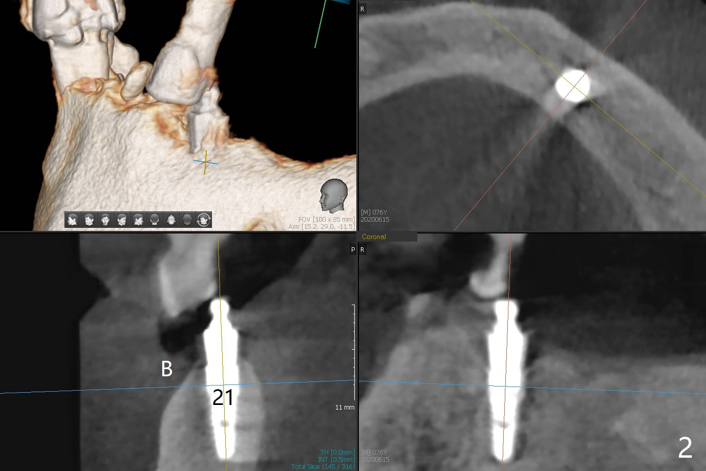 A 76-year-old man returns to clinic with chief complaint of loose top partial 2 years 3 months post #21 implant placement (Fig.1,2). The tooth #11 has mobility, while the socket of #13 heals and the tooth #1 is stable and functional (Fig.1). Two implants will be placed at #11 and 13 (Fig.3,4) with ball abutments (4 and 2 mm cuffs, respectively). Since the bone density is low at #13, bone expanders will be used as well as for sinus lift (implant 4x10 mm instead, PRF). Keep the tooth #11 as a denture one. Soft reline will be used to hold the abutments.