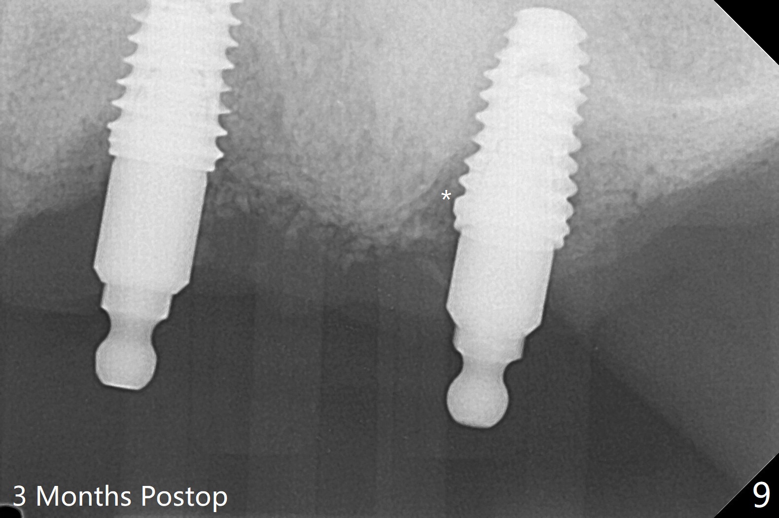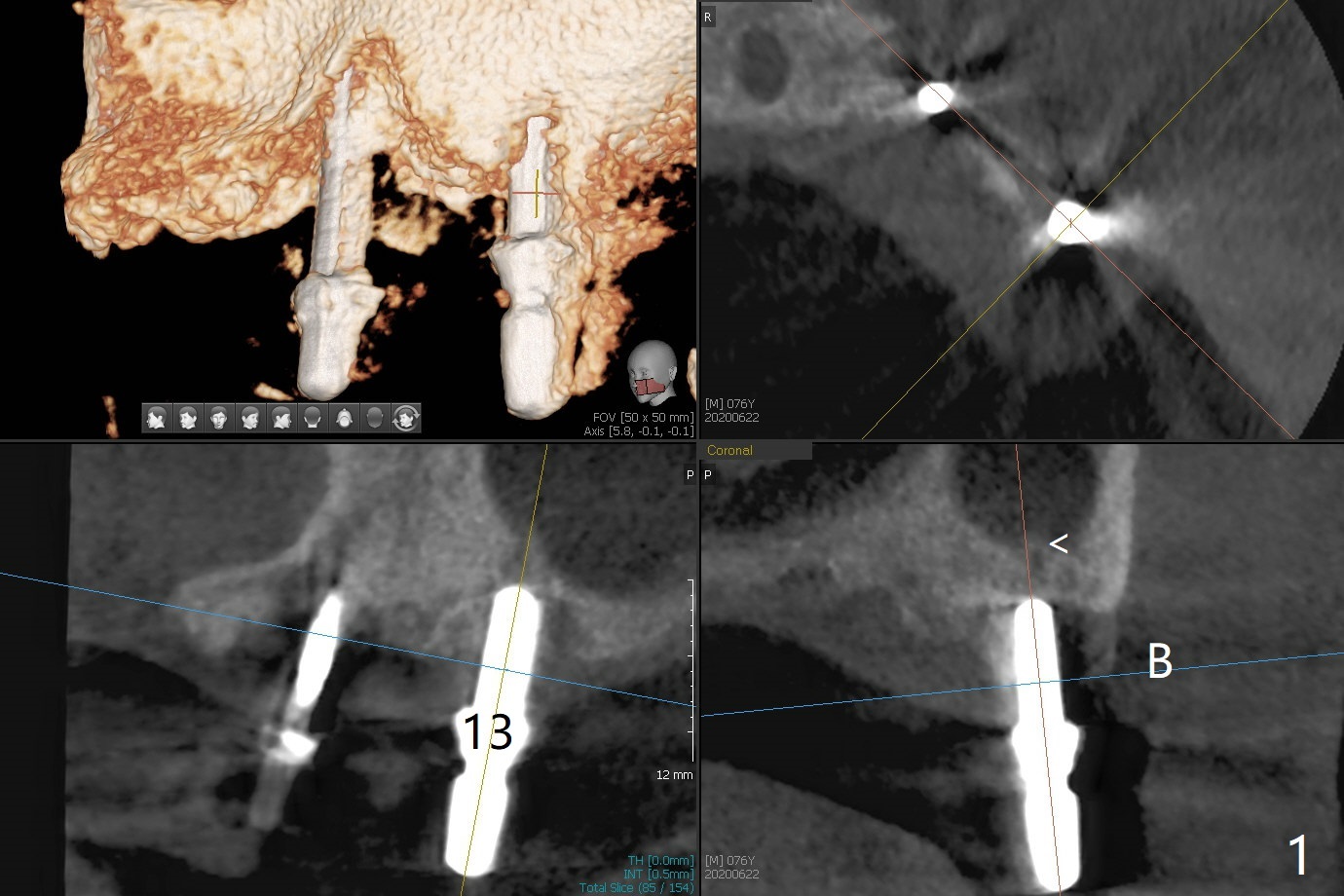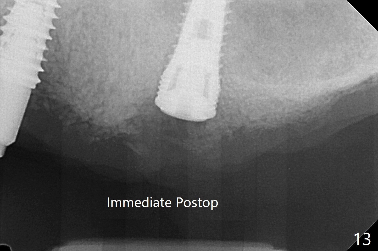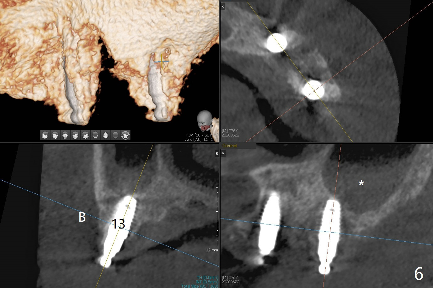Osteotomy at #13 starts blindly (no incision or tissue punch) with bone expanders. After insertion of parallel pins, intraop CT shows that it is palatal with apparently buccal low bone density (Fig.1); the osteotomy for implant (Fig.2 green) should be shifted buccal and tilted mesial (red, parallel to #11) with incision. In contrast the position, trajectory and depth (Fig.3 <) of the initial osteotomy are acceptable at #11. The implant will be placed as it is (Fig.4). After taking a postop PA (Fig.5), the implant at #11 is placed a little deeper to make sure its slightly subcrestal placement (including distal incision at #11). Following placement of 3.5x4 and 3 mm ball abutments at #11 and 13, cortical allograft with PRF is placed around the implants, especially buccal (Fig.6,7 <). After suturing, the profile of the ball abutments is too low for RPD retention. Due to gravity other than bone density, the number of ball abutments for the maxilla should be more than for the mandible. Soft reline is done to the patient's satisfaction. The retention of the upper RPD after soft reline is satisfactory without pain 7 days postop (Fig.8). The implant at #13 is loose nearly 3 months postop (Fig.9 *: bone loss). The implant is removed while the ball abutment is untightened; the sinus floor is present. It appears that a longer and larger implant is necessary; a 4.5x10 mm dummy implant is unable to be seated deep or achieve primary stability (Fig.10). After sinus lift with 3 mm Bicon osteotome without bone graft, the dummy implant accomplishes the 2 tasks mentioned above (Fig.11). However there is no corresponding definitive implant in stock. Implant system needs to be changed; with a change in implant driver, the depth control is lost. The final implant is placed deep (Fig.12). With back up, stability is lessened; a healing screw is placed; with collagen plug, the wound is sutured (Fig.13). The wound heals 1 week postop (Fig.15). The RPD is soft relined. Retention from the ball abutment at #11 is apparently critical. The RPD and #11 implants (4 months postop) are stable, while the wound at #13 heals 1.5 months postop (Fig.15). There is space around the implant 5.5 months postop (Fig.16 *). The 5x10mm SM implant is found to be loose upon uncover and removed. After debridement, 5.3x8 mm SM and 5.5x9 mm IBS dummy implants are inserted without stability, while 6x9 mm definitive one with stability (Fig.17). Cortical allograft is placed in deficiency areas (*). The osteotomy has no roof (sinus floor), but the sinus membrane is intact. Small amount of bone graft (Fig.18 *) is placed before implantation. There appears to be bone around the new implant (Fig.19 (3D sagittal section) *).