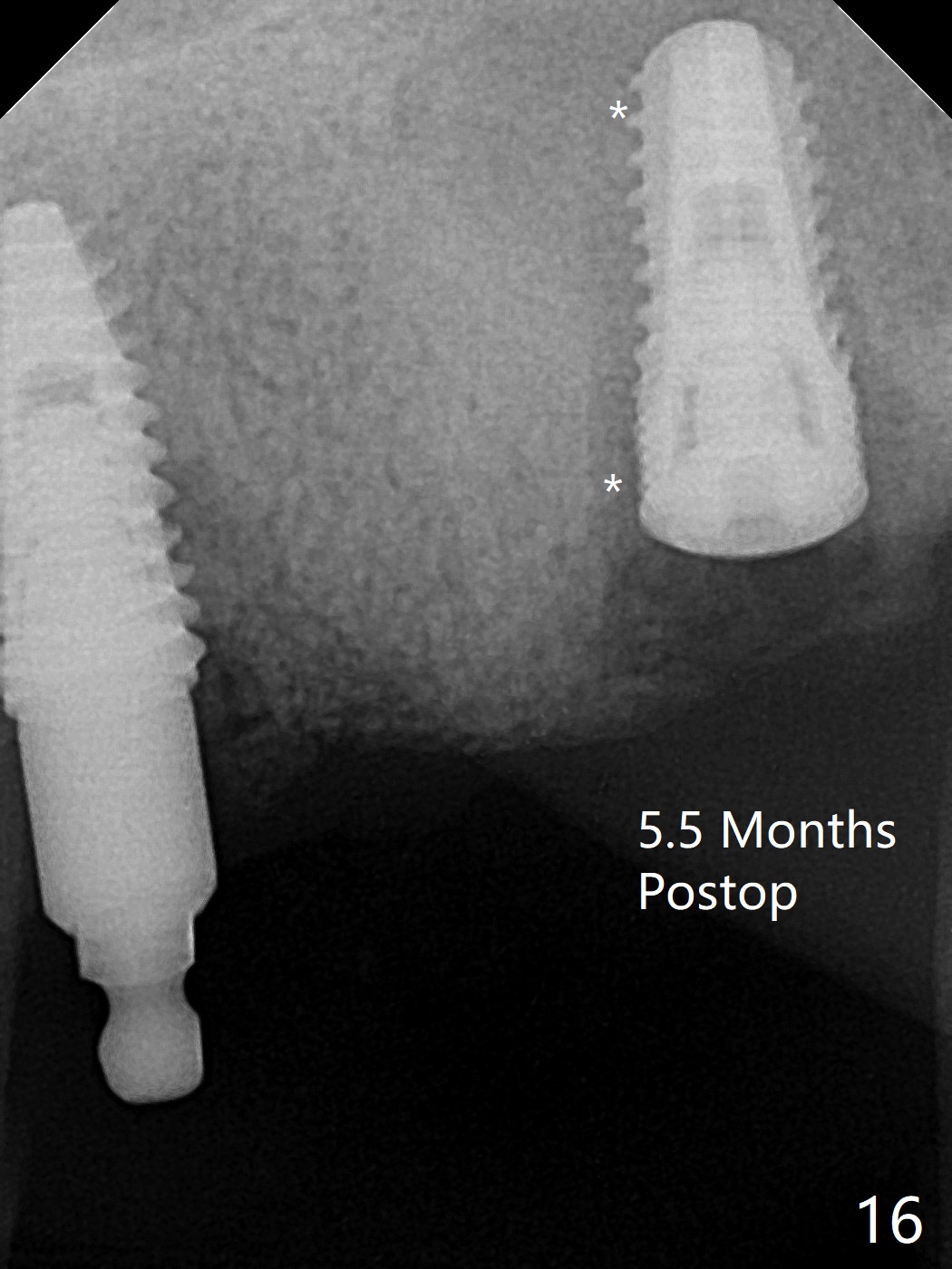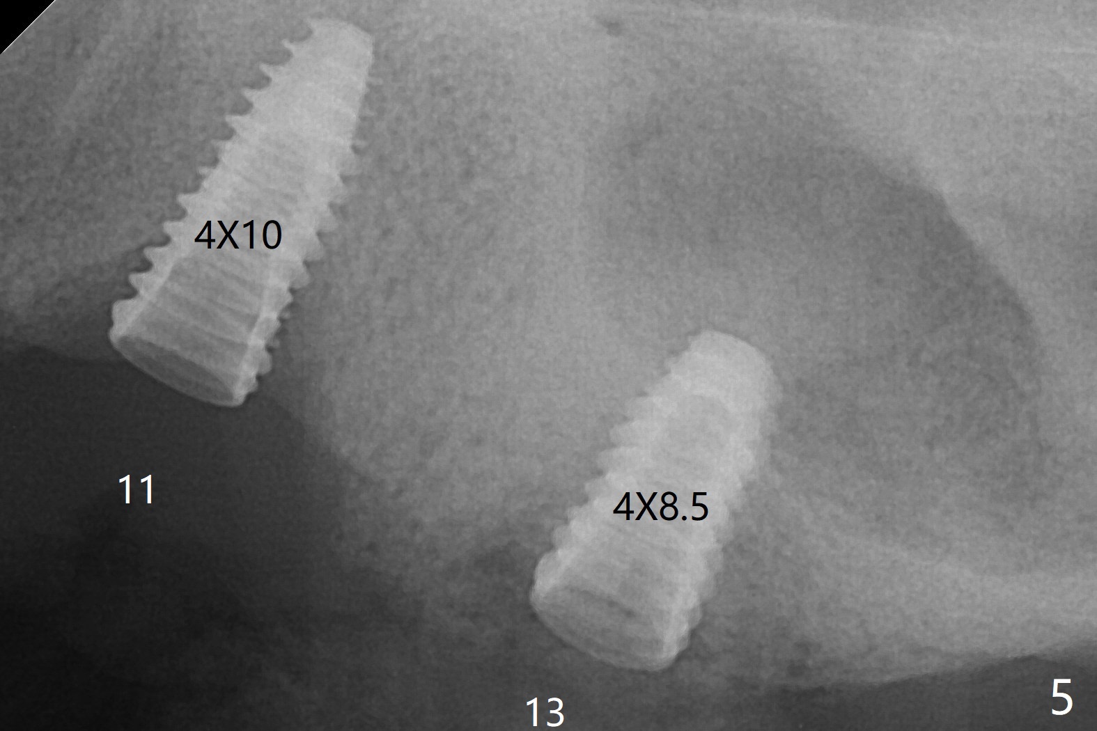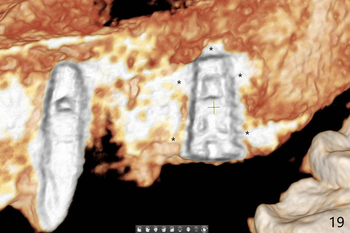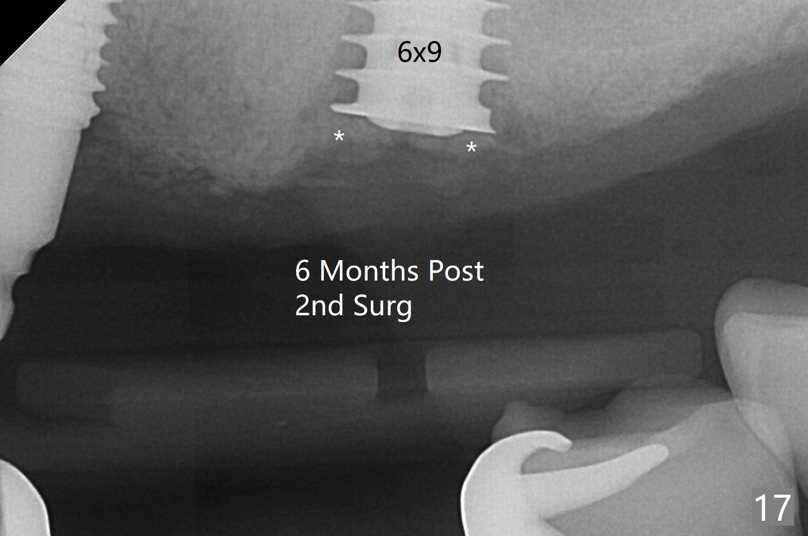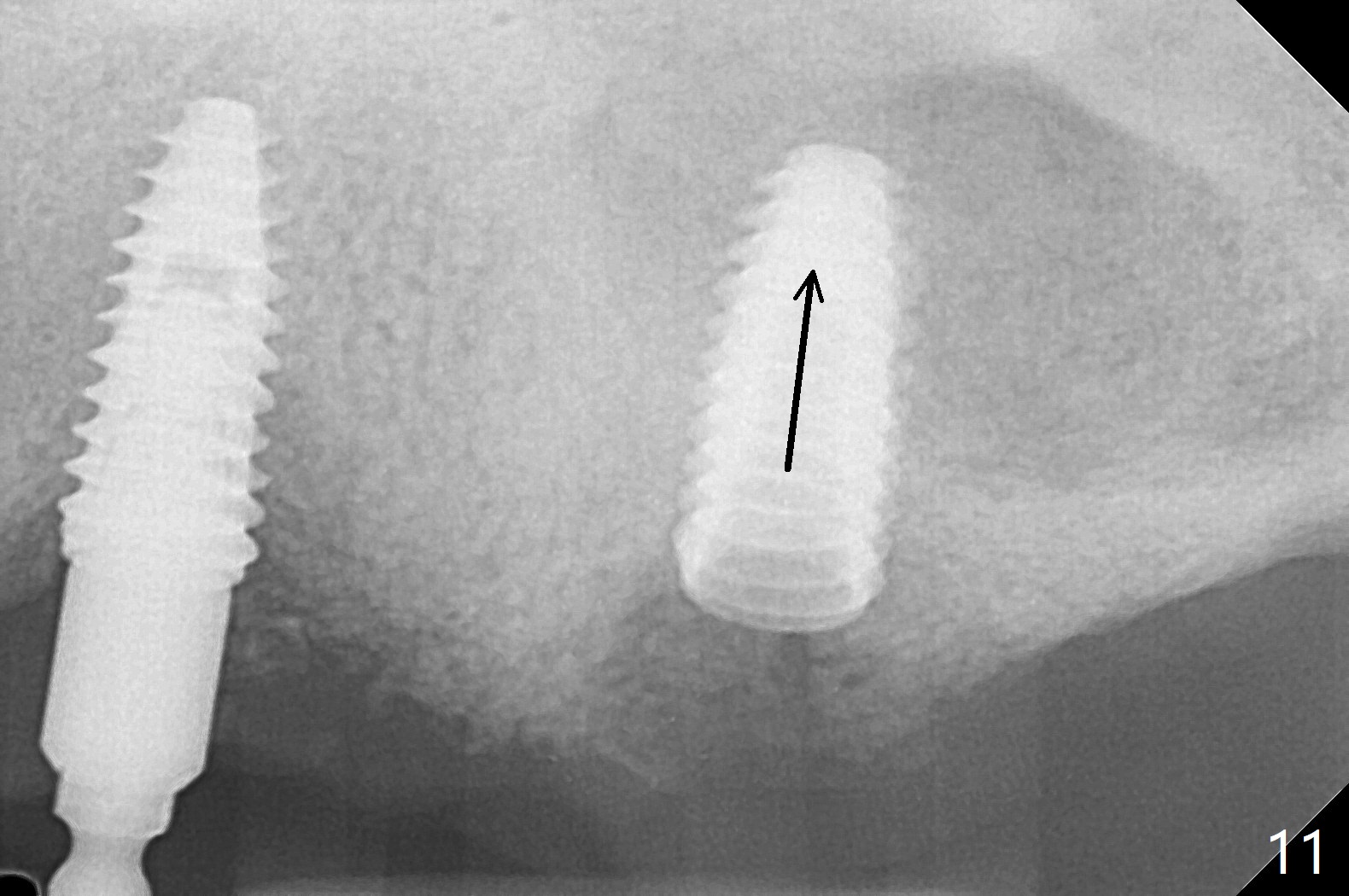 Osteotomy at #13 starts blindly (no incision or tissue punch) with bone expanders. After insertion of parallel pins, intraop CT shows that it is palatal with apparently buccal low bone density (Fig.1); the osteotomy for implant (Fig.2 green) should be shifted buccal and tilted mesial (red, parallel to #11) with incision. In contrast the position, trajectory and depth (Fig.3 <) of the initial osteotomy are acceptable at #11. The implant will be placed as it is (Fig.4). After taking a postop PA (Fig.5), the implant at #11 is placed a little deeper to make sure its slightly subcrestal placement (including distal incision at #11). Following placement of 3.5x4 and 3 mm ball abutments at #11 and 13, cortical allograft with PRF is placed around the implants, especially buccal (Fig.6,7 <). After suturing, the profile of the ball abutments is too low for RPD retention. Due to gravity other than bone density, the number of ball abutments for the maxilla should be more than for the mandible. Soft reline is done to the patient's satisfaction. The retention of the upper RPD after soft reline is satisfactory without pain 7 days postop (Fig.8). The implant at #13 is loose nearly 3 months postop (Fig.9 *: bone loss). The implant is removed while the ball abutment is untightened; the sinus floor is present. It appears that a longer and larger implant is necessary; a 4.5x10 mm dummy implant is unable to be seated deep or achieve primary stability (Fig.10). After sinus lift with 3 mm Bicon osteotome without bone graft, the dummy implant accomplishes the 2 tasks mentioned above (Fig.11). However there is no corresponding definitive implant in stock. Implant system needs to be changed; with a change in implant driver, the depth control is lost. The final implant is placed deep (Fig.12). With back up, stability is lessened; a healing screw is placed; with collagen plug, the wound is sutured (Fig.13). The wound heals 1 week postop (Fig.15). The RPD is soft relined. Retention from the ball abutment at #11 is apparently critical. The RPD and #11 implants (4 months postop) are stable, while the wound at #13 heals 1.5 months postop (Fig.15). There is space around the implant 5.5 months postop (Fig.16 *). The 5x10mm SM implant is found to be loose upon uncover and removed. After debridement, 5.3x8 mm SM and 5.5x9 mm IBS dummy implants are inserted without stability, while 6x9 mm definitive one with stability (Fig.17). Cortical allograft is placed in deficiency areas (*). The osteotomy has no roof (sinus floor), but the sinus membrane is intact. Small amount of bone graft (Fig.18 *) is placed before implantation. There appears to be bone around the new implant (Fig.19 (3D sagittal section) *).