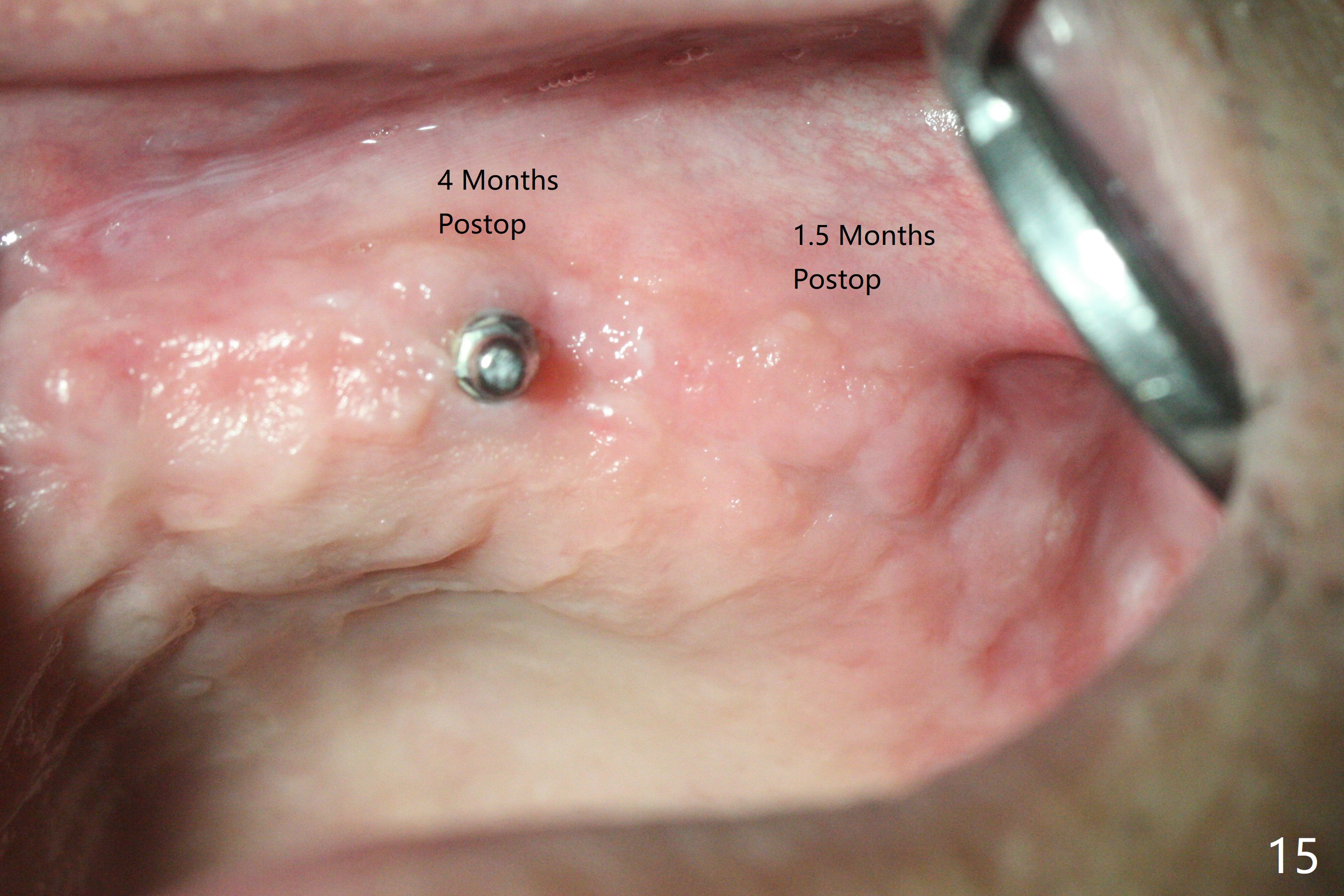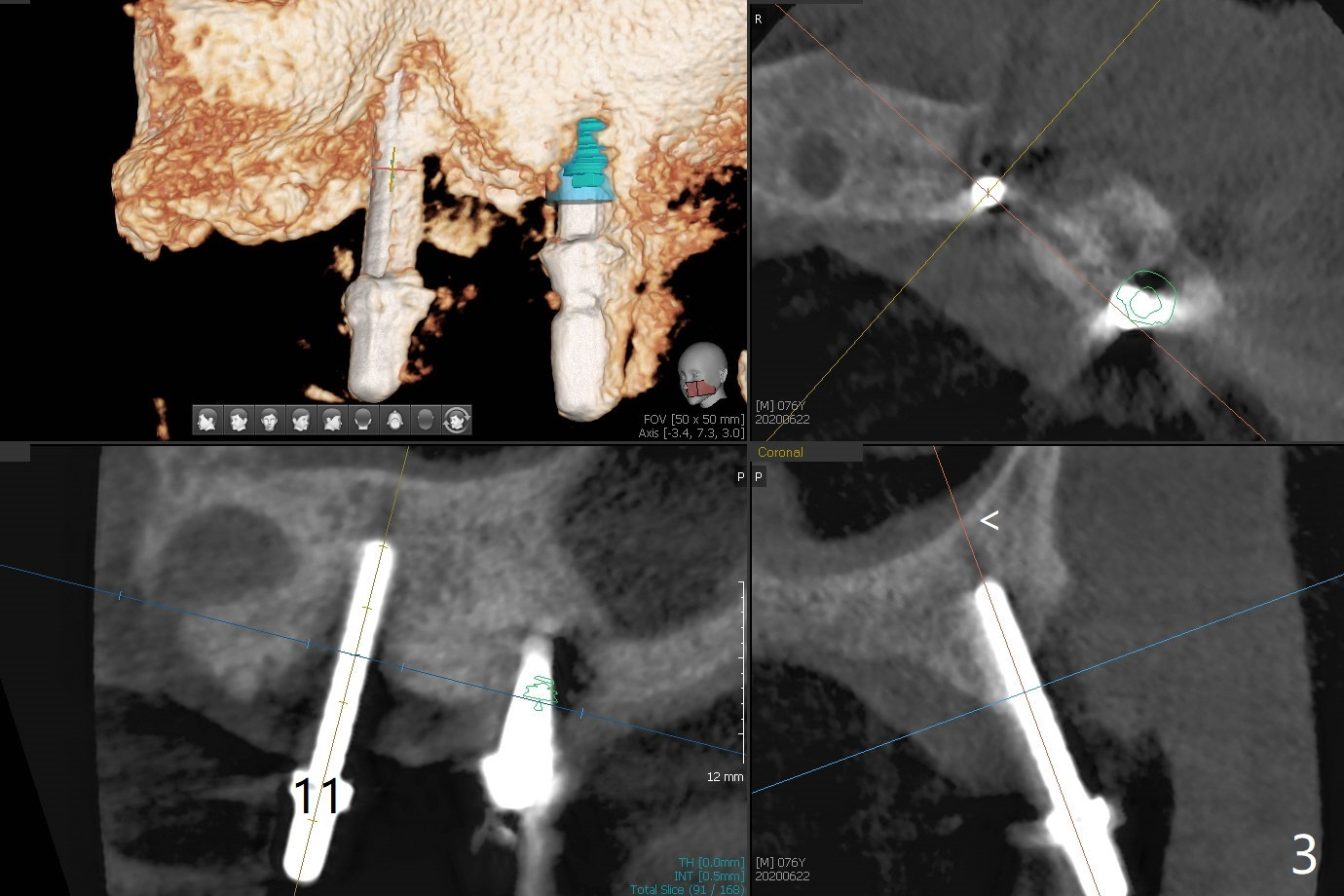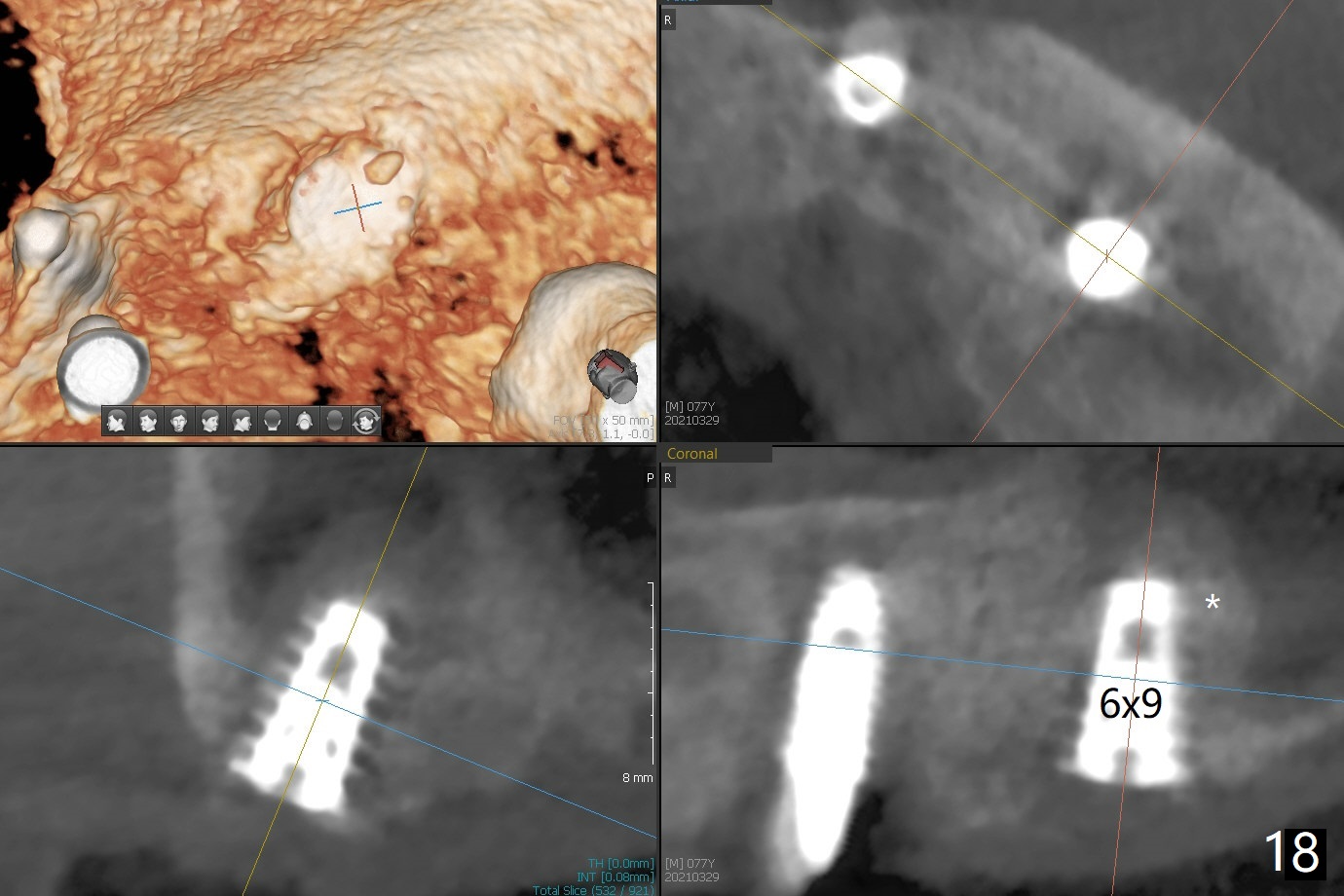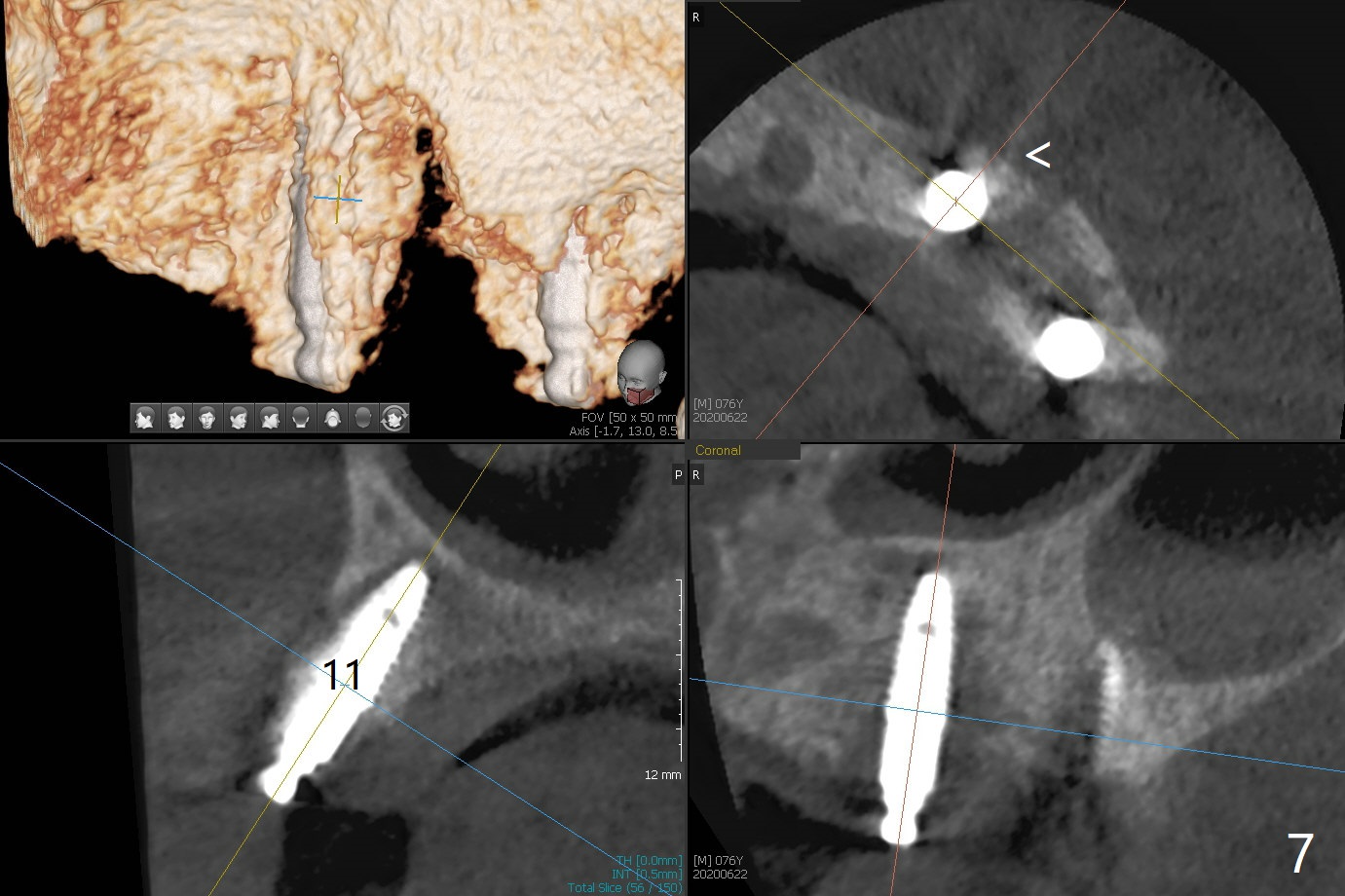 Osteotomy at #13 starts blindly (no incision or tissue punch) with bone expanders. After insertion of parallel pins, intraop CT shows that it is palatal with apparently buccal low bone density (Fig.1); the osteotomy for implant (Fig.2 green) should be shifted buccal and tilted mesial (red, parallel to #11) with incision. In contrast the position, trajectory and depth (Fig.3 <) of the initial osteotomy are acceptable at #11. The implant will be placed as it is (Fig.4). After taking a postop PA (Fig.5), the implant at #11 is placed a little deeper to make sure its slightly subcrestal placement (including distal incision at #11). Following placement of 3.5x4 and 3 mm ball abutments at #11 and 13, cortical allograft with PRF is placed around the implants, especially buccal (Fig.6,7 <). After suturing, the profile of the ball abutments is too low for RPD retention. Due to gravity other than bone density, the number of ball abutments for the maxilla should be more than for the mandible. Soft reline is done to the patient's satisfaction. The retention of the upper RPD after soft reline is satisfactory without pain 7 days postop (Fig.8). The implant at #13 is loose nearly 3 months postop (Fig.9 *: bone loss). The implant is removed while the ball abutment is untightened; the sinus floor is present. It appears that a longer and larger implant is necessary; a 4.5x10 mm dummy implant is unable to be seated deep or achieve primary stability (Fig.10). After sinus lift with 3 mm Bicon osteotome without bone graft, the dummy implant accomplishes the 2 tasks mentioned above (Fig.11). However there is no corresponding definitive implant in stock. Implant system needs to be changed; with a change in implant driver, the depth control is lost. The final implant is placed deep (Fig.12). With back up, stability is lessened; a healing screw is placed; with collagen plug, the wound is sutured (Fig.13). The wound heals 1 week postop (Fig.15). The RPD is soft relined. Retention from the ball abutment at #11 is apparently critical. The RPD and #11 implants (4 months postop) are stable, while the wound at #13 heals 1.5 months postop (Fig.15). There is space around the implant 5.5 months postop (Fig.16 *). The 5x10mm SM implant is found to be loose upon uncover and removed. After debridement, 5.3x8 mm SM and 5.5x9 mm IBS dummy implants are inserted without stability, while 6x9 mm definitive one with stability (Fig.17). Cortical allograft is placed in deficiency areas (*). The osteotomy has no roof (sinus floor), but the sinus membrane is intact. Small amount of bone graft (Fig.18 *) is placed before implantation. There appears to be bone around the new implant (Fig.19 (3D sagittal section) *).