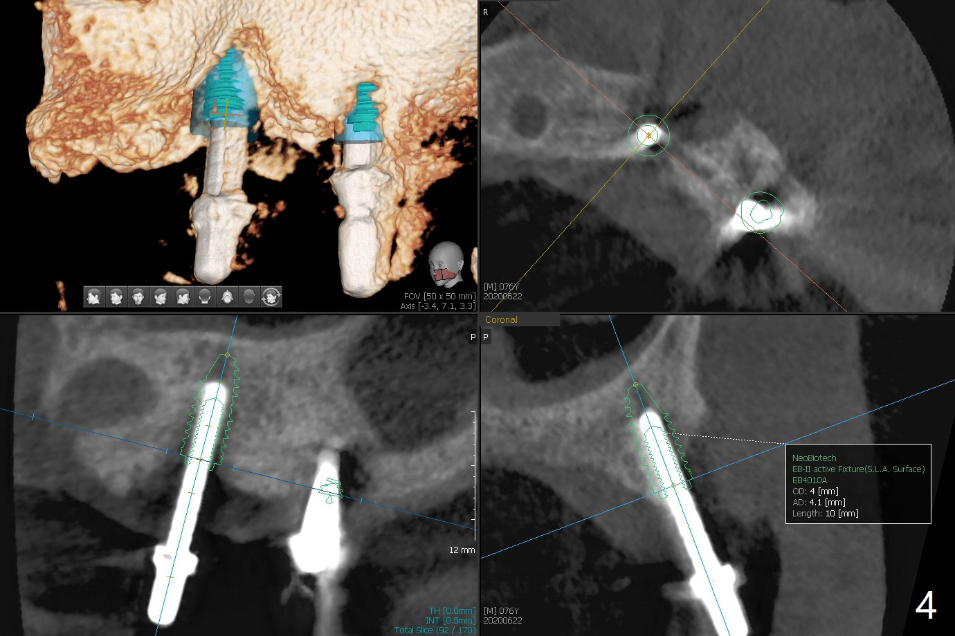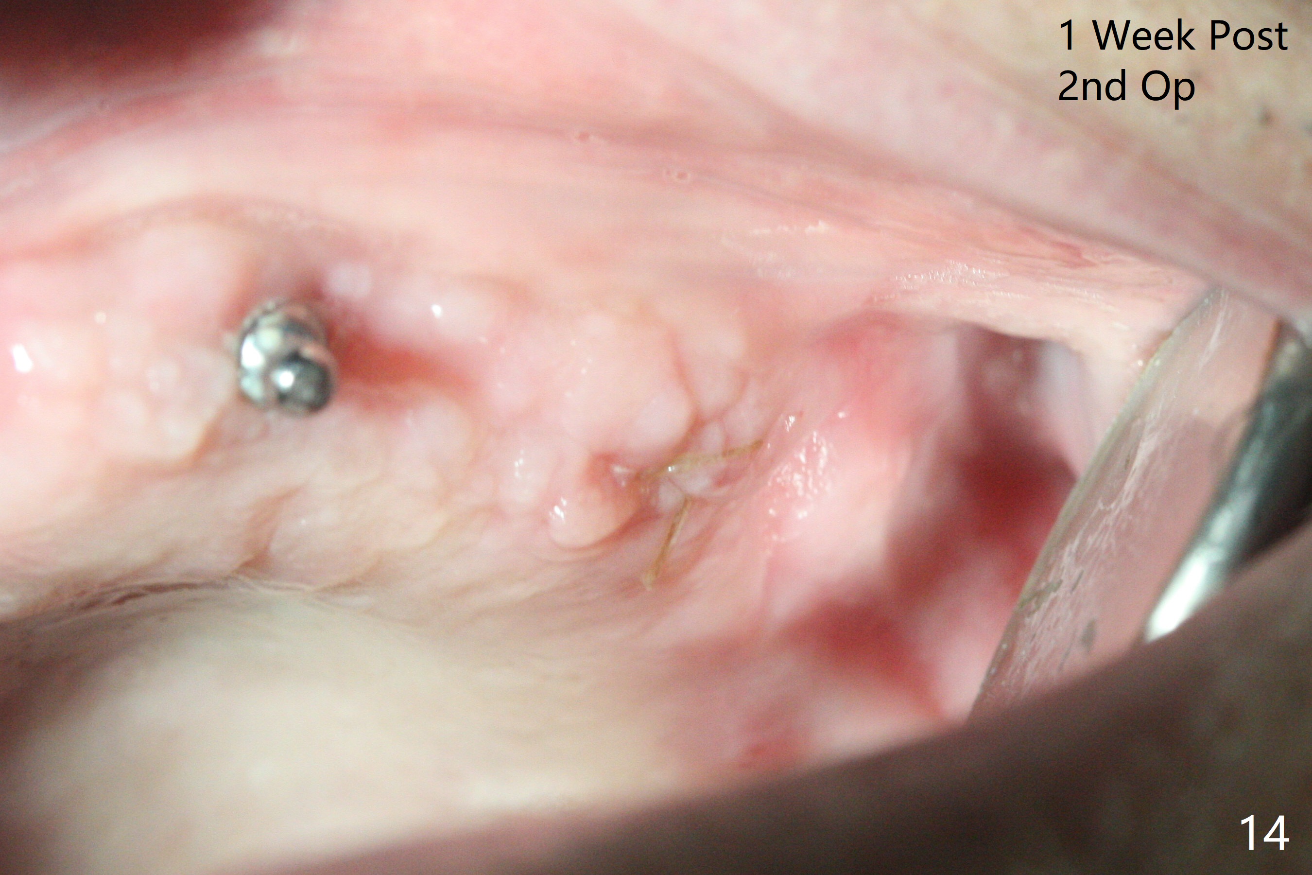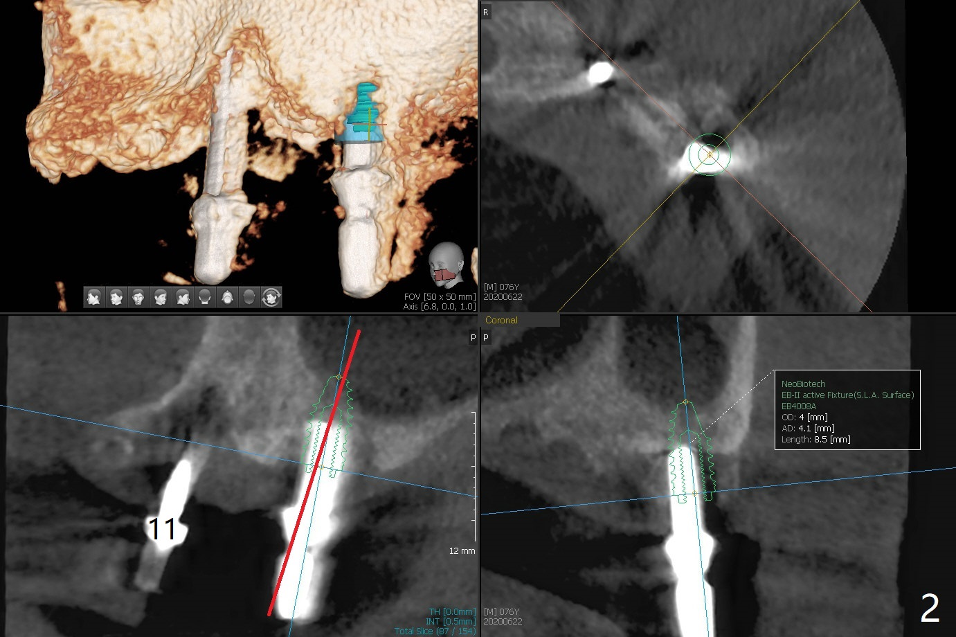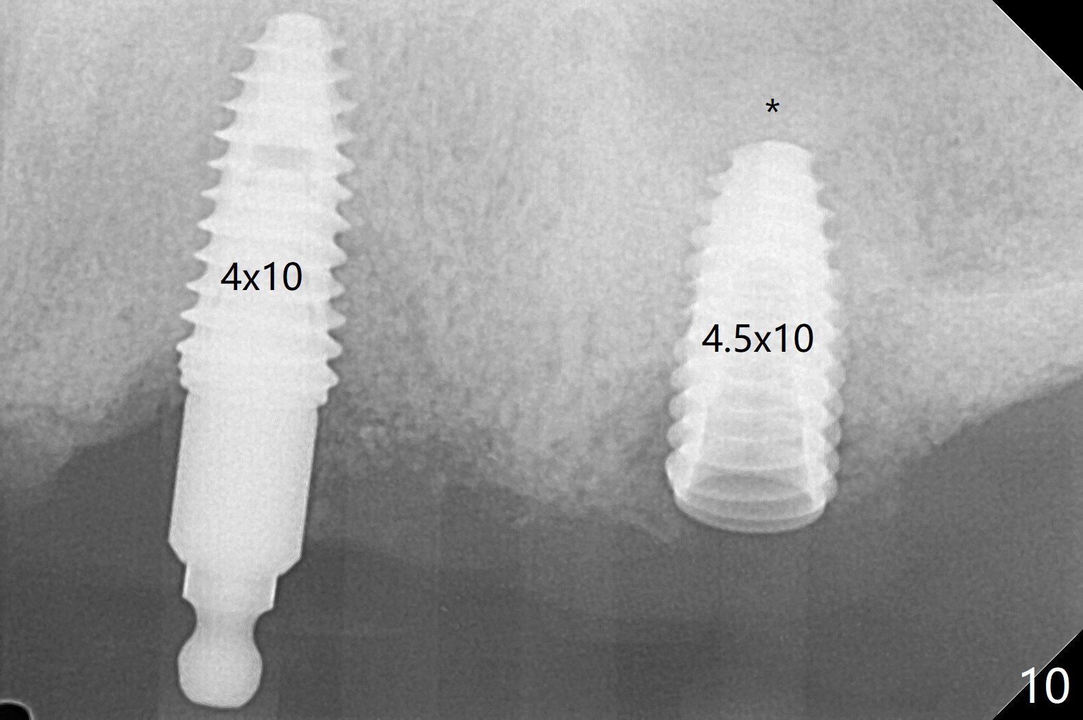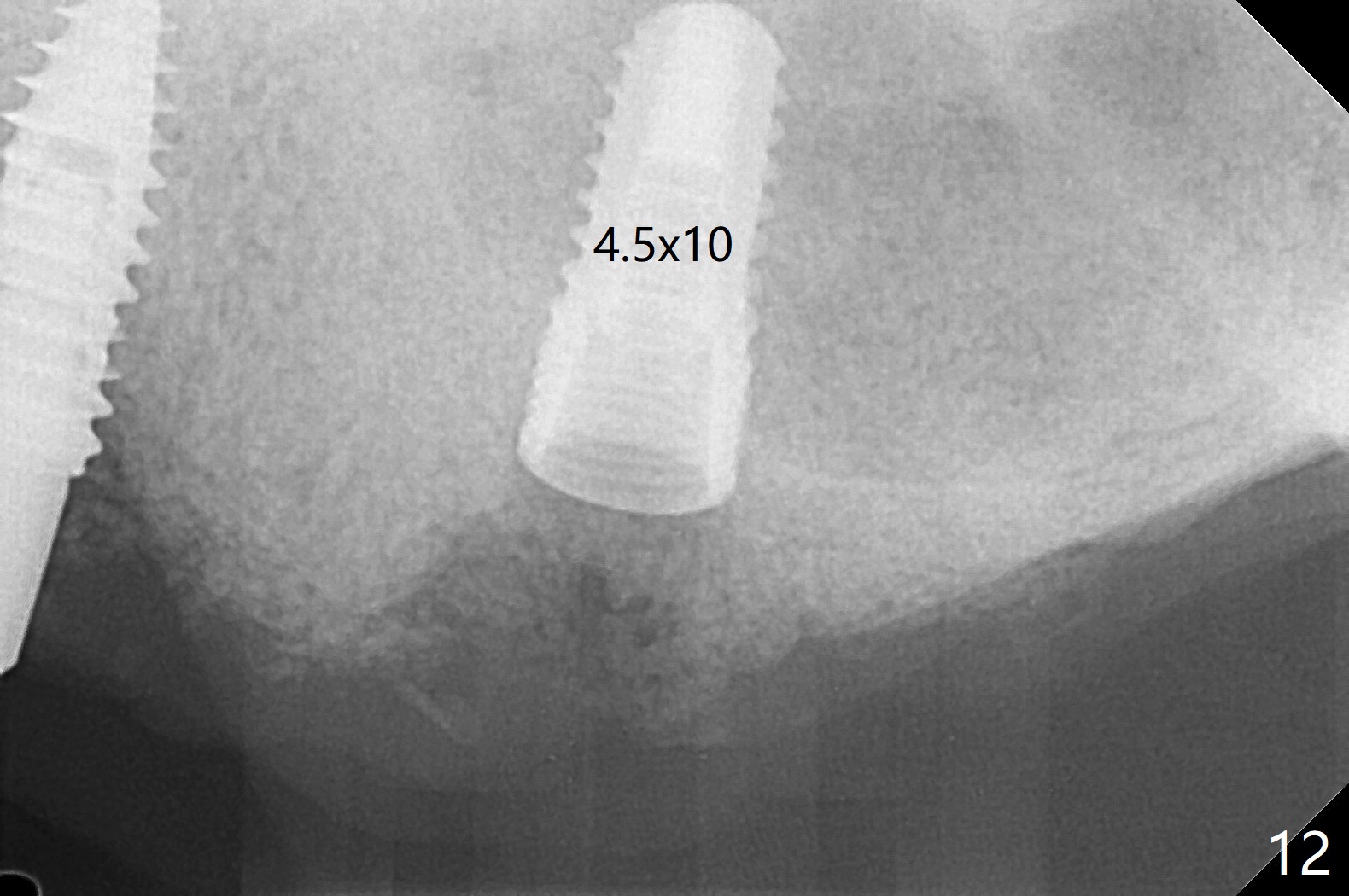 Osteotomy at #13 starts blindly (no incision or tissue punch) with bone expanders. After insertion of parallel pins, intraop CT shows that it is palatal with apparently buccal low bone density (Fig.1); the osteotomy for implant (Fig.2 green) should be shifted buccal and tilted mesial (red, parallel to #11) with incision. In contrast the position, trajectory and depth (Fig.3 <) of the initial osteotomy are acceptable at #11. The implant will be placed as it is (Fig.4). After taking a postop PA (Fig.5), the implant at #11 is placed a little deeper to make sure its slightly subcrestal placement (including distal incision at #11). Following placement of 3.5x4 and 3 mm ball abutments at #11 and 13, cortical allograft with PRF is placed around the implants, especially buccal (Fig.6,7 <). After suturing, the profile of the ball abutments is too low for RPD retention. Due to gravity other than bone density, the number of ball abutments for the maxilla should be more than for the mandible. Soft reline is done to the patient's satisfaction. The retention of the upper RPD after soft reline is satisfactory without pain 7 days postop (Fig.8). The implant at #13 is loose nearly 3 months postop (Fig.9 *: bone loss). The implant is removed while the ball abutment is untightened; the sinus floor is present. It appears that a longer and larger implant is necessary; a 4.5x10 mm dummy implant is unable to be seated deep or achieve primary stability (Fig.10). After sinus lift with 3 mm Bicon osteotome without bone graft, the dummy implant accomplishes the 2 tasks mentioned above (Fig.11). However there is no corresponding definitive implant in stock. Implant system needs to be changed; with a change in implant driver, the depth control is lost. The final implant is placed deep (Fig.12). With back up, stability is lessened; a healing screw is placed; with collagen plug, the wound is sutured (Fig.13). The wound heals 1 week postop (Fig.15). The RPD is soft relined. Retention from the ball abutment at #11 is apparently critical. The RPD and #11 implants (4 months postop) are stable, while the wound at #13 heals 1.5 months postop (Fig.15). There is space around the implant 5.5 months postop (Fig.16 *). The 5x10mm SM implant is found to be loose upon uncover and removed. After debridement, 5.3x8 mm SM and 5.5x9 mm IBS dummy implants are inserted without stability, while 6x9 mm definitive one with stability (Fig.17). Cortical allograft is placed in deficiency areas (*). The osteotomy has no roof (sinus floor), but the sinus membrane is intact. Small amount of bone graft (Fig.18 *) is placed before implantation. There appears to be bone around the new implant (Fig.19 (3D sagittal section) *).