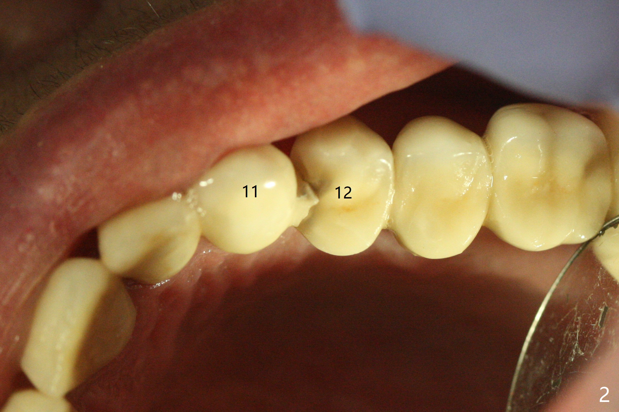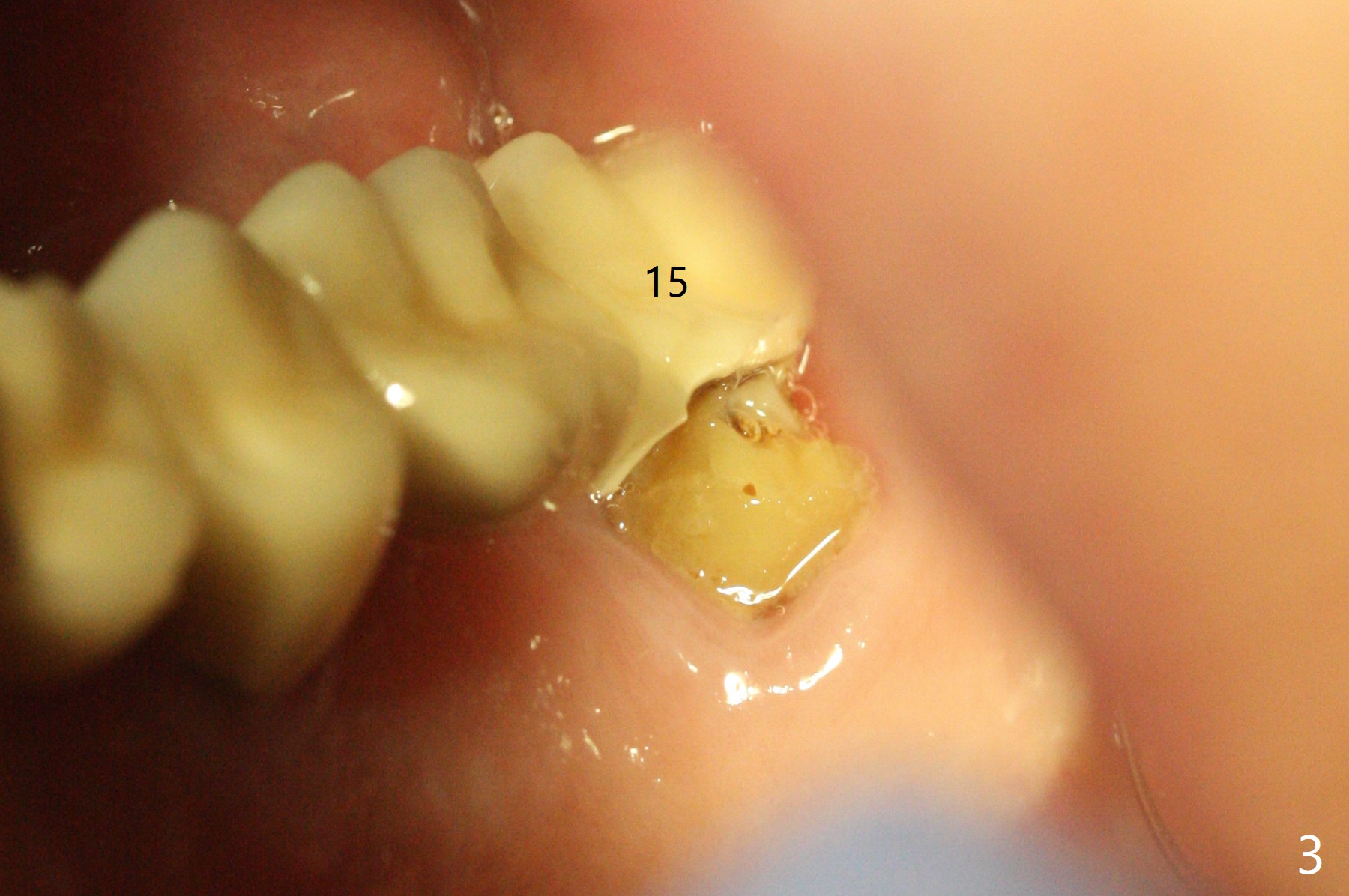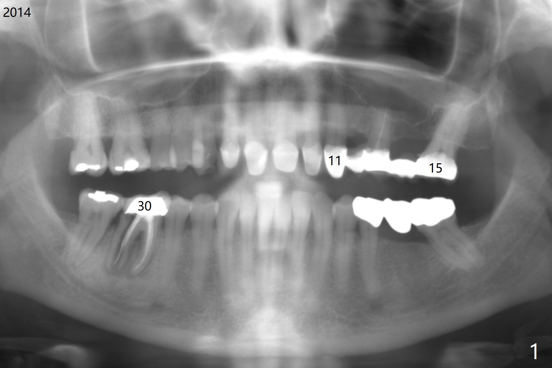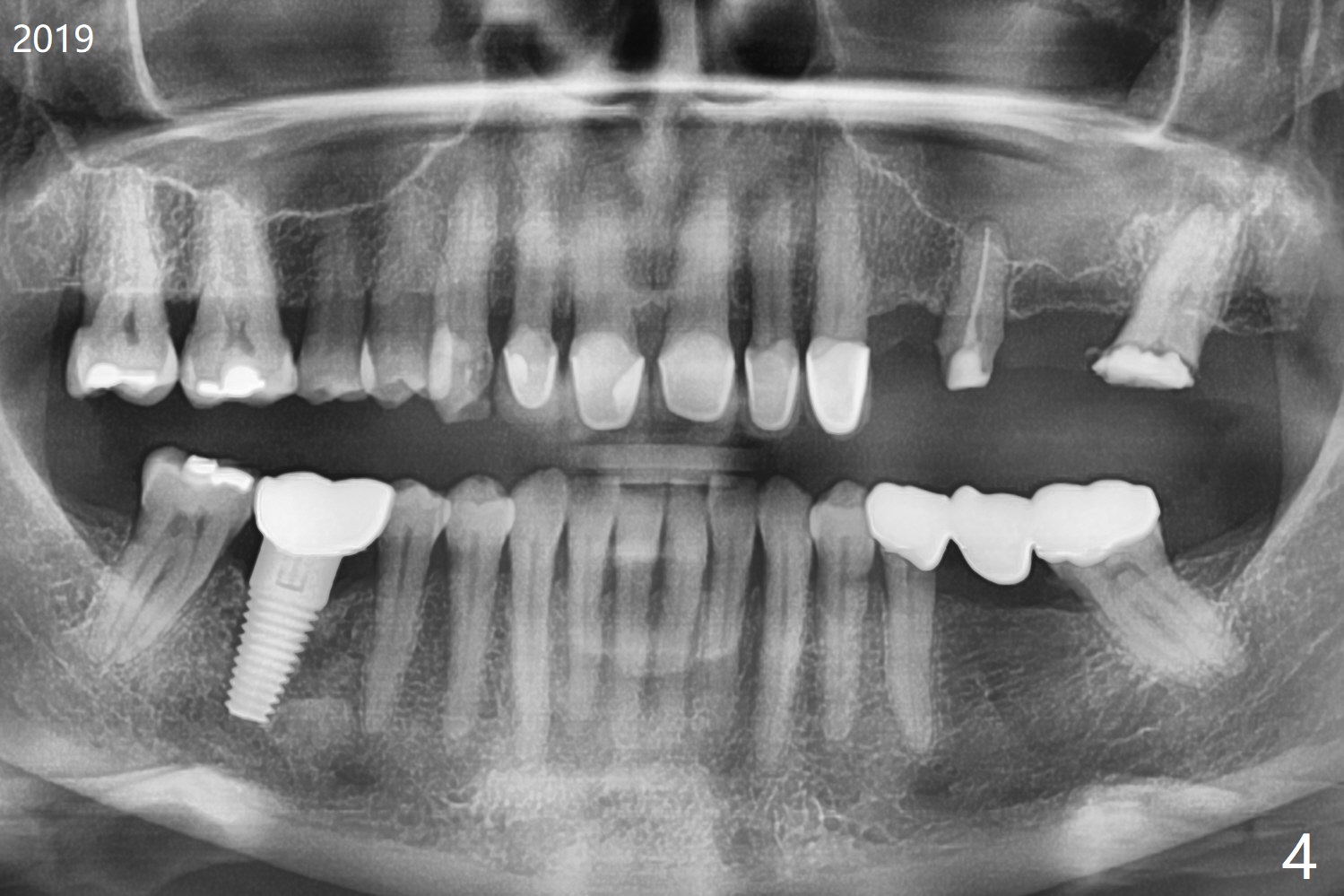 A 55-year-old woman is a bruxer (Fig.1). In 5 years the upper left FPD is fractured between #11 and 12 (Fig.2) and at #15 (Fig.3). Sectioning the FPD shows #15 non-salvageable (Fig.4). Implants will be placed at #12, 14 and 15. Sinus lift seems necessary at #14 (4 mm).