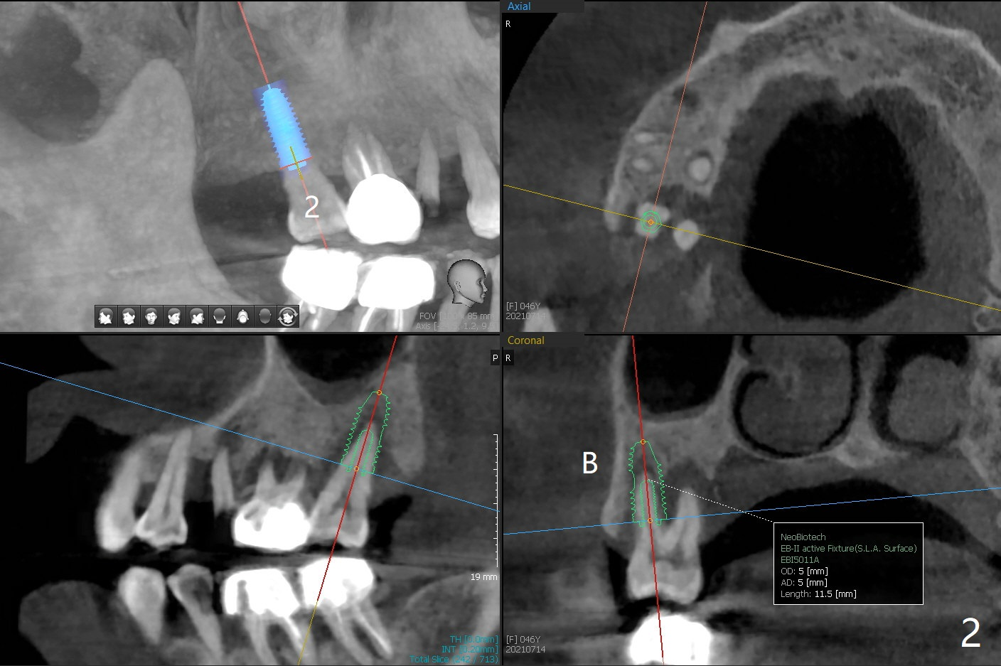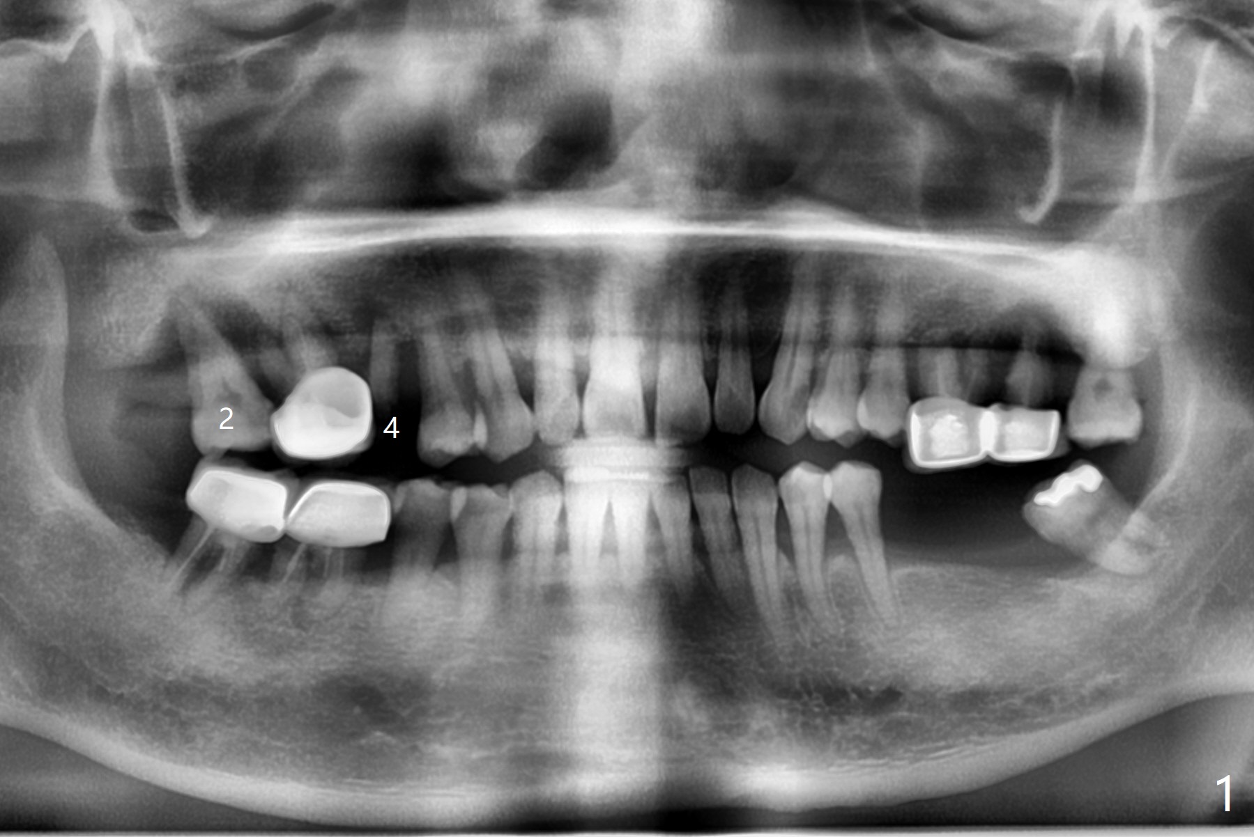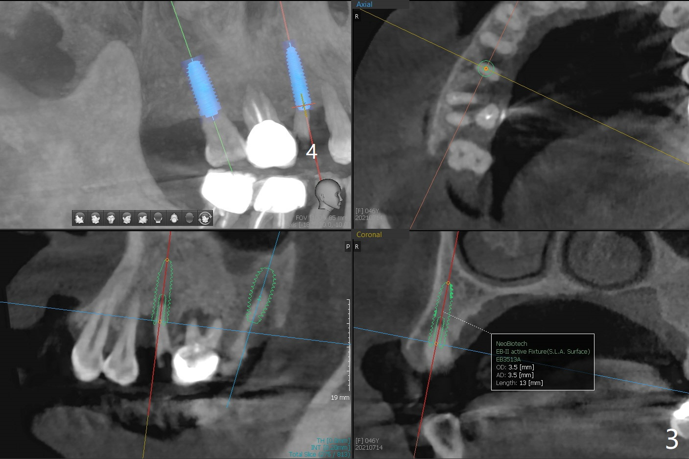 A 46-year-old woman wants to extract the mobile #2 and residual root of #4 for implants. She wants to save the tooth #3 with mobility II (Fig.1). Place an implant at #2 away from #3 (Fig.2). A small implant will be placed at #4 for the best possible trajectory (Fig.3). PRFx2.