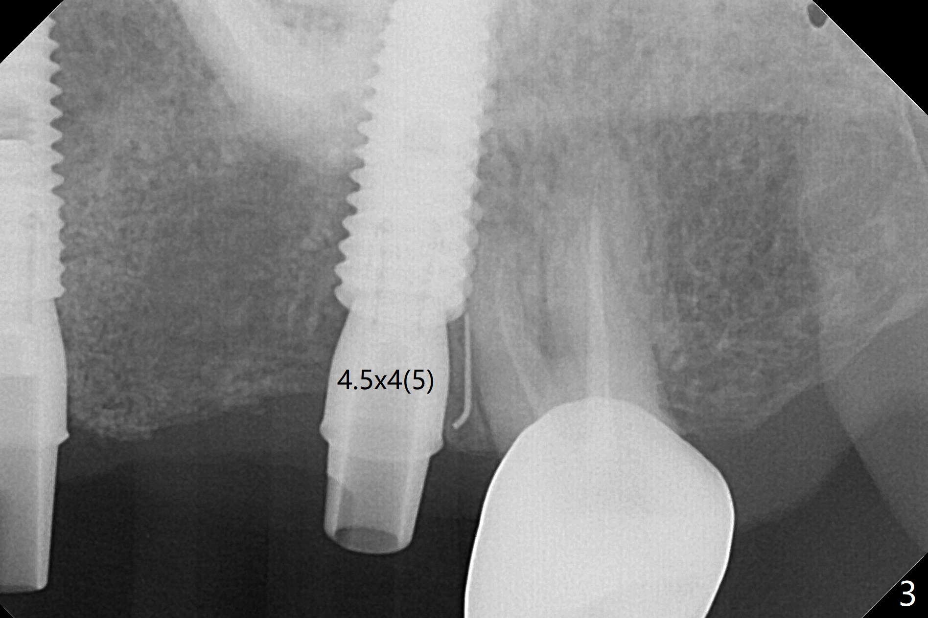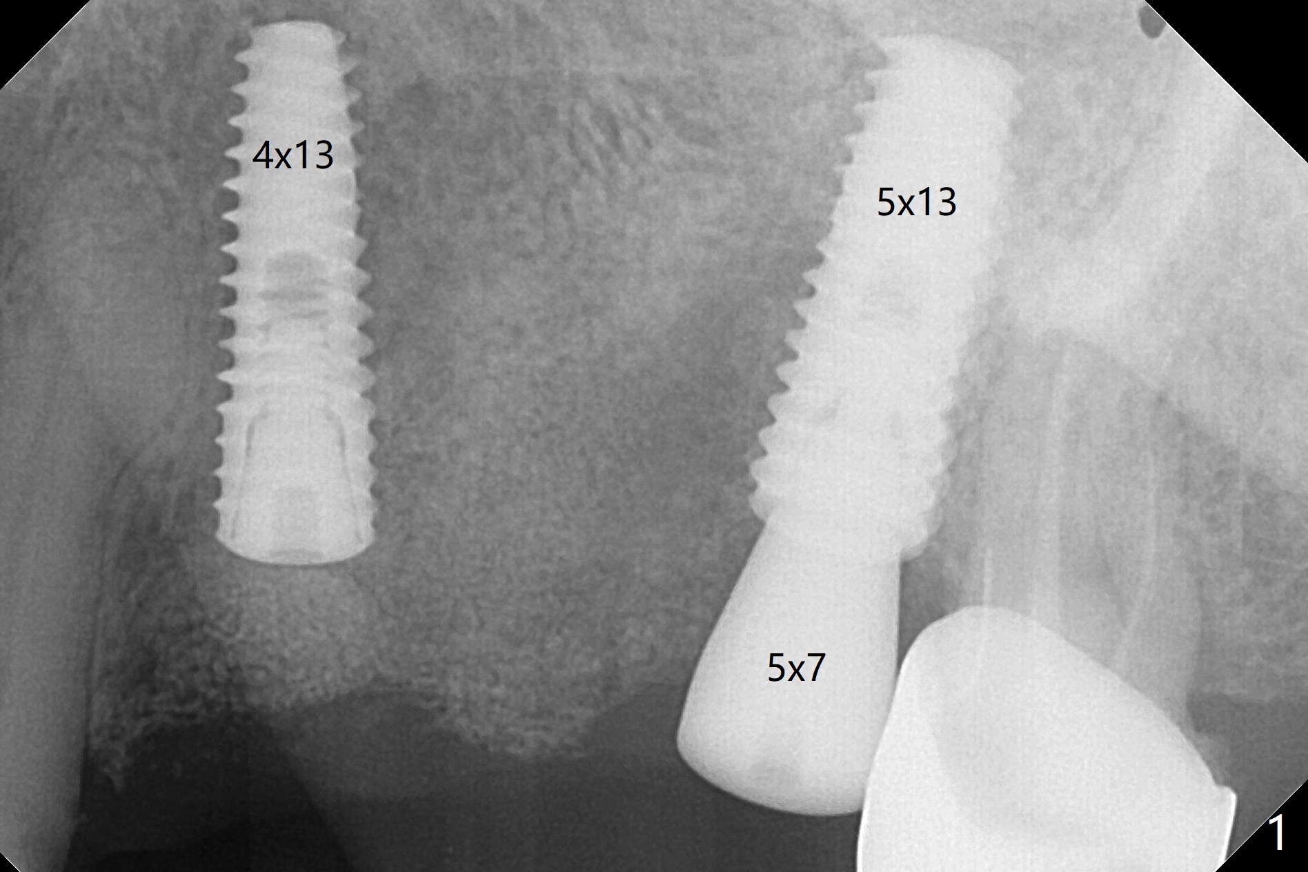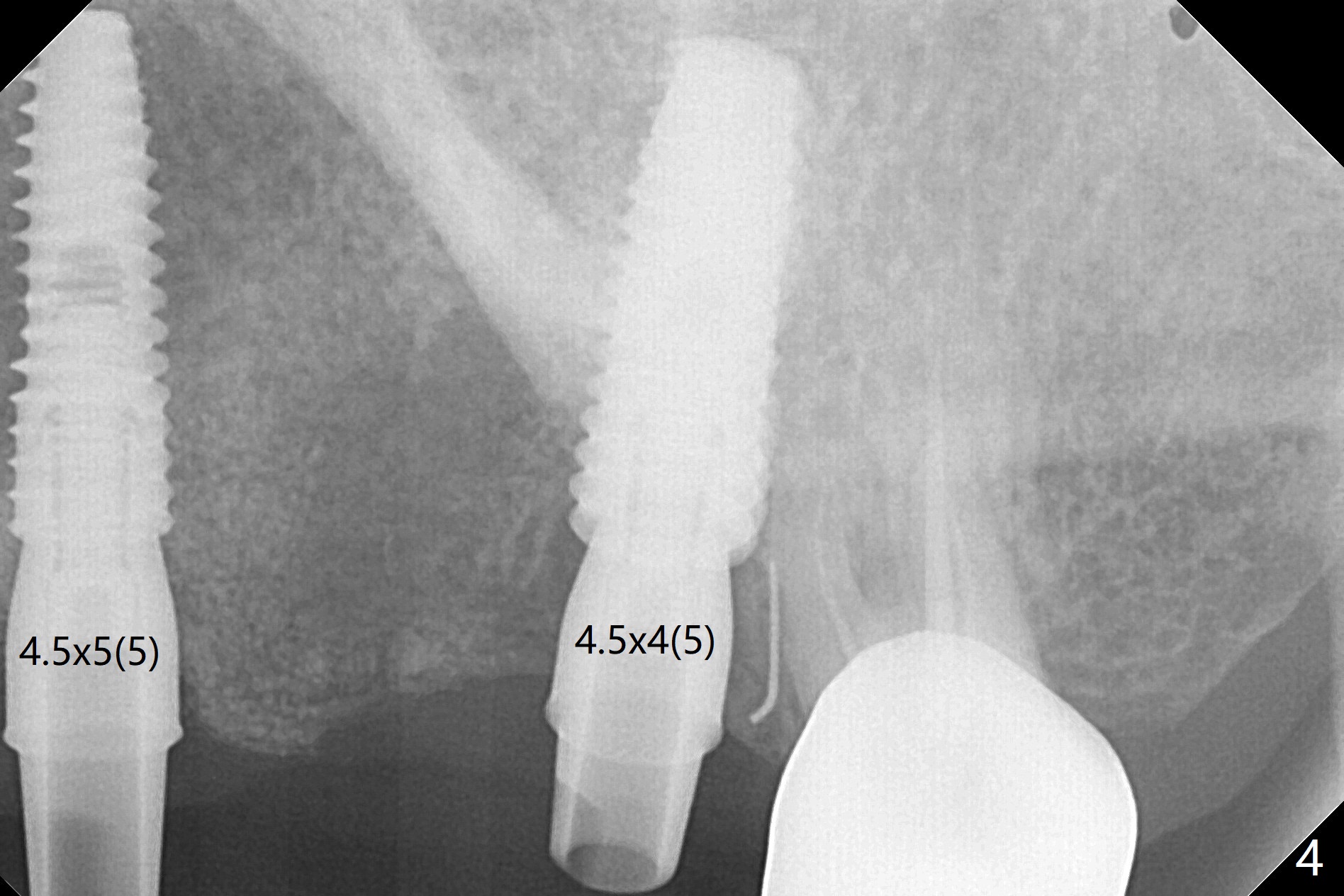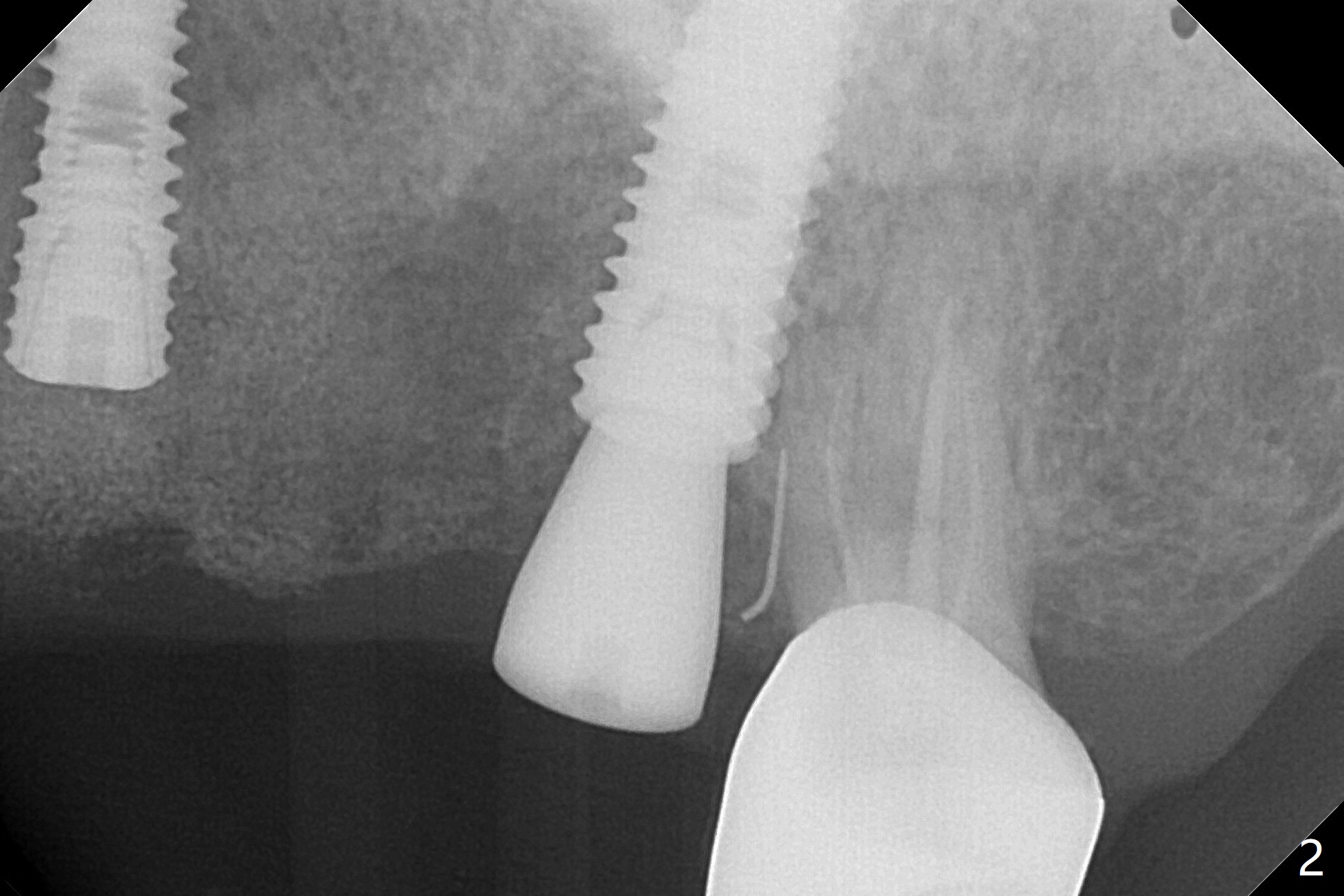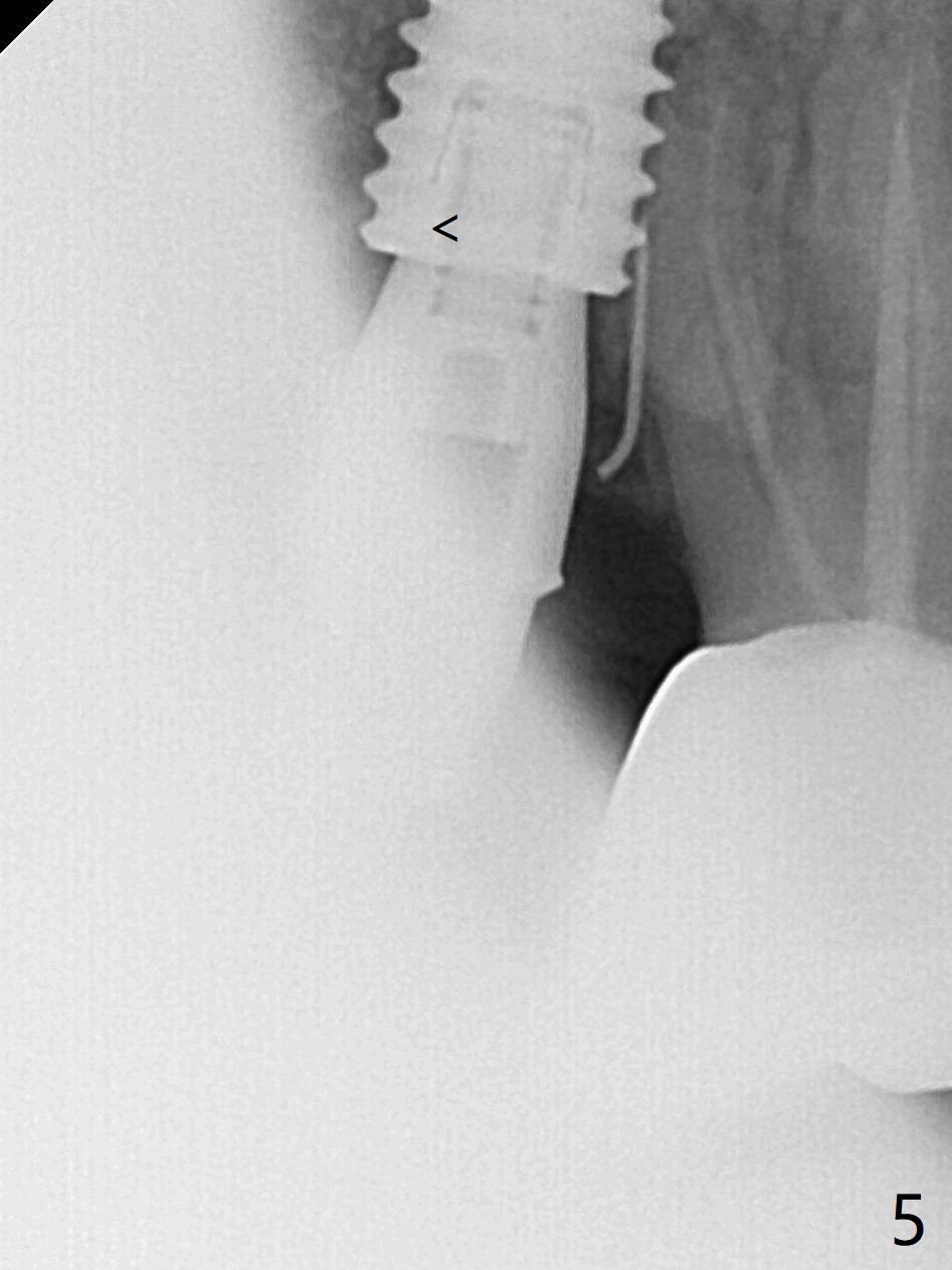 A 55-year-old woman had Hiossen implants (4x13, 5x13 mm) placed at #12 and 14 in China > 6 months (Fig.1,2). The fixtures are placed deep and un-parallel mesiodistally. After SRP UL, the implant at #12 is uncovered, followed by 4.6 and 5.5 mm profile drills and 5.5x7 mm IS healing abutment. The healing abutment at #14 is changed from 5x7 mm to 6.8x7 mm for easy impression later on. Due to coronavirus, the patient returns 8 months later. Oral hygiene is poor. The gingival cuffs at #12 and 14 are erythematous and edematous. UF cemented abutments have to be placed (Fig.3-5) because of equi-gingival fracture of #3 and 4 splinted crowns. In fact the straight abutments are not parallel buccopalatally. Buccoocclusal reduction is done at #12 for provisional FPD. SRP will be performed with #11 DL composite prior to impression.